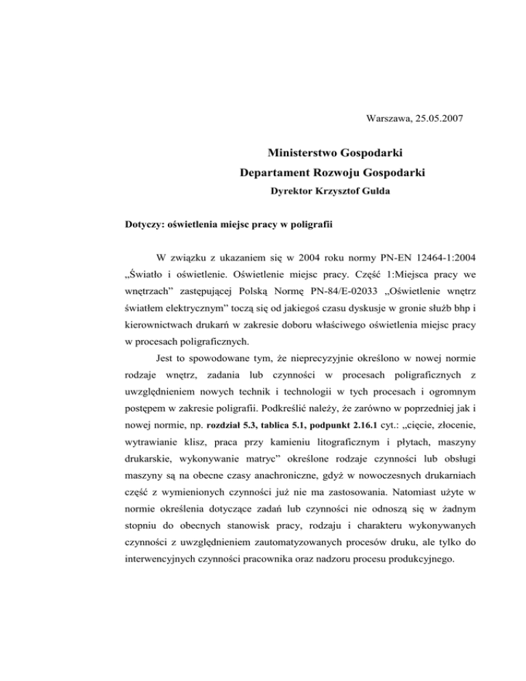 Warszawa, 25.05.2007 Ministerstwo Gospodarki Departament Rozwoju Gospodarki Dyrektor Krzysztof Gulda Dotyczy: oświetlenia miejsc pracy w poligrafii W związku z ukazaniem się w 2004 roku normy PN-EN 12464-1:2004 „Światło i oświetlenie. Oświetlenie miejsc pracy. Część 1:Miejsca pracy we wnętrzach” zastępującej Polską Normę PN-84/E-02033 „Oświetlenie wnętrz światłem elektrycznym” toczą się od jakiegoś czasu dyskusje w gronie słuŜb bhp i kierownictwach drukarń w zakresie doboru właściwego oświetlenia miejsc pracy w procesach poligraficznych. Jest to spowodowane tym, Ŝe nieprecyzyjnie określono w nowej normie rodzaje wnętrz, zadania lub czynności w procesach poligraficznych z uwzględnieniem nowych technik i technologii w tych procesach i ogromnym postępem w zakresie poligrafii. Podkreślić naleŜy, Ŝe zarówno w poprzedniej jak i nowej normie, np. rozdział 5.3, tablica 5.1, podpunkt 2.16.1 cyt.: „cięcie, złocenie, wytrawianie klisz, praca przy kamieniu litograficznym i płytach, maszyny drukarskie, wykonywanie matryc” określone rodzaje czynności lub obsługi maszyny są na obecne czasy anachroniczne, gdyŜ w nowoczesnych drukarniach część z wymienionych czynności juŜ nie ma zastosowania. Natomiast uŜyte w normie określenia dotyczące zadań lub czynności nie odnoszą się w Ŝadnym stopniu do obecnych stanowisk pracy, rodzaju i charakteru wykonywanych czynności z uwzględnieniem zautomatyzowanych procesów druku, ale tylko do interwencyjnych czynności pracownika oraz nadzoru procesu produkcyjnego. Podkreślić naleŜy, Ŝe w nowoczesnych procesach rotacyjnego druku offsetowego obszar „obsługi” maszyny jest czasami bardzo duŜy i rozległy, a miejsca wykonywania czynności obsługowych występują zarówno w dalszej jak i bliŜszej odległości od maszyny i w przestrzeniach ograniczonych, wynikających z konstrukcji maszyny, np. w przestrzeni zespołu wałków między zespołami drukowymi, gdzie oświetlenie ogólne i miejscowe maszynowe nie zapewnia natęŜenia oświetlenia określonego w cytowanych normach, pomimo, Ŝe maszyny spełniają wymagania zasadnicze i posiadają znak zgodności CE. Poza tym, w nowoczesnych technologiach czas wykonywania prac w polach zadania jest krótki w odniesieniu do dniówki roboczej i wynosi kilka, kilkanaście minut. Kolejnym istotnym problemem jest to, Ŝe praktycznie jedynym dokumentem normatywnym w zakresie wymagań oświetlenia stanowisk pracy w drukarniach jest rozporządzeniu Prezesa Rady Ministrów i Ministrów Pracy i Opieki Społecznej oraz Zdrowia z dnia 22 listopada 1951 roku, w sprawie bezpieczeństwa i higieny pracy w zakładach graficznych (Dz.U. nr 65, poz. 447; zmiany Dz.U. nr 41, poz. 285, 1952r) . Zgodnie zaś z ustawą o normalizacji (Dz.U. nr 169, poz. 1386, 2002 r.), stosowanie polskich norm jest dobrowolne. Poza tym, według Polskiego Komitetu Normalizacji, zastąpienie starej normy nową i wycofanie normy starej, nie oznacza uniewaŜnienia lub zakazu stosowania normy wycofanej. W dalszym ciągu moŜna, więc stosować normę PN-84/E-02033, mimo Ŝe została ona zastąpiona przez normę PN-EN 12464-1:2004. Dla przykładu: 1. Według wymienionego rozporządzenia, najmniejsze, wymagania oświetlenia powinno wynosić, co najmniej: - 300 lx przy pracach najbardziej obciąŜających narząd wzroku w zakładach graficznych, - 250 lx przy maszynach do składania, odbioru i kontroli odbitek z maszyn, rysowaniu, przy maszynach do cięcia itp., - 150 lx przy ręcznym i maszynowym składaniu papieru i innych pracach. 2. Według normy PN-84/E-02033, średnie natęŜenie oświetlenia na stanowiskach wykonywania prostych prac introligatorskich powinno wynosić 200 lx, przy maszynach drukarskich 300 lx, a na stanowiskach kontroli druków barwnych 1000 lx, przy zastosowaniu źródeł światła o wysokim wskaźniku oddawania i unikaniu olśnienia odbiciowego. 3. Norma PN-EN 12464-1:2004 zaleca minimalne średnie natęŜenie oświetlenia przy maszynach drukarskich i typowych pracach introligatorskich na poziomie 500 lx, a na stanowisku kontroli barw 1500 lx. 2 PoniewaŜ cytowane powyŜej rozporządzenie ma swoją odległą historię moŜna przyjąć, Ŝe określa wymagania dla procesów technologicznych charakterystycznych dla tego okresu i stosowanej techniki. Powstaje, zatem pytanie, czy jest to akt normatywny, którego wymagania powinny być spełniane w określonym w nim zakresie, przy stosowaniu nowoczesnej stale rozwijającej się technice drukarskiej. Biorąc pod uwagę powyŜsze fakty, w tym stopniowanie przytoczonych dokumentów pod względem ich waŜności, moŜna przyjąć zasadę, Ŝe parametry oświetlenia stanowisk pracy w drukarni powinny przede wszystkim spełniać wymagania zawarte w rozporządzeniu, jako obowiązującym akcie prawnym. Natomiast w miarę moŜliwości, szczególnie technicznych, z uwzględnieniem rozwiązań konstrukcyjnych maszyn, moŜna dąŜyć do uzyskania większego komfortu pracy wzrokowej, poprawy jakości i wydajności pracy, poprzez zapewnienie lepszych warunków oświetleniowych, których parametry określone są w normach oświetleniowych, (jednak nieprecyzyjnie określonych). Z punktu właściciela zakładu produkcyjnego najbardziej istotna jest ekonomika oświetlenia powiązana z wydajnością pracy. Natomiast waŜnym z punktu widzenia bezpieczeństwa i higieny pracy jest prawidłowe oświetlenie miejsca pracy, które powinno zapewnić pracownikom przede wszystkim bezpieczne, sprawne i bezbłędne jej wykonywanie, poza tym odpowiedni komfort wzrokowy, wynikający z moŜliwie łatwego, bezwysiłkowego spostrzegania koniecznych szczegółów, co nie jest to jednak precyzyjnie określone w obecnie obowiązujących aktach prawnych. Wydanie przedmiotowej normy ( 2004r) spowodowało liczne kontrole w zakładach poligraficznych inspektorów PIP, którzy nakładają bezpodstawnie kary za brak stosowania wymogów oświetleniowych w niej zapisanych. Oc