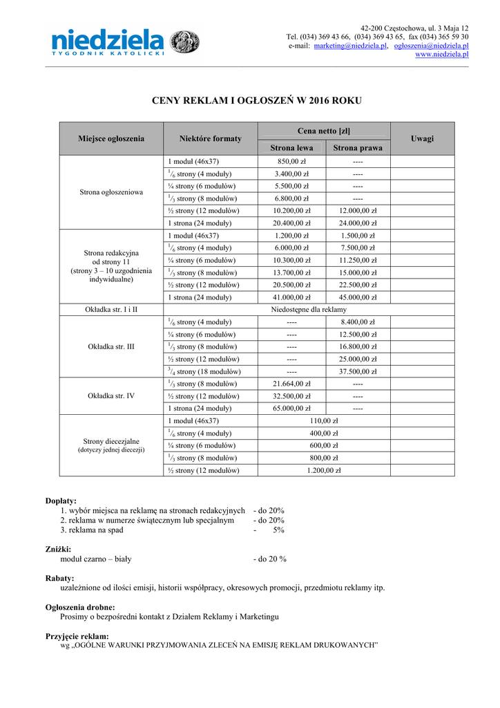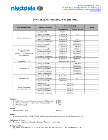 42-200 Częstochowa, ul. 3 Maja 12 Tel. (034) 369 43 66, (034) 369 43 65, fax (034) 365 59 30 e-mail: [email protected], ogł[email protected] www.niedziela.pl ________________________________________________________________________________________________________________ CENY REKLAM I OGŁOSZEŃ W 2016 ROKU Miejsce ogłoszenia Strona prawa 850,00 zł ---- /6 strony (4 moduły) 3.400,00 zł ---- ¼ strony (6 modułów) 5.500,00 zł ---- 1 /3 strony (8 modułów) 6.800,00 zł ---- ½ strony (12 modułów) 10.200,00 zł 12.000,00 zł 1 strona (24 moduły) 20.400,00 zł 24.000,00 zł 1 moduł (46x37) 1.200,00 zł 1.500,00 zł 1 /6 strony (4 moduły) 6.000,00 zł 7.500,00 zł ¼ strony (6 modułów) 10.300,00 zł 11.250,00 zł 1 /3 strony (8 modułów) 13.700,00 zł 15.000,00 zł ½ strony (12 modułów) 20.500,00 zł 22.500,00 zł 41.000,00 zł 45.000,00 zł 1 Strona redakcyjna od strony 11 (strony 3 – 10 uzgodnienia indywidualne) 1 strona (24 moduły) Okładka str. I i II Niedostępne dla reklamy 1 Okładka str. III Okładka str. IV Strony diecezjalne (dotyczy jednej diecezji) Uwagi Strona lewa 1 moduł (46x37) Strona ogłoszeniowa Cena netto [zł] Niektóre formaty /6 strony (4 moduły) ---- 8.400,00 zł ¼ strony (6 modułów) ---- 12.500,00 zł 1 /3 strony (8 modułów) ---- 16.800,00 zł ½ strony (12 modułów) ---- 25.000,00 zł 3 /4 strony (18 modułów) ---- 37.500,00 zł 1 /3 strony (8 modułów) 21.664,00 zł ---- ½ strony (12 modułów) 32.500,00 zł ---- 1 strona (24 moduły) 65.000,00 zł ---- 1 moduł (46x37) 110,00 zł 1 /6 strony (4 moduły) 400,00 zł ¼ strony (6 modułów) 600,00 zł 1 /3 strony (8 modułów) 800,00 zł ½ strony (12 modułów) 1.200,00 zł Dopłaty: 1. wybór miejsca na reklamę na stronach redakcyjnych - do 20% 2. reklama w numerze świątecznym lub specjalnym - do 20% 3. reklama na spad 5% Zniżki: moduł czarno – biały - do 20 % Rabaty: uzależnione od ilości emisji, historii współpracy, okresowych promocji, przedmiotu reklamy itp. Ogłoszenia drobne: Prosimy o bezpośredni kontakt z Działem Reklamy i Marketingu Przyjęcie reklam: wg „OGÓLNE WARUNKI PRZYJMOWANIA ZLECEŃ NA EMISJĘ REKLAM DRUKOWANYCH”