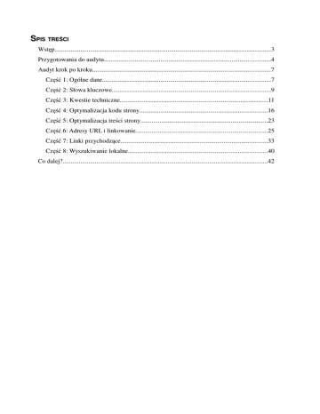 SPIS TREŚCI Wstęp......................................................................................................................................3 Przygotowania do audytu.......................................................................................................4 Audyt krok po kroku..............................................................................................................7 Część 1: Ogólne dane........................................................................................................7 Część 2: Słowa kluczowe..................................................................................................9 Część 3: Kwestie techniczne............................................................................................11 Część 4: Optymalizacja kodu strony...............................................................................16 Część 5: Optymalizacja treści strony...............................................................................23 Część 6: Adresy URL i linkowanie..................................................................................25 Część 7: Linki przychodzące...........................................................................................33 Część 8: Wyszukiwanie lokalne......................................................................................40 Co dalej?...............................................................................................................................42 – ZARABIAJ NA AUDYTACH SEO – CZĘŚĆ 7: LINKI PRZYCHODZĄCE Linki przychodzące w liczbach liczba linków przychodzących liczba domen linkujących liczba linkujących adresów IP liczba linkujących klas C cały serwis cały serwis Linki przychodzące jakość linków brak automatyzacji działań lokalizacja linków tematyczność linków zróŜnicowanie źródeł linków zróŜnicowanie domen linkujących zróŜnicowanie stron docelowych zróŜnicowanie adresów IP zróŜnicowanie rodzaju linków zróŜnicowanie sposobu osadzenia linków występowanie linków graficznych Sygnały społecznościowe połączenie strony z profilem Google+ udostępnienia w Google+ udostępnienia na Facebooku udostępnienia na Twitterze Teksty zakotwiczenia linków uŜycie słów kluczowych uŜycie nazwy firmy/serwisu uŜycie nazwy lokalizacji uŜycie innych słów Opis elementów: Linki przychodzące w liczbach liczba linków przychodzących – do dyspozycji masz kilka popularnych serwisów gromadzących dane na temat linków przychodzących. Wśród nich są m.in.: http://www.opensiteexplorer.org/ http://www.majesticseo.com/ https://ahrefs.com/ Zdecyduj się na jedno z tych narzędzi i pobierz z niego dane. To liczba prezentująca łączną liczbę backlinków. liczba domen linkujących – z wybranego narzędzia, przepisz liczbę domen linkujących (referring domains/linking root domains). To liczba prezentująca, Copyright © Marta Gryszko www.lexy.com.pl/blog/ | www.seostation.pl | www.brandle.pl 33 – ZARABIAJ NA AUDYTACH SEO – ile różnych domen linkuje do analizowanej strony, nie ma jednak znaczenia, na ilu podstronach jednej domeny wyświetlają się linki. liczba linkujących adresów IP – dość istotne jest różnicowanie adresów IP, na których znajdują się odnośniki do analizowanej strony. Im większe zróżnicowanie, tym lepiej. W przypadku gdy linki kierują w większości z tych samych adresów IP, jest to sygnał, że strony te należą do tej samej osoby i tym samym ich wartość może zostać zmniejszona. W takim przypadku oceń ten element na „-” i zaleć większe zróżnicowanie. Parametr ten będzie w większości przypadków nazwany jako referring IPs. liczba linkujących klas C – wspomniane różnicowanie linkujących adresów IP nie powinno ograniczać się do różnicowania wyłącznie w klasie D. Przykładowo, zdobywanie linków z adresów 87.98.236.148, 87.98.236.149, 87.98.236.150 różniących się tylko w ostatniej klasie, jest sygnałem wskazującym na zdobywanie odnośników ze stron tego samego właściciela. Im większe zróżnicowanie, tym lepiej. W większości wspomnianych wcześniej narzędzi, liczba różnych klas C będzie opisana jako referring subnets. Linki przychodzące jakość linków – możesz sugerować się danymi ze wspomnianych narzędzi, które oceniają jakość domeny na podstawie prowadzących do niej linków, np. za pomocą Domain Authority (OSE) albo Citation Flow i Trust Flow (Majestic SEO). Możesz jednak ograniczyć się do losowego przejrzenia niektórych linków, aby szybko zorientować się, czy prowadzone dotychczas działania są w miarę bezpieczne, czy skupiały się na linkach niskiej jakości, tworzonych głównie dla potrzeb SEO. Jeśli dotychczas nie miałeś okazji, aby samodzielnie oceniać jakość linków, kieruj się wspomnianymi wcześniej parametrami, porównując je do parametrów serwisów konkurencyjnych względem analizowanego, które mają wysokie i stabilne pozycje. Dla przykładu, jedna z moich stron, której backlinki oceniłabym bardzo nisko, ma następujące parametry: Citation Flow (Majestic SEO) – 26 Trust Flow (Majestic SEO) – 13 Domain Authority (OSE) – 16 Copyright © Marta Gryszko www.lexy.com.pl/blog/ | www.seostation.pl | www.brandle.pl 34 – ZARABIAJ NA AUDYTACH SEO – brak automatyzacji działań – żaden z analizowanych elementów nie powinien sygnalizować, że dotychczasowe działania odbywały się w sposób automatyczny, np. przy wykorzystaniu systemów wymiany linków (tzw. SWLi), bądź narzędzi automatycznie publikujących komentarze na forach i blogach. Zaleć rezygnację ze wszystkich automatycznych działań. Jeśli jednak w ich wyniku pozyskano znaczną liczbę odnośników, a ich nagła utrata mogłaby spowodować obniżenie pozycji, należy to robić stopniowo, pozyskując w tym samym czasie wartościowe odnośniki. Podczas analizy pozycji słów kl