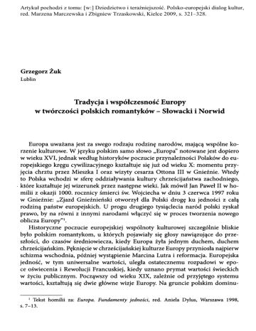 Artykuł pochodzi z tomu: [w:] Dziedzictwo i teraźniejszość. Polsko-europejski dialog kultur, red. Marzena Marczewska i Zbigniew Trzaskowski, Kielce 2009, s. 321–328. Grzegorz Zuk Lublin Tradycja i współczesność Europy w twórczości polskich romantyków - Słowacki i Norwid Europa uważana jest za swego rodzaju rodzinę narodów, mającą wspólne korzenie kulturowe. W języku polskim samo słowo "Europa" notowane jest dopiero w wieku XVI, jednak według historyków poczucie przynależności Polaków do europejskiego kręgu cywilizacyjnego kształtuje się już od wieku X: momentu przyjęcia chrztu przez Mieszka I oraz wizyty cesarza Ottona III w Gnieźnie. Wtedy to Polska wchodzi w sferę oddziaływania kultury chrześcijaństwa zachodniego, , które kształtuje jej wizerunek przez następne wieki. Jak mówił Jan Paweł II w homilii z okazji 1000. rocznicy śmierci św. Wojciecha w dniu 3 czerwca 1997 roku w Gnieźnie: "Zjazd Gnieźnieński otworzył dla Polski drogę ku jedności z całą rodziną państw europejskich. U progu drugiego tysiąclecia naród polski zyskał prawo, by na równi z innymi narodami włączyć się w proces tworzenia nowego oblicza Europy"l. Historyczne poczucie europejskiej wspólnoty kulturowej szczególnie bliskie było polskim romantykom, u których pojawiały się głosy nawiązujące do przeszłości, do czasów średniowiecza, kiedy Europa żyła jednym duchem, duchem chrześcijańskim. Pęknięcie w chrześcijańskiej kulturze Europy przyniosła najpierw schizma wschodnia, później wystąpienie Marcina Lutra i reformacja. Europejska jedność, w tym uniwersalne wartości, uległa ostatecznemu rozpadowi w epoce oświecenia i Rewolucji Francuskiej, kiedy uznano prymat wartości świeckich w życiu publicznym. Począwszy od wieku XIX, zależnie od przyjętego systemu wartości, kształtują się dwie główne wizje Europy. Na gruncie polskim dominul Tekst homilii za: Europa. Fundamenty s.7-13. jedności, red. Aniela Dylus, Warszawa 1998, 322 Grzegorz Żuk je wizja Europy chrześcijańskiej. Odwołują się do niej polscy poeci romantyczni, którzy, mimo wielu elementów wspólnych, pozostawiają w swojej twórczości również rysy specyficznego postrzegania spraw europejskich - z perspektywy polskiej i z perspektywy europejskiej. Obie perspektywy starają się uwzględnić Juliusz Sło wacki i Cyprian Kamil Norwid. W artykule zajmę się porównaniem wybranych aspektów z tematyki europejskiej w poezji obu romantyków. O tym, że zestawienie twórczości Słowackiego i Norwida może przynieść ciekawe efekty przekonany jest Włodzimierz Szturc, który we wstępie do książki Archeologia wyobraźni. Szkice o Słowackim i Norwidzie pisze: "Autorowi zależało na swego rodzaju paralelnym zestawieniu «strony Słowackiego» i «strony Norwida». Słowacki był Dandysem i Europejczykiem, który pewnego razu doznał objawienia. Norwid bywał dandysem, ale przede wszystkim był Don Kichotern, wcale nie naśladując pierwowzoru. Na każdej ze "stron" odnajdujemy ten sam alfabet, ale zapisywany różnymi charakterami liter, różnymi czcionkami, lecz przez jednego zecera składany"2. Europa Słowackiego Tęsknotę za utraconą jednością Europy wyraża Słowacki we fragmencie Ody do wolności (1830), utworu napisanego z okazji wybuchu Powstania Listopadowego. Polska, niegdyś tak ważny element cywilizacji europejskiej, pozostaje osamotniona, wystawiona na żer zaborców. Poeta powraca do czasów średniowiecza, kiedy granice Europy były tożsame z granicami zachodniego chrześcijaństwa, przedstawiając metaforyczną wizję Europy jako kościoła. Domeną źródłową jest tu kościół, obiekt stanowiący źródło podobieństwa, domena docelową Europa - to ona przyjmuje cechy charakterystyczne dla gotyckiej świątyni, jest w jakimś sensie do niej podobna. Niegdyś Europa cała gotyckim kościołem. Wiara kolumny związała, Gmach nieba roztrącał czołem ... 3 Była Doskonałość i wszechstronny charakter średniowiecznej budowli sakralnej symbolizuje zapewne doskonałość Europy tamtych czasów. Kościół wieków śred nich był, oprócz pełnienia swojej podstawowej funkcji liturgicznej, także azylem wolności, miejscem realizacji chrześcijańskiej zasady miłosierdzia (tutaj gromadzili się po jałmużnę żebracy), twierdzą obronną w czasie zagrożenia. Bliska śre dniowiecznej Europie była zasada solidaryzmu - między grupami społecznymi i między narodami - wspierano biednych oraz państwa, które powstrzymywały Kraków 2001, s. 7. Juliusz Słowacki, Dzieła wybrane, oprac. Julian Krzyżanowski, t. 1, Liryki i powieści poetyckie, Wrocław-Warszawa-Kraków-Gdańsk 1983, s. 9. 2 3 Tradycja i współczesność Europy w twórczości polskich romantyków... 323 najazdy ludów azjatyckich na nasz kontynent. Świątynia jako centrum edukacji i życia kulturalnego była uosobieniem wręcz ponadczasowych wartości. Trwałość i potęga kościoła gotyckiego, położonego w centrum miasta i górującego nad okolicą, została wykorzystana w zbudowanej przez Słowackiego metaforze. Europa stanowiła centrum świata, stąd kultura promieniowała na inne kontynenty. Świą tynia gotycka stanowiła szczyt osiągnięć architektonicznych człowieka średnio wiecza, osiągnięć opartych na dokonaniach geometrycznych, jak np. konstrukcja sklepienia krzyżowo-żebrowego. Przemyślana budowa takiej świątyni podkreślała znaczenie każdego z elementów, przy braku któregokolwiek z nich świątynia by runęła. Taką świątynią była Europa, tworzyły ją różne narody jako elementy wspaniałej budowli sakralnej. W słowach "wiara kolumny wiązałi' Słowacki podkreśla rolę religii chrześcijańskiej w budowaniu tego metaforycznie rozumianego europejskiego gmachu. Wspólna religia łączyła ludzi i narody, decydowała o jedności całego kontynentu. Dzięki temu Europa tworzyła wspólnotę narodów wiernych Bogu i równych wobec Bog