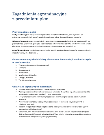 Zagadnienia egzaminacyjne z przedmiotu pkm Przypomnienie pojęć Cechy konstrukcyjne – to są wielkości potrzebne do wykonania obiektu, czyli wymiary i ich tolerancje, materiały i ich postać oraz informacje potrzebne do prawidłowego montażu Własności konstrukcyjne – są to wielkości potrzebne do użytkowania (ogólnie: do eksploatacji), na przykład moc, sprawność, gabaryty, niezawodność, całkowita masa obiektu, koszt wykonania, koszty eksploatacji, parametry energii zasilania, dopuszczalna temperatura pracy itd., itp. Postać konstrukcyjna – pojęcie rozmyte,o kreśla sposób współdziałania elementów konstrukcyjnych, ukształtowanie, ideę działania, … Omówione na wykładzie klasy elementów konstrukcji mechanicznych w mechatronice 1. 2. 3. 4. 5. 6. 7. Wyznaczanie naprężeń dopuszczalnych Sprężyny Ułożyskowania Przekładnie Mechanizmy bistabilne Sprzęgła, hamulce Tłumiki, amortyzatory Omawiane aspekty tych elementów Przeznaczenie (do czego służy) , charakterystyka danej klasy Wymagania (konkretne wielkości opisujące własności danej klasy (np. dla przekładni jest to przełożenie, maksymalna prędkość i moc, gabaryty itd.) Spotykane rozwiązania konstrukcyjne (postacie konstrukcyjne): szkice, z zachowaniem proporcji! Porównanie własności poszczególnych postaci (np. porównanie łożysk ślizgowych z łożyskami tocznymi) Na czym polega eksploatacja urządzeń danej klasy (np.: jakich czynności eksploatacyjnych wymagają przekładnie cierne) Obliczenia: jakie właściwości można obliczyć? Jakie istnieją związki (czy zależności) między (którymi) cechami i (którymi) właściwościami? (np. między którymi wymiarami i parametrami materiałowymi a sztywnością sprężyny śrubowej) Przykłady pytań 1. 2. 3. 4. 5. 6. 7. 8. 9. 10. 11. 12. 13. 14. 15. 16. 17. 18. 19. 20. 21. 22. 23. 24. 25. 26. 27. 28. Jaki jest związek między Rm lub Re a naprężeniami dopuszczalnymi? Co to jest histereza materiałowa? Jak ją wyznaczyć? Przyczyny histerezy charakterystyki sprężyny (materiał, utwierdzenie) Natura konfliktu (sprzeczność) między wymaganiem małego gabarytu i dużej sprawności przy konstruowaniu przekładni zębatej Co to znaczy, że przełożenie przekładni zębatej o zarysie ewolwentowym jest stałe Kiedy przekładnia zębata z kołami walcowymi może być samohamowna? Jeki jest związek między sprawnością i momentem tarcia przekładni? Dlaczego stosunek średnicy drutu do średnicy sprężyny śrubowej jest ograniczony? Jak wyznaczyć energię potencjalną sprężyny Dlaczego mocowanie sprężyny musi być ‘dokręcone’ ? Wymagania stawiane materiałom na sprężyny Naszkicuj sprężynę określonego typu Rola smaru w łożysku Co to jest tarcie hydrodynamiczne? Dobór materiału na panewki Dobór materiału na czop łożyska ślizgowego Naszkicuj jakieś łożysko bez tarcia suchego Naszkicuj wybrany typ łożyska Związek między momentem tarcia i sprawnością przekładni Dlaczego zależy na dużej sprawności przekładni? Daj przykład Porównaj dwa lub trzy typy przekładni (jakie własności lepsze, jakie gorsze) Samohamowność przekładni – czy to wada, czy zaleta; kiedy? Przyczyny hałasu (drgań) przekładni, łożysk Warunek bistabilności mechanizmu bistabilnego Jak można zmienić współczynnik tłumienia amortyzatora? Jak można wykonać koło zębate? Naszkicuj planetarną przekładnię różnicową i objaśnij jej działanie Przełożenie przekładni falowej
