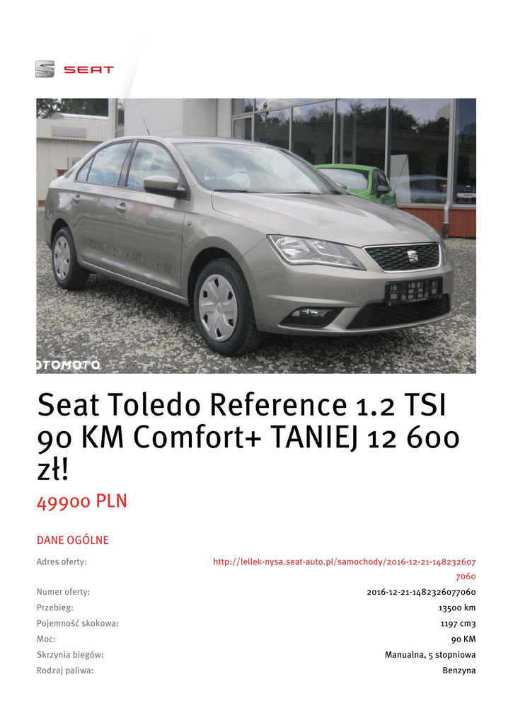 Seat Toledo Reference 1.2 TSI 90 KM Comfort+ TANIEJ 12 600 zł! 49900 PLN DANE OGÓLNE Adres oferty: http://lellek-nysa.seat-auto.pl/samochody/2016-12-21-148232607 7060 Numer oferty: 2016-12-21-1482326077060 Przebieg: 13500 km Pojemność skokowa: 1197 cm3 Moc: Skrzynia biegów: Rodzaj paliwa: 90 KM Manualna, 5 stopniowa Benzyna Nadwozie: Liftback Liczba drzwi: 5 Liczba miejsc: 5 Kolor: beżowy Rok produkcji: 2015 WYPOSAŻENIE / ABS / ASR (kontrola trakcji) / Bluetooth / Czujniki parkowania tylne / Elektryczne szyby tylne / ESP (stabilizacja toru jazdy) / Gniazdo AUX / Gniazdo USB / Isofix / Komputer pokładowy / Podgrzewane lusterka boczne / Poduszka powietrzna kierowcy / Poduszka powietrzna pasażera / Poduszki boczne przednie / Radio fabryczne / Światła do jazdy dziennej / Światła przeciwmgielne / Tapicerka welurowa / Tempomat / Wielofunkcyjna kierownica / Wspomaganie kierownicy OPIS 4 LATA GWARANCJI SEAT - Data I rejestracji - kwiecień 2016! SAMOCHÓD DOSTĘPNY:"OD RĘKI" Wyposażenie dodatkowe: - Pakiet COMFORT+ dla wersji Reference: Czujniki parkowania z tyłu; Media System Colour: 5-calowy kolorowy ekran dotykowy, Radio, Złącza USB, SD, Aux-in, 6 głośników, Bluetooth; Pakiet Comfort Drive (Tempomat, System wykrywania zmęczenia, przednie światła przeciwmgielne z funkcją doświetlenia zakrętów); Wielofunkcyjna skórzana kierownica i gałka zmiany biegów; Elektryczne sterowane szyby z tyłu - Pakiet schowków: Podłokietnik z przodu i z tyłu, siatka z oczkami do mocowania w bagażniku, wieszaki w bagażniku, boczne schowki w bagażniku - Centralny zagłówek z tyłu - Wycieraczka tylnej szyby - Hamulce tarczowe z tyłu - Lakier metalizowany Wyposażenie standardowe wersji REFERENCE: ABS + migające światła „stopu” ESC, EBA, system kontroli ciśnienia powietrza w oponach ze wskaźnikiem ostrzegawczym Poduszka powietrzna kierowcy Asystent Podjazdu Poduszka powietrzna pasażera + poduszka boczna z przodu + system dezaktywacji poduszki pasażera + system przypominający o zapięciu pasów (kierowcy i pasażera) Kurtyna boczna Zaczepy iSOFIX do mocowania fotelika z Top Tether (górny pasek mocujący) 15-calowe felgi stalowe Urban 21/1 Pełnowymiarowe, 15-calowe koło zapasowe (dostępne tylko z 15-calowymi felgami stalowymi) Elektrycznie sterowane i podgrzewane lusterka Zawieszenie typu COMFORT Światła do jazdy dziennej Elektrycznie sterowane szyby boczne z przodu Komputer pokładowy Centralny zamek ze zdalnym sterowaniem Kierownica wielofunkcyjna Fotel kierowcy z regulacją wysokości Składana, dzielona tylna kanapa SPRZEDAŻ POJAZDU FAKTURĄ VAT 23% -MOŻLIWOŚĆ LEASINGU Do każdego samochodu oferujemy Państwu bardzo korzystne formy FINANSOWANIA (kredyt, leasing) oraz możliwość UBEZPIECZENIA samochodu na preferencyjnych warunkach Informacja nie stanowi oferty w rozumieniu art. 66 Kodeksu Cywilnego. Podane dane mają charakter wyłącznie informacyjny. Pełna informacja dostępna jest u handlowca. Sprzedający nie odpowiada za ewentualne błędy lub nieaktualność ogłoszenia.