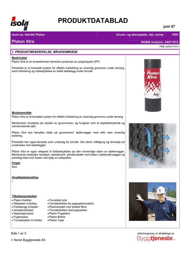 PRODUKTDATABLAD juni 07 Isola as, fabrikk Platon Grunn- og drensplate, rist, renne Platon Xtra 1005 NOBB modulnr. 24471013 PRE-m24471013 1. PRODUKTBESKRIVELSE, BRUKSOMRÅDE Beskrivelse Platon Xtra er en knasteformet membran produsert av polypropylen (PP). Produktet er et komplett system for effektiv fuktsikring av utvendig grunnmur under terreng, samt fuktsikring og rotbeskyttelse av asfalt takbelegg under torvtak. Bruksområde Platon Xtra er et komplett system for effektiv fuktsikring av utvendig grunnmur under terreng. Membranen monteres på utsiden av grunnmuren, og fungerer som et kapillærbrytende og vannavvisende sjikt. Platon Xtra kan benyttes både på grunnmurer/ kjellervegger med eller uten utvendig isolering. Produktet kan også benyttes som underlag for torvtak. Det sikrer lufttilgang og drenasje på undersiden mot takbelegget. Platon Xtra er også velegnet til fuktbeskyttelse på den innvendige siden av kjellervegger. Membranen beskytter isolasjon, stenderverk, paneler/plater mot fukten i kjellerytterveggen og samtidig leder bort fukten ved hjelp av luftspalten. Farger Sort. Overflatebehandling Tilbehørsprodukter • Platon Kantlist. • Stålspiker m/brikke. • Festeplugg m/spiker • Isolasjonsholder. • Separasjonsduk. • Fugemasse • Torvtakspiker m/ brikke Side 1 av 3 © Norsk Byggtjeneste AS • Torvstokk krok • Torvtaksbrikke for pappspikermaskin • Pipemansjett med dobbel flens • Torvtaksbrikke med pappspiker • Platon Fugebånd • Platon Brikke • Platon Tape Informasjonen er tilrettelagt av PRODUKTDATABLAD juni 07 Isola as, fabrikk Platon Grunn- og drensplate, rist, renne Platon Xtra 1005 NOBB modulnr. 24471013 PRE-m24471013 2. MÅLANGIVELSER / TEKNISKE DATA Egenskap: Verdi: Råstoff Polypropylen (PP) Platetykkelse Nominell 0,53 mm Vekt 0,48 kg/m² Knastehøyde (netto) Ca. 7 mm Kanaldimensjon Nominell 3 x 6 mm (h x b) Vanndampmotstand 1600 m².s.GPa/kg Luftvolum 4,5 liter/m² Lineær varmeutvidelse koeffisient 0,18 mm/m°C Varmemotstand 0,12 m2.°C/W Vanntetthet Motstår 200 mm vannsøyle. Dimensjoner 1,00 x 20 m 1,65 x 20 m 2,00 x 20 m 2,40 x 20 m Grunnlag for beregning av bygningers energi- og effektbehov Ikke relevant. 3. MONTERING/UTFØRELSE NS 3420-kode for utførelse S24.31 Vannavvisende sjikt av belegg på rull. NS 3451-kode for bygningsdel 222 Vegger mot grunn. 232 Taktekning og membraner. Referanse til NBI byggdetaljer 514.221 Fuktsikring av bygninger. 544.803 Torvtak. Øvrige henvisninger Se monteringsanvisning. Transport og lagring Ruller med Platon Xtra bør lagres stående i uåpnet emballasje. 4. AVFALLSBEHANDLING IHT. NS 9431 / EMBALLASJE Kode for avfallsbehandling 1799 | 1000 | 0600 | _ _ _ _ Type emballasje Plast. Side 2 av 3 © Norsk Byggtjeneste AS Informasjonen er tilrettelagt av PRODUKTDATABLAD juni 07 Isola as, fabrikk Platon Grunn- og drensplate, rist, renne Platon Xtra 1005 NOBB modulnr. 24471013 PRE-m24471013 5. HMS-REFERANSER Se HMS-FAKTA angående henvisninger til Arbeidstilsynets publikasjoner. Karakterer i henhold til miljødatabasen ECOproduct Ikke beregnet. Spesielle tiltak ved brannslokking, temperatur- og/eller fuktendringer etc. Se HMS-FAKTA. 6. PRODUKTDOKUMENTASJONER OG OFFENTLIGE KRAV Produktgodkjenninger utstedt av akkrediterte kontrollorganer SINTEF Byggforsk, 2258(utvendig grunnmur/ torvtak). Teknisk godkjenning eventuelt sertifikat fra NBI kan lastes ned fra: http://www.byggforsk.no Europeisk standard (grunnlag for CE-merking) Platon Xtra er CE merket ihht. EN 13967 og EN13984. System for samsvarsattestering (AoC) Bruksområde(r): Grupper/Klasser: Samsvarssystem nr.: Øvrige nasjonale/internasjonale kontrollordninger, sertifikater, bransjenormer etc. Sverige: Swedcert Typgodkännandebevis nr. 0506. Finland: VTT Sertifikaat nr. 147/01. Overvåkende kontroll av Platon Xtra gjennomføres ihht. FPC sertifikater, SINTEF Byggforsk NPS 1196 og NPS 1197 og på vegne av utstederne av foreliggende tekniske godkjenninger. Isola as, fabrikk Platon er sertifisert iht. kravene i NS-EN ISO 9001:2000. 7. ANSVARLIG FIRMA Produsent/importør Isola as, fabrikk Platon Organisasjonsnr. NO 928 764 745 MVA Adresse Lienfossveien 5 Postnr. og poststed 3678 Notodden Telefon 35 57 57 00 Telefaks 35 55 48 44 E-post [email protected] Internettadresse www.isola.no Afs / 6.4.4 Side 3 av 3 © Norsk Byggtjeneste AS R127/G19/B153 Erstatter datablad datert desember 2004 Informasjonen er tilrettelagt av