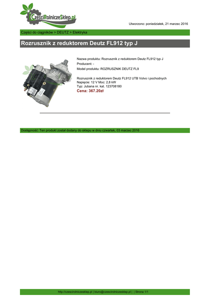 Utworzono: poniedziałek, 21 marzec 2016 Części do ciągników > DEUTZ > Elektryka Rozrusznik z reduktorem Deutz FL912 typ J Nazwa produktu: Rozrusznik z reduktorem Deutz FL912 typ J Producent: Model produktu: ROZRUSZNIK DEUTZ FL9 Rozrusznik z reduktorem Deutz FL912 UTB Volvo i pochodnych Napięcie: 12 V Moc: 2,8 kW Typ: Jubana nr. kat. 123708180 Cena: 367.20zł Dostępność: Ten produkt został dodany do sklepu w dniu czwartek, 03 marzec 2016 http://czescirolniczesklep.pl | [email protected] | | Strona 1/1