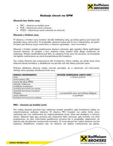 Rodzaje zleceń na GPW Zlecenia bez limitu ceny: PKC – zlecenie po każdej cenie PCR – zlecenie po cenie rynkowej PCRO – zlecenie po cenie rynkowej na otwarcie Zlecenie z limitem ceny W zleceniu z limitem ceny Inwestor określa dokładną cenę, po jakiej gotowy jest kupić lub sprzedać dany instrument. W przypadku zlecenia kupna jest to kurs maksymalny, po jakim Inwestor jest skłonny kupić instrument, w zleceniu sprzedaży - cena minimalna. Zlecenie z limitem zostaje zrealizowane dopiero wówczas, gdy napotka ofertę spełniającą warunki zlecenia. W związku z tym, zlecenie może czasem dość długo oczekiwać na realizację. Wartym podkreślenia jest fakt, że ustalenie limitu ceny nie oznacza, że transakcja nie będzie zrealizowana po cenie korzystniejszej dla Inwestora. Ten rodzaj zlecenia jest przeznaczony dla Inwestorów, którzy wiedzą, po jakiej cenie chcą dokonać danej transakcji, a dodatkowo nie jest dla nich tak istotny priorytet czasu. Podczas składania zlecenia należy również pamiętać, że w zależności od instrumentu istnieją różne sposoby określania limitu ceny: RODZAJ INSTRUMENTU akcje prawa poboru (PP) SPOSÓB OKREŚLENIA LIMITU CENY w złotych polskich prawa do akcji (PDA) jednostki indeksowe certyfikaty inwestycyjne kontrakty terminowe (na waluty) kontrakty terminowe (na akcje) obligacje opcje indeksowe kontrakty terminowe (na indeksy) w procentach ceny nominalnej obligacji w punktach PKC – zlecenie po każdej cenie Ten rodzaj zlecenia powinien być wybierany przede wszystkim, gdy Inwestorowi zależy na natychmiastowej realizacji zlecenia. W zleceniu PKC Inwestor nie ustala limitu ceny, natomiast jest ono realizowane po najkorzystniejszej cenie, która jest dostępna w arkuszu zleceń. Zlecenia tego typu powinny być stosowane tylko wówczas, gdy Inwestor ma silne przekonanie, że ceny instrumentu gwałtownie wzrosną lub w przypadku wątpliwości, że później uda się dokonać zamierzonej transakcji. W innej sytuacji ten rodzaj zlecenia nie jest zalecany. Dodatkowo możliwe jest, że zlecenie nie będzie zrealizowane po jednej, najkorzystniejszej cenie. Wtedy transakcja zostanie dokonana przy kilku różnych (coraz mniej korzystnych) cenach. PRZYKŁAD Inwestor składa zlecenie kupna na 2500 akcji spółki „A” – jest przekonany o gwałtownym wzroście cen akcji, dlatego zależy mu na szybkiej realizacji – składa zatem zlecenie PKC. Arkusz zleceń przed transakcją wygląda następująco: liczba zleceń kupna 3 5 2 1 wolumen kupna limity kupna limity sprzedaży wolumen sprzedaży 1150 2300 560 50 23,35 23,30 23,13 22,90 23,50 23,79 23,90 24,10 1500 900 500 2653 liczba zleceń sprzedaży 4 2 2 3 Ponieważ Inwestor złożył zlecenie PKC, transakcja dokona się natychmiast – dokona on zakupu 2500 akcji spółki „A”, z czego: 1500 akcji po 23,50; 900 akcji po 23,79 oraz 100 akcji po 23,90. Jak nietrudno zauważyć, Inwestor musiał zapłacić coraz więcej za kolejne akcje. Gdyby złożył zlecenie z limitem ceny, a jego przewidywania dotyczące wzrostu ich wartości potwierdziłby się, mógłby nie zdążyć zakupić akcji na czas. Po tej transakcji arkusz zleceń będzie wyglądał jak poniżej: liczba zleceń kupna 3 5 2 1 wolumen kupna limity kupna limity sprzedaży wolumen sprzedaży 1150 2300 560 50 23,35 23,30 23,13 22,90 23,90 24,10 400 2653 liczba zleceń sprzedaży 1 3 PCR – zlecenie po cenie rynkowej Działanie tego zlecenia jest podobne do zlecenia PKC. Zlecenie po cenie rynkowej wywołuje transakcję po najlepszej dostępnej cenie, a jeśli po tej cenie nie ma wystarczającej liczby dostępnych akcji, zlecenie zostaje zapisane z taką ceną w arkuszu zleceń i oczekuje na przeciwną stronę transakcji. Zlecenie PCR jest zatem bezpieczniejsze od PKC dla Inwestora, gdyż nie jest on narażony na zakup lub sprzedaż po coraz mniej korzystnych cenach. Jeżeli Inwestor chce mieć jednak pewność co do natychmiastowej realizacji powinien zastosować zlecenie PKC. PRZYKŁAD Inwestor chce kupić 2000 akcji spółki „A” – tym razem decyduje się na złożenie zlecenia PCR. Dla lepszego zobrazowania różnicy pomiędzy zleceniem PKC a PCR, arkusz zleceń wygląda tak samo jak w poprzednim przykładzie: liczba zleceń kupna 3 5 2 1 wolumen kupna limity kupna limity sprzedaży wolumen sprzedaży 1150 2300 560 50 23,35 23,30 23,13 22,90 23,50 23,79 23,90 24,10 1500 900 500 2653 liczba zleceń sprzedaży 4 2 2 3 Inwestor złożył zlecenie PCR, więc transakcja zostanie dokonana po najlepszej cenie rynkowej. W arkuszu zleceń nie ma wystarczającej liczby akcji do sprzedaży po kursie 23,50 (najlepszej obecnie ofercie rynkowej, po której Inwestor może zakupić akcje), dlatego zlecenie nie zostanie wykonane w całości – jego pozostała część zostanie zapisana w arkuszu zleceń. Po transakcji arkusz zleceń przyjmie następującą formę: liczba zleceń kupna 1 3 5 2 1 wolumen kupna limity kupna limity sprzedaży wolumen sprzedaży 500 1150 2300 560 50 23,50 23,35 23,30 23,13 22,90 23,79 23,90 24,10 900 500 2653 liczba zleceń sprzedaży 2 2 3 PCRO – zlecenie po cenie rynkowej na otwarcie Zlecenie PCRO działa w sposób identyczny ze zleceniem PCR z jednym tylko wyjątkiem – kurs transakcji to tym razem jeden z poniżej wymienionych kursów: kurs otwarcia kurs zamknięcia kurs ustalony na fixingu notowań jednolitych kurs ustalony w trakcie równoważenia Który z kursów zostanie wybrany do zlecenia PCRO zależy od momentu, w którym zlecenie zostanie złożone – np. jeśli odbędzie się to w godzinach od 8:00 do 9:00 w systemie notowań ciągłych na akcje, wtedy kursem w zleceniu będzie kurs otwarcia danego waloru. Kiedy można składać poszczególne zlecenia? W zależności od fazy sesji może być niemożliwe złożenie poszczególnych rodzajów zlecenia. Poniższa tabela przedstawia, jakie zlecenia można składać w poszczególnych fazach notowań. faza notowań faza przed otwarciem/zamknięciem f