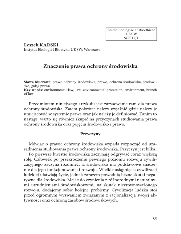 Studia Ecologiae et Bioethicae UKSW 9(2011)1 Leszek KARSKI Instytut Ekologii i Bioetyki, UKSW, Warszawa Znaczenie prawa ochrony środowiska Słowa kluczowe: prawo ochrony środowiska, prawo, ochrona środowiska, środowisko, gałąź prawa. Key words: environmental law, law, environmental protection, environment, branch of law Przedmiotem niniejszego artykułu jest zarysowanie ram dla prawa ochrony środowiska. Zatem pokrótce należy wyjaśnić gdzie należy je umiejscowić w systemie prawa oraz jak należy je definiować. Zanim to nastąpi, warto się również skupić na przyczynach studiowania prawa ochrony środowiska oraz pojęciu środowisko i prawo. Przyczyny Mówiąc o prawie ochrony środowiska wypada rozpocząć od uzasadnienia studiowania prawa ochrony środowiska. Przyczyn jest kilka. Po pierwsze kwestie środowiska zaczynają odgrywać coraz większą rolę. Człowiek po przekroczeniu pewnego poziomu rozwoju cywilizacyjnego zaczyna rozumieć, iż środowisko ma podstawowe znaczenie dla jego funkcjonowania i rozwoju. Wielkie osiągnięcia cywilizacji ludzkiej ułatwiają życie, jednak zarazem powodują liczne skutki negatywne dla środowiska. Mając do czynienia z różnorodnymi naturalnymi utrudnieniami środowiskowymi, na skutek niezrównoważonego rozwoju, dodajemy sobie kolejne problemy. Cywilizacja ludzka stoi przed ogromnym wyzwaniem związanym z racjonalizacją swojej aktywności oraz ochroną zasobów środowiskowych. 85 Leszek Karski Człowiek, jako część środowiska, musi zająć się jego ochroną. Chroniąc środowisko, człowiek chroni samego siebie. Czyni to poprzez wyznaczanie pewnych granic samemu sobie. Zagadnienie ochrony środowiska jest największym współczesnym wyzwaniem, stojącym przed człowiekiem. Dalszy rozwój cywilizacji ludzkiej jest uzależniony od racjonalizacji korzystania z zasobów środowiska. Jednak kwestia ochrony środowiska jest niezwykle skomplikowaną problematyką. Obejmuje szeroki zbiór zagadnień, takich chociażby jak: zmiany klimatu, ochrona powietrza, kwestie bioróżnorodności, ochrona wód i mórz, gospodarka odpadami. Poczynając od poziomu globalnego, a kończąc na poziomie lokalnym odczuwamy negatywne skutki zanieczyszczenia środowiska. Wymagają one odpowiedniego zarządzania środowiskiem na skalę globalną. Jednak wdrożenie globalnego zarządzania może odbywać się dzięki odpowiedniemu zachowaniu każdego człowieka na poziomie lokalnym. Ochroną środowiska zajmują się różne dyscypliny. Ochrona środowiska jest interdyscyplinarna. Jej wdrażanie wymaga powiązania aspektów fizycznych, chemicznych, społecznych, technologicznych, politycznych, ekonomicznych i prawnych. Każdy kto wyraża zainteresowanie ochroną środowiska powinien przywiązać należytą wagę do regulacji prawnych. Prawo posiada centralne znacznie dla organizacji systemu ochrony środowiska. Prawo jest podstawowym narzędziem w ręku państwa. Poprzez regulacje prawne państwo tworzy zasady i instrumenty, których celem jest transformacja społeczno-gospdoarcza. Zmiana w zachowaniu się konsumentów i podmiotów gospodarczych obywa się dzięki odpowiedniemu reżimowi prawnemu. Prawo edukuje społeczeństwo i dynamizuje stosunki w celu ochrony środowiska. Państwo wykorzystuje prawo w celu zachęcenia do odpowiedniego zachowania się np. poprzez subsydia, dotacje, ulgi podatkowe. Państwo za pomocą prawa wprowadza również sankcję mające na celu wyeliminowanie zachowań szkodzących środowisku. „Odkrycie” prawa na potrzeby ochrony środowiska powoduje potężny rozrost regulacji środowiskowych. Każdy kto zajmuje się problematyką racjonalizacji korzystania z zasobów powinien znać pojęcia, zasady i podstawowej instytucje prawa ochrony środowiska. Bez znajo86 Znaczenie prawa ochrony środowiska mości prawa nie jest możliwe pełne zrozumienie ochrony środowiska. Nie jest też możliwe sprostanie wyzwaniom jakie stawia racjonalna gospodarka zasobami. Prawo Zdefiniowanie prawa ochrony środowiska wymaga przedstawienia dwóch składających się na niego pojęć, czyli prawa i ochrony środowiska. Prawo towarzyszy ludziom od zarania dziejów. Jest ono regulatorem ludzkich zachowań obok takich regulatorów jak: religia obyczaj, normy moralne. Podczas rozwoju cywilizacji prawo definiowano w różny sposób. Na dzisiejsze rozumienie prawa największy wpływ miała szkoła pozytywistyczna z pewnym wpływem szkoły prawa natury. Według pozytywistów, takich jak: John Austin, Rudolf von Ihering, Georg Jedlinek Herbert Hart i Hans Kelsen, prawo jest ustawą ustanowioną przez państwo, bez względu na aspekt moralny (Hart 2001: 269 i n). Według szkoły prawa natury prawo oznacza sprawiedliwość (Fuller 1964: 95 i n.; Finnis 2001: 31 i n.). Wątek prawnonaturalny przewija się od Sofistów, Arystotelesa. Natomiast w czasach nowożytnych przedstawicielami tego nurtu byli: Gustaw Radbruch, Lon Luvois Fuller, John Finnis. Obecnie, najprościej rzecz ujmując, prawo należy rozumieć jako zespół norm ustanowionych lub uznanych przez odpowiednie organy państwa, wobec których posłuch bywa zapewniony poprze przymus państwa. Prawo składa się trzech fundamentów: sprawiedliwości, celowości i bezpieczeństwa prawnego (Radbruch 2009: 107). Prawo ma normatywny charakter. Oznacza to, iż zawiera: normy, reguły postępowania, wzory zachowań, poprzez które nie stwierdzamy faktu, lecz wskazujemy na powinność. Perswazyjność prawa polega miedzy innymi na zakazie niszczenia środowiska lub nakazie stosowania najlepszych dostępnych technik. Stan faktyczny powoduje konsekwencję prawną. Jeżeli jest stan faktyczny jest zgodny z normą to mamy do czynienia ze zgodnością z prawem. 87 Leszek Karski Prawo ochrony środowiska należy do systemu prawa. System prawa jest to zbiór w pewien sposób ze sobą powiązanych i uporządkowanych generalnych i abstrakcyjnych norm wyrażonych w tekście aktów normatywnych – zawartych w