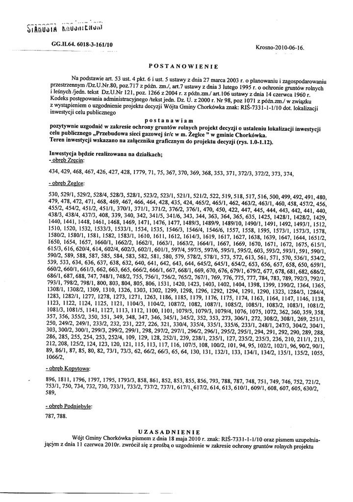 GG.11.64. 6018-3-161/10 Krosno-2010-06-16. POSTA NOWIE NIE Na podstawie art. 53 ust. 4 pkt. 6 i ust. 5 ustawy z dnia 27 marca 2003 r. o planowaniu i zagospodarowaniu przestrzennym /Dz.U.Nr.80, poz.717 z późn. zm./, art.7 ustawy z dnia 3 lutego 1995 r. o ochronie gruntów rolnych i leśnych /jedn. tekst Dz.U.Nr 121, poz. 1266 z 2004 r. z późn.zm./ art.106 ustawy z dnia 14 czerwca 1960 r. Kodeks postępowania administracyjnego /tekstjedn. Dz. U. z 2000 r. Nr 98, poz 1071 z późn.zm./ w związku z wystąpieniem o uzgodnienie projektu decyzji Wójta Gminy Chorkówka znak: RIŚ-7331-1-1/10 dot. lokalizacji inwestycji celu publicznego postana wiam pozytywnie uzgodnić w zakresie ochrony gruntów rolnych projekt decyzji o ustaleniu lokalizacji inwestycji celu publicznego ,,Przebudo wa sieci gazowej śr/c w m. Żeglce" w gminie Chorkówk a. Teren inwestycji wskazano na załączniku graficznym do projektu decyzji (rys. 1.0-1.12). Inwestycja będzie realizowan a na - obręb Zręcin: działkach; 434,429,4 68,467,42 6,427,428 , 1779, 71, 75,367,37 0,369,368 ,353,371,3 72/3,372/ 2,373,374 , - obreb Żeglce: 530, 529/1, 52912, 528/4, 528/3, 528/1, 523/2, 523/1, 521/1, 521/2, 522, 519, 518, 517, 516, 500, 499, 492, 491, 480, 479, 478, 472, 471, 468, 469, 467, 466, 464, 428, 435, 424, 465/2, 465/1, 462, 463/2, 463/1, 460, 458, 457/2, 456, 455/2, 454/2, 45112, 45111, 370/1, 37111, 37112, 376/2, 37611, 470, 450, 422, 447, 445, 444, 443, 442, 441, 440, 438/3, 438/4, 437/3, 408, 339, 340, 342, 34115, 341/6, 343, 344, 363, 364, 365, 635, 1425, 1428/1, 1428/2, 1429, 1440, 1441, 1448, 1461, 1468, 1469, 1471, 1476, 1477, 1489/3, 1489/9, 1489/10, 1490/1, 1491, 1492, 149311, 1512, 1510, 1520, 1532, 1533/3, 1533/1, 1534, 1535, 1546/3, 1546/4, 1546/6, 1557, 1558, 1595, 157311, 1573/3, 1578, 1580/2, 1580/1, 1581, 1582, 1583/1, 1610, 1611, 1612, 1614/3, 1619, 1617, 1627, 1638, 1639, 1647, 1644, 165112, f650, 1654, 1657, 1660/1, 1662/2, 1662/1, 166311, 1663/2, 1664/1, 1667, 1669, 1670, 1671, 1672, 1675, 615/1, 615/3, 616, 620/4, 614, 602/4, 602/3, 602/l, 60111, 597/4, 59715, 59716, 59511, 59512, 603, 59312, 593/l, 591, 590/1, 59012, 589, 588, 587, 585, 584, 583, 582, 581, 580, 579, 578/2, 578/1, 573, 572, 613, 561, 571, 570, 53611, 53412, 539, 533, 634, 636, 637, 638, 632, 640, 641, 642, 643, 644, 64512, 64511, 65412, 653, 656, 657, 658, 650, 659/l, 66012, 660/1, 661/3, 662, 663, 665, 66612, 666/1, 667, 668/1, 669, 670, 676, 679/1, 679/2, 677, 678, 681, 682, 686/2, 686/1, 687, 688, 747, 74811, 748/2, 755, 756/1, 756/2, 76512, 76711, 769, 776, 775, 777, 784, 783, 789, 792/3, 792/1, 793/1, 798/2, 798/1, 800, 803, 804, 805, 806, 1531, 1420, 1423, 1403, 1402, 1404, 1398, 1399, 1390/2, 1364, 1365, 1308/1, 1308/2, 1309, 1310, 1326, 1303, 1302, 1299, 1298, 1296, 1292, 1294, 1291, 1290, 1323, 1284/3, 1284/4, 1283, 1282/1, 1277, 1278, 1273, 1271, 1263, 1186, 1185, ll79, 1176, 1175, ll74, 1163, 1164, 1147, 1146, 1138, 1123, 1122, 1124, 1125, 1121, 1104/3, 1104/2, 1087/2, 1082, 1087/1, 1085/2, 1085/1, 1083/2, 1083/1, 108112, 108113, 108115, 1141, 1127, 1113, 1112, 1100, 1101, 1079/5, 1079/3, 1079/4, 1076, 1075, 1072, 362, 360, 359, 358, 357, 356, 35512, 350, 351, 349, 348, 347, 346, 345/1, 345/2, 352, 353, 273, 306/1, 272, 308/2, 30811, 269, 251/1, 250, 249/2, 249/1, 233/2, 232, 231, 227, 226, 321, 330/4, 335/4, 335/1, 33516, 23311, 248/1, 247/3, 304/2, 304/1, 303, 30012, 30011, 29913, 29912, 29911, 298, 297/2, 297/1, 29612, 29611, 29512, 29511, 294, 291, 292, 290, 289, 288, 286, 285, 255, 254, 253, 252/4, 109, 129, 128, 252/1, 239, 238/1, 23511, 127, 235/2, 23513, 236, 210, 211/1, 213, 212,208, 125/2, 124, 123, 120, 121, 115, 113, 117, 116, 107/5, 108, 100/2, 101, 94, 95, 10212, 10211, 96, 9012, 9011, 89, 8611, 87, 85, 80, 82, 73/1, 73/3, 62, 6612, 6613, 65, 64, 130, 131, 132/1, 133, 13411, 134/2, 135/1, 135/2, 1055, 106612, - obręb Kopytowa: 896, 1811, 1796, 1797, 1795, 1793/3,85 8,861,852 ,853,855,8 56, 793, 788, 787, 748, 751, 749, 746, 752, 721/2, 753/1, 750, 734, 732, 730, 733/1, 733/2, 737/2, 737/1, 61711,,617/2, 614, 613, 61011, 60911, 608, 607, 605, 63012, 589, - obreb Podniebyle: 787, 788. UZASA DNIEN IE Wójt Gminy Chorkówka pismem z dnia 18 maja 20 I Or. znak: RIŚ-7331-1-1/1 O oraz pismem uzupełnia jąc}tm z dnia 11 czerwca 201 Or. zwrócił się z prośbą o uzgodnienie w zakresie ochrony gruntów rolnych projektu decyzji o lokalizacji inwestycji celu publiczne go polegającego na przebudo wa sieci gazowej śr/c w m. Żeglce "na działkach położonych w m. Zręcin, Żeglce i Kopytowa w gm. Chorków ka i m. Podnieby le gm. Jedlicze z wniosku Karpackiej Spółki Gazownic twa Sp. z o.o. w Tarnowie - Oddział Zakład Gazownic zy w Jaśle ul. Floriańska 112. Zgodnie z art. 51 ust. 1 ust. 2 ustawy z dnia 27 marca 2003 r. o planowan iu i zagospod arowaniu przestrzennym /Dz.U.Nr. 80, poz. 717 z póź.zm./ decyzje o lokalizacji inwestycji celu publicznego wydaje wójt, bunnistrz albo prezyden t miasta po uzgodnieniu z organami wymienionymi w art. 53 ust. 4 ww. ustawy. Jednym z warunków wydania decyzji o warunkach zabudowy zgodnie z art. 61 ust.I pkt 4 ustawy o planowaniu i zagospod arowaniu przestrzennym jest, by teren objęty inwestycją nie wymagał uzyskania zgody na zmianę przeznacz enia gruntów rolnych i leśnych na cele nierolnicze i nieleśne albo był objęty zgodą uzyskaną przy sporządzaniu miejscow ych planów, które utraciły moc na podstawie art. 67 ustawy z dnia 7 lipca 1994 r. o zagospodarowaniu przestrze nnym I Dz.U. z 1999 r., Nr 15, poz. 139 z późn. zm./. Zgodnie z załączoną dokumentacją i pismem wyjaśniającym projektow ana inwestycja modernizację istniejącej sieci gazowej oraz wymianę techniczn ie wyeksplo atowanej ma na celu sieci gazowej. Trasa nowej sieci gazowej w większości projektow ana jest po trasie istniejącej sieci gazowej - teren zajęty czasowo na czas robót budowlano - montażowych to pas szerokości 0,50m. Zwarty obszar zajęty pod inwestycj ę obejmujący uży