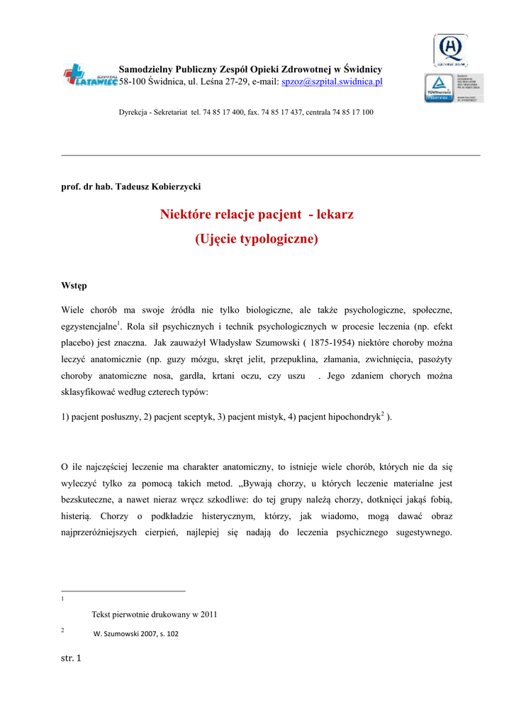Samodzielny Publiczny Zespół Opieki Zdrowotnej w Świdnicy 58-100 Świdnica, ul. Leśna 27-29, e-mail: [email protected] Dyrekcja - Sekretariat tel. 74 85 17 400, fax. 74 85 17 437, centrala 74 85 17 100 prof. dr hab. Tadeusz Kobierzycki Niektóre relacje pacjent - lekarz (Ujęcie typologiczne) Wstęp Wiele chorób ma swoje źródła nie tylko biologiczne, ale także psychologiczne, społeczne, egzystencjalne1. Rola sił psychicznych i technik psychologicznych w procesie leczenia (np. efekt placebo) jest znaczna. Jak zauważył Władysław Szumowski ( 1875-1954) niektóre choroby można leczyć anatomicznie (np. guzy mózgu, skręt jelit, przepuklina, złamania, zwichnięcia, pasożyty choroby anatomiczne nosa, gardła, krtani oczu, czy uszu . Jego zdaniem chorych można sklasyfikować według czterech typów: 1) pacjent posłuszny, 2) pacjent sceptyk, 3) pacjent mistyk, 4) pacjent hipochondryk2 ). O ile najczęściej leczenie ma charakter anatomiczny, to istnieje wiele chorób, których nie da się wyleczyć tylko za pomocą takich metod. „Bywają chorzy, u których leczenie materialne jest bezskuteczne, a nawet nieraz wręcz szkodliwe: do tej grupy należą chorzy, dotknięci jakąś fobią, histerią. Chorzy o podkładzie histerycznym, którzy, jak wiadomo, mogą dawać obraz najprzeróżniejszych cierpień, najlepiej się nadają do leczenia psychicznego sugestywnego. 1 Tekst pierwotnie drukowany w 2011 2 str. 1 W. Szumowski 2007, s. 102 Olśniewające wyniki można widzieć u takich chorych na przykład w Lourdes. Zresztą wstrząs taumaturgiczny daje dobre wyniki, choć nie tak szybkie, w cierpieniach organicznych3 . Współcześnie Krystyna Osińska lekarz psychiatra, wyodrębniła osiem postaw aktywnych i osiem postaw pasywnych charakterystycznych dla stylów chorowania. Do aktywnych zaliczyła pacjentów, którzy przyjmowali postawę: 1) dawcy, 2) samarytanina, 3) pomocnika, 4) konspiratora, 5) poszukiwacza, 6) żołnierza, 7) artysty i 8 ) bohatera. Do pasywnych zaliczyła pacjentów, którzy przyjmowali postawę: 1) biorcy, 2) hipochondryka, 3) malkontenta, 4) zasłużonego, 5) statysty, 6) żebraka 7) zawodowca, 8) świętoszka (K. Osińska 1980). Jeden z polskich patofizjologów – prof. Karol Klecki (1866-1931), chorobę zdefiniował jako „sumę spraw życiowych toczących się w ustroju inaczej, niż w stanie prawidłowym” 4 Według Krystyny Osińskiej lekarza pulmonologa i psychiatry, docenta nauk medycznych, autorki książki „Twórcza obecność chorych” (Warszawa1980), z którą miałem okazję współpracować w Polskim Towarzystwie Higieny Psychicznej w Warszawie (1980-1984), choroba jest powszechną możliwością człowieka - jednostki i grupy. W tym sensie choroba jest: 1) darem, 2) zjawiskiem, 3) sytuacją, 4) cierpieniem, 5) faktem, 6) szansą, 7) znakiem łaski. W przedstawionej tu własnej typologii odwołuję się do wcześniejszych klasyfikacji medycznych dokonanych przez - prof. dr Władysława Szumowskiego i doc. dr med. Krystynę Osińską. Nową typologię przedstawiam na podstawie obserwacji, które poczyniłem podczas w prowadzonych przez wiele lat treningów w Studenckiej Szkole Higieny Psychicznej (1984-1994) i Szkole Treningów Rozwoju Osobowości STAKROOS (1995-2004) oraz w ramach wieloletniej współpracy z Onco-LifeTeam`ie kierowanym przez dr n. med. Ewę Kilar. 3 W. Szumowski 2007, s. 107 4 K. Klecki, 1928, cyt. za W. Szumowski 2007, s. 108. str. 2 Ostatecznie udało mi się wyróżnić osiem behawioralnych modeli chorowania (bycia pacjentem), zróżnicowanych psychologicznie i behawioralnie. Są to: 1. model estetyczny, amorficzny i etyczny - artysta, statysta, bohater, 2. model altruistyczny, egoistyczny i syntoniczny - dawca, biorca, pomocnik, 3. model braterski, religijny i dewocyjny – samarytanin, misjonarz, świętoszek, 4. model wojenny, obronny i tragiczny – żołnierz, konspirator, ofiara, 5. model dewaluacyjny, roszczeniowy i uzależnieniowy – malkontent, hipochondryk, żebrak, 6. model ratunkowy, bankowy i terminalny – rozbity, półżywy, umierający, 7. model psychiatryczny, zamaskowany i kryminalny – zagubiony, aktor, gangster, 8. model badawczy, inkorporacyjny i kontemplacyjny - poszukiwacz, zawodowiec, filozof. 1) Model estetyczny, amorficzny i etyczny – artysta, statysta i bohater Artysta – to pacjent, którego choroba uruchamia proces – przewartościowania – obrazu własnej choroby i przekształcenie go w obraz zdrowia; energię, którą otrzymuje z choroby stara się wykorzystać w kreowanie stanów i obrazów przeciwstawnych, które mają cechy zdrowia i pozwalają mu przekształcić reakcje lęku w obrazy estetyczne, wywołujące wrażenia dodatnie, które można zaakceptować i z nimi żyć ; choroba jest tworzywem nowego stylu życia, rodzajem nowej dekoracji życia. Jest kreatywny/traktuje chorobę jako zjawisko estetyczne. Statysta – to pacjent, którego choroba uruchamia proces – bezradności – unieruchamia jego energię życiową; te dwa rodzaje energii blokują się, hamują lub nakładają, wywołując bierną postawę wobec choroby i zdrowia; przyjmuje postawę bierną, jest podatny na cudze opinie, zachowuje się „bezbarwnie”, apatycznie, „nijak”, jest niezdolny do samodzielności w myśleniu i działaniu, stara się omijać problemy przez niemyślenie o zdrowiu i chorobie, przyjmując to, co mu przyniesie przypadek. Jest zahamowany/ traktuje chorobę jako technikę własnego stłumienia. Bohater – to pacjent, którego choroba uruchamia proces – ekscytacji – kieruje swoją energię w kierunku podniesienia upadającego zdrowia lub zagrożonego życia na inny poziom; nadaje im wymiar ponadosobisty; uszlachetnia chorobę i chorowanie nadając im znaczenie wyższego zdrowia. We współpracy z chorobą, w walce z nią, w sytuacjach granicznych staje się twórcą własnego losu. Jest idealistą /traktuje chorobę jako spełnienie własnego losu. 2) Model altruistyczny, 