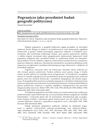 POGRANICZE. POLISH BORDERLANDS STUDIES TOM 2 nr 1 barwiński: pogranicze jako przedmiot badań... Pogranicze jako przedmiot badań geografii politycznej Marek Barwiński1 Link do artykułu: http://pogranicze.uni.opole.pl/biblioteka/docs/tom2/barwinski_t2n1.pdf Standard cytowania (APA): Barwiński, M. (2014). Pogranicze jako przedmiot badań geografii politycznej. Pogranicze. Polish Borderlands Studies, t. 2, nr 1, s. 46-48. Badania pograniczy w geografii politycznej sięgają początków tej dyscypliny naukowej choćby dlatego, że jednym z jej podstawowych, wręcz klasycznych, zagadnień badawczych są granice. Jednak postrzeganie pogranicza wyłącznie w kontekście przestrzennym, jako peryferyjnie położonego obszaru „przy granicy państwowej”, zaledwie w nikłym stopniu wyczerpuje zakres geograficznych zainteresowań badawczych. Jeżeli pogranicze traktujemy jako „przedmiot badań”, to „podmiotem badań” jest zamieszkująca je ludność. Procesy osadnicze, migracje, zróżnicowanie narodowościowe, wyznaniowe, językowe, kulturowe, społeczne, ekonomiczne mieszkańców są podstawą delimitacji strefy pogranicza oraz głównymi czynnikami determinującymi jego odmienność i odrębność od pozostałych regionów. Pogranicze zazwyczaj (choć nie koniecznie) obejmuje obszar położony po obu stronach granicy państwowej. Funkcje pełnione przez granice mogą w bardzo istotny sposób wpływać na przyległe tereny przygraniczne i je kształtować, szczególnie dotyczy to szeroko pojętego procesu przekształceń społeczno-gospodarczych, ponieważ granica może być zarówno barierą jak i czynnikiem integrującym dla obszaru pogranicza. W geografii politycznej liczne są badania pograniczy w kontekście funkcjonowania społeczno-gospodarczych jednostek terytorialnych położonych w bezpośredniej bliskości granicy państwowej, zwłaszcza w aspekcie współpracy transgranicznej oraz procesów integracji politycznej (m.in. Rykiel 1990, 1991; Ciok 1992; Eberhardt 1996; Heffner 1998; Palmowski 2000, 2007; Sobczyński 2005). W badaniach pograniczy niezwykle istotny jest wymiar historyczny i polityczny, ponieważ bardzo często formowanie się, czy też przemiany obszarów pogranicza, wynikały bezpośrednio z wytyczenia granic lub ich przesunięcia. Konsekwencją tego są geograficzne badania trwałości i zmienności granic historycznych oraz ich wpływu na różnicowanie kulturowe, społeczne i gospodarcze pograniczy (m.in. Sobczyński 1993, 2008; Kosmala 2003; Eberhardt 2004). Jednak najczęściej geografowie polityczni zajmują się badaniami pograniczy w aspekcie zróżnicowania etniczno-wyznaniowego oraz społeczno-kulturowego mieszkańców (m.in. Koter 1995, 1997; Barwiński 1998, 2001, 2002, 2004, 2005, 2009, 2013; Eberhardt 1998; Kowalski 1998, 2010; Rykiel 2000; Sobczyński 2006; 1 Dr hab. Marek Barwiński – adiunkt w Katedrze Geografii Politycznej i Studiów Regionalnych Uniwersytetu Łódzkiego. 46 POGRANICZE. POLISH BORDERLANDS STUDIES TOM 2 nr 1 barwiński: pogranicze jako przedmiot badań... Barwiński i Leśniewska 2011). Występowanie tego typu pograniczy nie musi być związane z aktualnym przebiegiem granicy, a jego przestrzeń funkcjonuje przede wszystkim w świadomości mieszkańców. Jest ono rozumiane jako obszar przejściowy pomiędzy dwoma lub kilkoma narodami, o charakterze strefowym, zróżnicowany społecznie i kulturowo, uformowany w konsekwencji wielokrotnych historycznych zmian przynależności politycznej danego terytorium, wymieszania się ludności w wyniku procesów osadniczych, krzyżowania się wpływów politycznych i społecznych oraz zderzania i przenikania różnorodnych elementów kultury sąsiadujących narodów, wpływających na różnicowanie narodowości zamieszkujących pogranicze, a także powstawanie nowych form tożsamości. Badania geograficzno-polityczne tak definiowanego pogranicza są niemożliwe bez odwoływania się m.in. do historii, socjologii, etnologii, bez których trudne jest zrozumienie skomplikowanych procesów i zależności zachodzących na obszarze pograniczy. Literatura: Barwiński, M. (1998). Political Conditions of Transborder Contacts of Lemkos Living on Both Sides of the Carpathian Mountains. W: M. Koter M., K. Heffner (red.), Borderlands or Transborder Regions - Geographical, Social and Political Problems. Opole-Łódź: Wydawnictwo Instytutu Śląskiego – Polskiego Instytutu Naukowego. Barwiński, M. (2001). „Tolerant Borderland” – Relations Between Multiethnic Rural Communities of Podlasie. W: A. Ilies, V. Bodocan (red.), Minorities in Central and Eastern Europe. Revista Romana de Geografie Politica, nr 2, s. 63-72. Barwiński, M. (2002). Pogranicze w ujęciu geograficzno-socjologicznym – zarys problematyki. Acta Universitatis Lodziensis, Folia Geographica Socio-Oeconomica, nr 4, s. 11-23. Barwiński, M. (2004). Podlasie jako pogranicze narodowościowo-wyznaniowe. Łódź: Wydawnictwo Uniwersytetu Łódzkiego. Barwiński, M. (2005). The Contemporary Ethnic and Religious Borderland in Podlasie Region. W: M. Koter, K. Heffner (red.), Historical, Ethnic and Geographical Problems of Borderlands. Opole-Łódź: Wydawnictwo Instytutu Śląskiego – Polskiego Instytutu Naukowego. Barwiński, M. (2009). The contemporary Polish-Ukrainian borderland – its political and national aspect. W: M. Sobczyński (red.), Historical Regions Divided by the Borders. General Problems and Regional Issue. Łódź-Opole: Wydawnictwo Instytutu Śląskiego – Polskiego Instytutu Naukowego. Barwiński, M. (2013). Geograficzno-polityczne uwarunkowania sytuacji Ukraińców, Łemków, Białorusinów i Litwinów w Polsce po 1944 roku. Łódź: Wydawnictwo Uniwersytetu Łódzkiego. Barwiński, M., Leśniewska, K. (2011). Lemko Region – Historical Region in the PolishSlovakian Borderland. W: K. Heffner (red.), Historical Regions in the Structures of European Union. Łódź-Opole: Wydawnictwo Instytutu Śląskiego – P