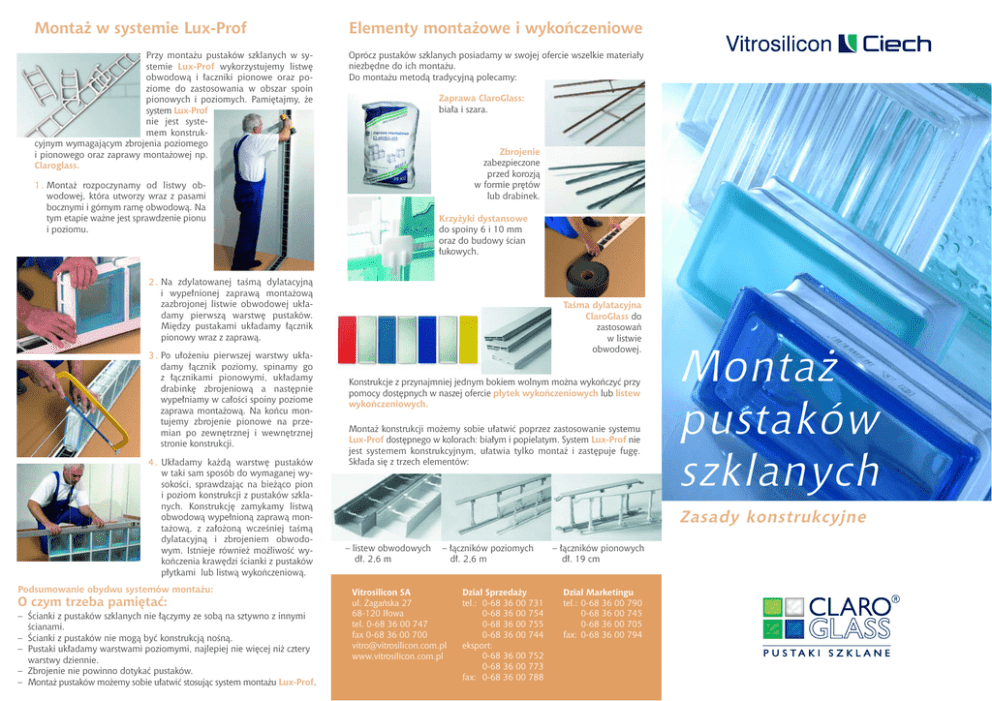 Monta˝ w systemie Lux-Prof Elementy monta˝owe i wykoƒczeniowe Przy monta˝u pustaków szklanych w systemie Lux-Prof wykorzystujemy listw´ obwodowà i ∏aczniki pionowe oraz poziome do zastosowania w obszar spoin pionowych i poziomych. Pami´tajmy, ˝e system Lux-Prof nie jest systemem konstrukcyjnym wymagajàcym zbrojenia poziomego i pionowego oraz zaprawy monta˝owej np. Claroglass. Oprócz pustaków szklanych posiadamy w swojej ofercie wszelkie materia∏y niezb´dne do ich monta˝u. Do monta˝u metodà tradycyjnà polecamy: Zaprawa ClaroGlass: bia∏a i szara. Zbrojenie zabezpieczone przed korozjà w formie pr´tów lub drabinek. 1 . Monta˝ rozpoczynamy od listwy obwodowej, która utworzy wraz z pasami bocznymi i górnym ram´ obwodowà. Na tym etapie wa˝ne jest sprawdzenie pionu i poziomu. Krzy˝yki dystansowe do spoiny 6 i 10 mm oraz do budowy Êcian ∏ukowych. 2 . Na zdylatowanej taÊmà dylatacyjnà i wype∏nionej zaprawà monta˝owà zazbrojonej listwie obwodowej uk∏adamy pierwszà warstw´ pustaków. Mi´dzy pustakami uk∏adamy ∏àcznik pionowy wraz z zaprawà. 3 . Po u∏o˝eniu pierwszej warstwy uk∏adamy ∏àcznik poziomy, spinamy go z ∏àcznikami pionowymi, uk∏adamy drabink´ zbrojeniowà a nast´pnie wype∏niamy w ca∏oÊci spoiny poziome zaprawa monta˝owà. Na koƒcu montujemy zbrojenie pionowe na przemian po zewn´trznej i wewn´trznej stronie konstrukcji. 4 . Uk∏adamy ka˝dà warstw´ pustaków w taki sam sposób do wymaganej wysokoÊci, sprawdzajàc na bie˝àco pion i poziom konstrukcji z pustaków szklanych. Konstrukcj´ zamykamy listwà obwodowà wype∏nionà zaprawà monta˝owà, z za∏o˝onà wczeÊniej taÊmà dylatacyjnà i zbrojeniem obwodowym. Istnieje równie˝ mo˝liwoÊç wykoƒczenia kraw´dzi Êcianki z pustaków p∏ytkami lub listwà wykoƒczeniowà. Podsumowanie obydwu systemów monta˝u: O czym trzeba pami´taç: – Âcianki z pustaków szklanych nie ∏àczymy ze sobà na sztywno z innymi Êcianami. – Âcianki z pustaków nie mogà byç konstrukcjà noÊnà. – Pustaki uk∏adamy warstwami poziomymi, najlepiej nie wi´cej ni˝ cztery warstwy dziennie. – Zbrojenie nie powinno dotykaç pustaków. – Monta˝ pustaków mo˝emy sobie u∏atwiç stosujàc system monta˝u Lux-Prof. TaÊma dylatacyjna ClaroGlass do zastosowaƒ w listwie obwodowej. Konstrukcje z przynajmniej jednym bokiem wolnym mo˝na wykoƒczyç przy pomocy dost´pnych w naszej ofercie p∏ytek wykoƒczeniowych lub listew wykoƒczeniowych. Monta˝ konstrukcji mo˝emy sobie u∏atwiç poprzez zastosowanie systemu Lux-Prof dost´pnego w kolorach: bia∏ym i popielatym. System Lux-Prof nie jest systemem konstrukcyjnym, u∏atwia tylko monta˝ i zast´puje fug´. Sk∏ada si´ z trzech elementów: Monta˝ pustaków szklanych Zasady konstrukcyjne – listew obwodowych d∏. 2,6 m – ∏àczników poziomych d∏. 2,6 m Vitrosilicon SA ul. ˚agaƒska 27 68-120 I∏owa tel. 0-68 36 00 747 fax 0-68 36 00 700 [email protected] www.vitrosilicon.com.pl Dzia∏ Sprzeda˝y tel.: 0-68 36 00 731 0-68 36 00 754 0-68 36 00 755 0-68 36 00 744 eksport: 0-68 36 00 752 0-68 36 00 773 fax: 0-68 36 00 788 – ∏àczników pionowych d∏. 19 cm Dzia∏ Marketingu tel.: 0-68 36 00 790 0-68 36 00 745 0-68 36 00 705 fax: 0-68 36 00 794 Monta˝ pustaków szklanych Monta˝ tradycyjny 4 . Listw´ obwodowà wype∏niamy zaprawà monta˝owà ClaroGlass, tak aby wype∏niona ona by∏a w ca∏oÊci. Podstawowà metodà budowania konstrukcji z pustakow szklanych jest murowanie na zaprawie cementowej bez wapna. Nie ka˝dà zapraw´ mo˝emy u˝yç do budowy pustaków szklanych. Zaprawa musi charakteryzowaç si´ m.in. odpowiednià przyczepnoÊcià i elastycznoÊcià, dlatego polecamy zaprawy specjalistyczne, np. zapraw´ CLAROGLASS. 1 . Monta˝ konstrukcji zaczynamy od monta˝u listwy startowej np.: listwy obwodowej Lux-Prof lub ceownika stalowego, który wraz z pasami bocznymi i górnym utworzy ram´ obwodowà (rozstaw ko∏ków rozporowych co 40-50 cm, nie mniej jak 3 ko∏ki na listw´). 2 . Listw´ obwodowà mocujemy do pod∏o˝a na sztywno. Sprawdzamy pion i poziom. Zagwarantuje nam to stabilnoÊç i estetyk´ konstrukcji. 3 . Dno listwy obwodowej wyk∏adamy taÊmà dylatacyjnà ClaroGlass a nast´pnie montujemy zbrojenie obwodowe: drabink´ zbrojeniowà lub dwa pr´ty 6 mm, podwiàzujàc je drutem wiàzad∏owym tak, aby nie opad∏o na dno listwy obwodowej. 5 . Na tak przygotowanym pod∏o˝u uk∏adamy pierwszà warstw´ pustaków szklanych, rozpoczynajàc od naro˝nika. Odleg∏oÊci mi´dzy pustakami utrzymujemy za pomocà krzy˝yków dystansowych do pustaków szklanych. Zapraw´ najlepiej nak∏adaç na kraw´dê pustaka i po jego umieszczeniu w konstrukcji usunàç jej nadmiar. 6 . Ca∏oÊç konstrukcji musi byç zazbrojona. W spoinach poziomych uk∏adamy drabink´ zbrojeniowà lub dwa pr´ty 6 mm, natomiast w spoinach pionowych pojedyncze pr´ty na przemian po wewn´trznej i zewn´trznej stronie. Koƒce zbrojenia muszà byç zakotwione w ramie obwodowej. 7 . Nadmiar zaprawy usuwamy na bie˝àco, nie dopuszczajàc do jej wyschni´cia. Ka˝dà warstw´ pustaków uk∏adamy do wymaganej wysokoÊci analogicznie jak pierwszà, pami´tajàc, aby zachowaç wzór pustaków szklanych. 8 . Po u∏o˝eniu ostatniego rz´du pustaków odrywamy p∏ytki po obu stronach krzy˝yków dystansowych. Zbieramy nadmiar zaprawy ze spoin zostawiajàc wolnà przestrzeƒ, którà uzupe∏niamy zaprawà do spoinowania. CzynnoÊç t´ mo˝emy wykonaç na nast´pny dzieƒ za pomocà zapraw do spoinowania odpowiednich do szerokoÊci spoin. Monta˝ lekkiej wewn´trznej stolarki drzwiowej w konstrukcjach z pustaków szklanych wykonujemy w nast´pujàcy sposób: 1 . Drzwi z tradycyjnà oÊcie˝nicà montujemy za pomocà ko∏ków rozporowych. Przytwierdzamy je w spoiny mi´dzy pustakami. W∏aÊciwe ustawienie oÊcie˝nicy w pionie i poziomie korygujemy za pomocà klinów. Drzwi z oÊcie˝nicà regulowanà w