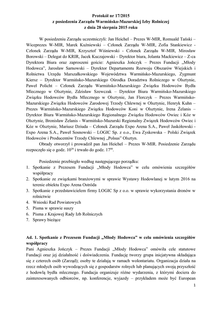 Protokół nr 17/2015 z posiedzenia Zarządu Warmińsko-Mazurskiej Izby Rolniczej z dnia 28 sierpnia 2015 roku W posiedzeniu Zarządu uczestniczyli: Jan Heichel – Prezes W-MIR, Romuald Tański – Wiceprezes W-MIR, Marek Kuźniewski – Członek Zarządu W-MIR, Zofia Stankiewicz Członek Zarządu W-MIR, Krzysztof Wiśniewski - Członek Zarządu W-MIR, Mirosław Borowski – Delegat do KRIR, Jacek Kuczajowski – Dyrektor biura, Jolanta Mackiewicz – Z-ca Dyrektora Biura oraz zaproszeni goście: Agnieszka Jończyk – Prezes Fundacji „Młody Hodowca”, Jarosław Sarnowski – Dyrektor Departamentu Rozwoju Obszarów Wiejskich i Rolnictwa Urzędu Marszałkowskiego Województwa Warmińsko-Mazurskiego, Zygmunt Kiersz – Dyrektor Warmińsko-Mazurskiego Ośrodka Doradztwa Rolniczego w Olsztynie, Paweł Policht – Członek Zarządu Warmińsko-Mazurskiego Związku Hodowców Bydła Mlecznego w Olsztynie, Zdzisław Szewczak – Dyrektor Biura Warmińsko-Mazurskiego Związku Hodowców Bydła Mlecznego w Olsztynie, Jan Florczyk – Prezes WarmińskoMazurskiego Związku Hodowców Zarodowej Trzody Chlewnej w Olsztynie, Henryk Kuhn – Prezes Warmińsko-Mazurskiego Związku Hodowców Koni w Olsztynie, Irena Żelanis – Dyrektor Biura Warmińsko-Mazurskiego Regionalnego Związku Hodowców Owiec i Kóz w Olsztynie, Bronisław Żelanis - Warmińsko-Mazurski Regionalny Związek Hodowców Owiec i Kóz w Olsztynie, Mariusz Dziuda – Członek Zarządu Expo Arena S.A., Paweł Jaskółowski Expo Arena S.A., Paweł Sosnowski – LOGIC Sp. z o.o., Ewa Zyskowska – Polski Związek Hodowców i Producentów Trzody Chlewnej „Polsus” Olsztyn. Obrady otworzył i prowadził pan Jan Heichel – Prezes W-MIR. Posiedzenie Zarządu rozpoczęło się o godz. 1030 i trwało do godz. 1700. 1. 2. 3. 4. 5. 6. 7. Posiedzenie przebiegło według następującego porządku: Spotkanie z Prezesem Fundacji „Młody Hodowca” w celu omówienia szczegółów współpracy Spotkanie ze związkami branżowymi w sprawie Wystawy Hodowlanej w lutym 2016 na terenie obiektu Expo Arena Ostróda Spotkanie z przedstawicielem firmy LOGIC Sp z o.o. w sprawie wykorzystania dronów w rolnictwie Wnioski Rad Powiatowych Pisma w sprawie suszy Pisma z Krajowej Rady Izb Rolniczych Sprawy bieżące Ad. 1. Spotkanie z Prezesem Fundacji „Młody Hodowca” w celu omówienia szczegółów współpracy Pani Agnieszka Jończyk – Prezes Fundacji „Młody Hodowca” omówiła cele statutowe Fundacji oraz jej działalność i doświadczenia. Fundację tworzy grupa inicjatywna składająca się z czterech osób (Zarząd); osoby te działają w ramach wolontariatu. Organizacja działa na rzecz młodych osób wywodzących się z gospodarstw rolnych lub planujących swoją przyszłość z hodowlą bydła mlecznego. Fundacja organizuje różne wydarzenia, z którymi dociera do zainteresowanych odbiorców, np. konferencje, wyjazdy – przykładem może być European 1 Young Breeders School odbywający się w Battice w Belgii. Jest to szkoła organizowana przez Association Wallonne de l’Elevage w dniach 2 – 6 września 2015 r. Wyjazd ma charakter praktyczno – naukowy, a jego celem jest profesjonalna nauka strzyżenia i pielęgnacji bydła wystawowego oraz udział w konkursie Młodego Hodowcy, gdzie zwycięzca ma możliwość wyjazdu do Kanady na 3 tygodniowy profesjonalny kurs. Pani Agnieszka Jończyk – Prezes zaprosiła do współpracy Warmińsko-Mazurską Izbę Rolniczą oraz zwróciła się o wsparcie finansowe „wydarzenia belgijskiego”. Poinformowała również, iż z ofertą współpracy Fundacja bezskutecznie zwracała się do Polskiej Federacja Hodowców Bydła i Producentów Mleka. Po zapoznaniu się z powyższymi informacjami Pan Jan Heichel – Prezes W-MIR stwierdził, że temat działania Fundacji należy poruszyć podczas posiedzenia zarządu WarmińskoMazurskiego Związku Hodowców Bydła Mlecznego. Ponadto, Zarząd W-MIR postanowił przekazać kwotę 2000 zł brutto na wyjazd przedstawicieli Fundacji do Belgii, podjęto uchwałę w sprawie współorganizacji wyjazdu szkoleniowego. Ad. 2. Spotkanie ze związkami branżowymi w sprawie Wystawy Hodowlanej w lutym 2016 na terenie obiektu Expo Arena Ostróda Pan Jan Heichel – Prezes W-MIR przywitał przedstawicieli związków branżowych przybyłych na spotkanie w sprawie organizacji wystawy hodowlanej w lutym 2016 r. na terenie obiektu Expo Arena w Ostródzie. Następnie zwrócił się o wystąpienie do pana Mariusza Dziudy – Członka Zarządu Expo Arena S.A. Pan Mariusz Dziuda przedstawił informacje na temat obiektu Expo Arena w Ostródzie. Centrum targowo - wystawiennicze zajmuje powierzchnię 5 ha pod dachem (obiekt jest mniejszy tylko od hal w Poznaniu). Po zmianie właściciela nastąpiło dokapitalizowanie spółki z 21 mln zł kapitału założycielskiego do 85 mln zł. Zatwierdzony został plan rozwoju na najbliższe trzy lata, podczas których obiekt ma zostać wypromowany jako obiekt wystawienniczo – konferencyjny. Organizowane są różnego rodzaju imprezy: Asia Trade, Hubertus, Targi Sacrum, kosmetyczne. W Arenie zatrudnieni są mieszkańcy tego regionu (60 osób). Expo Arena S.A. ma odpowiedni potencjał (możliwości techniczne, zaplecze) do organizacji dużej imprezy rolniczej. Pan Mariusz Dziuda zaproponował zorganizowanie wystawy hodowlanej w dniach 13 – 14.02.2016 r., połączonej z imprezą organizowaną przez Polską Izbę Gospodarczą Maszyn i Urządzeń Rolniczych. Impreza zorganizowana przez PIGMiUR w lutym 2015 r. w Expo Arena w Ostródzie przyciągnęła 18000 zwiedzających. Pan Paweł Jaskółowski przedstawił koncepcję organizacji wystawy. W związku z wprowadzeniem zwierząt do wewnątrz, największym kosztem będzie przygotowanie miejsc dla zwierząt: maty, żeby zwierzęta się nie ślizgały, ring, trybuny, a po wystawie pozbycie się zapachów. Wokół wystawy zwierząt będzie wszystko, co jest związane z hodowlą. Przygotowanie logist