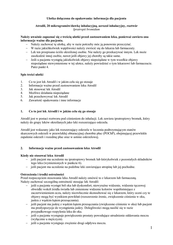 Ulotka dołączona do opakowania: informacja dla pacjenta Atrodil, 20 mikrogramów/dawkę inhalacyjną, aerozol inhalacyjny, roztwór Ipratropii bromidum Należy uważnie zapoznać się z treścią ulotki przed zastosowaniem leku, ponieważ zawiera ona informacje ważne dla pacjenta. Należy zachować tę ulotkę, aby w razie potrzeby móc ją ponownie przeczytać. W razie jakichkolwiek wątpliwości należy zwrócić się do lekarza lub farmaceuty. Lek ten przepisano ściśle określonej osobie. Nie należy go przekazywać innym. Lek może zaszkodzić innej osobie, nawet jeśli objawy jej choroby są takie same. Jeśli u pacjenta wystąpią jakiekolwiek objawy niepożądane w tym wszelkie objawy niepożądane niewymienione w tej ulotce, należy powiedzieć o tym lekarzowi lub farmaceucie. Patrz punkt 4. Spis treści ulotki 1. 2. 3. 4. 5. 6. Co to jest lek Atrodil i w jakim celu się go stosuje Informacje ważne przed zastosowaniem leku Atrodil Jak stosować lek Atrodil Możliwe działania niepożądane Jak przechowywać lek Atrodil Zawartość opakowania i inne informacje 1. Co to jest lek Atrodil i w jakim celu się go stosuje Atrodil jest w postaci roztworu pod ciśnieniem do inhalacji. Lek zawiera ipratropiowy bromek, który należy do grupy leków określanych jako leki rozszerzające oskrzela. Atrodil jest wskazany jako lek rozszerzający oskrzela w leczeniu podtrzymującym stanów skurczowych oskrzeli w przewlekłej obturacyjnej chorobie płuc (POChP), obejmującej przewlekłe zapalenie oskrzeli i rozedmę płuc oraz w astmie oskrzelowej. 2. Informacje ważne przed zastosowaniem leku Atrodil Kiedy nie stosować leku Atrodil jeśli pacjent ma uczulenie na ipratropiowy bromek lub którykolwiek z pozostałych składników tego leku (wymienionych w punkcie 6). jeśli pacjent ma uczulenie na podobne leki zawierające atropinę lub jej pochodne. Ostrzeżenia i środki ostrożności Przed rozpoczęciem stosowania leku Atrodil należy omówić to z lekarzem lub farmaceutą. Należy zachować szczególną ostrożność stosując lek Atrodil: jeśli u pacjenta wystąpi ból oka lub dyskomfort, niewyraźne widzenie, widzenie tęczowej obwódki wokół źródła światła lub zmienione widzenie kolorów współistniejące z zaczerwienieniem oczu, należy niezwłocznie skonsultować się z lekarzem, który oceni czy te objawy mogą być wynikiem powikłań (rozszerzenie źrenic, zwiększenie ciśnienia w oku, jaskra z wąskim kątem przesączania). jeśli pacjent ma jaskrę z wąskim kątem przesączania (zwiększone ciśnienie w oku) lub pacjent ma predyspozycje do wystąpienia jaskry. Dolegliwości mogą nasilić się w razie przypadkowego rozpylenia leku do oka. jeśli u pacjenta występuje powiększenie prostaty powodujące utrudnienie oddawania moczu (wyłącznie u mężczyzn). jeśli u pacjenta występuje zwężenie drogi odpływu moczu. 1 jeśli pacjent ma mukowiscydozę; mogą wystąpić zaburzenia motoryki przewodu pokarmowego (np. zaparcia, biegunki). jeśli trudności w oddychaniu nie ustępują lub pogłębiają się: należy natychmiast skontaktować się z lekarzem, który zweryfikuje plan leczenia. Lekarz może zalecić stosowanie dodatkowych leków. Nigdy nie należy przekraczać przepisanej dawki, gdyż może to prowadzić do wystąpienia ciężkich działań niepożądanych. Nie wolno dopuścić, aby lek Atrodil dostał się do oczu. Lek Atrodil a inne leki Należy powiedzieć lekarzowi lub farmaceucie o wszystkich lekach stosowanych przez pacjenta obecnie lub ostatnio, a także o lekach, które pacjent planuje stosować. Niektóre leki mogą oddziaływać z lekiem Atrodil. Może to zmieniać działanie leku Atrodil lub innych leków. W szczególności, należy poinformować lekarza o stosowaniu któregokolwiek z następujących leków: innych leków rozszerzających oskrzela, takich jak salbutamol. beta-adrenolityków stosowanych w leczeniu chorób serca i nadciśnienia tętniczego, np. atenololu, bisoprololu. leków ksantynowych, np. teofiliny, aminofiliny. Ciąża i karmienie piersią Jeśli pacjentka jest w ciąży lub karmi piersią, przypuszcza że może być w ciąży lub gdy planuje mieć dziecko, powinna poradzić się lekarza lub farmaceuty przed zastosowaniem tego leku. Nie ustalono bezpieczeństwa stosowania tego leku w czasie ciąży. Lek Atrodil należy stosować w ciąży jedynie wtedy, gdy lekarz uzna to za konieczne. Nie wiadomo, czy ipratropiowy bromek przenika do mleka kobiecego. Dlatego należy stosować lek Atrodil u kobiet karmiących piersią jedynie wtedy, gdy lekarz uzna to za konieczne. Prowadzenie pojazdów i obsługiwanie maszyn Nie przeprowadzono badań dotyczących wpływu leku na zdolność prowadzenia pojazdów i obsługiwania maszyn. Jeśli podczas stosowania leku Atrodil wystąpią zawroty głowy lub zaburzenia widzenia (niewyraźne widzenie, widzenie tęczowej obwódki wokół źródła światła), należy zaniechać wykonywania wyżej wymienionych czynności. Lek Atrodil zawiera etanol Lek zawiera małe ilości etanolu (alkoholu), mniej niż 100 mg na dawkę. Jedna odmierzona dawka (rozpylenie) zawiera 8,42 mg etanolu bezwodnego. 3. Jak stosować lek Atrodil Ten lek należy zawsze stosować zgodnie z zaleceniami lekarza. W razie wątpliwości należy zwrócić się do lekarza lub farmaceuty. Lekarz dostosuje dawkowanie do indywidualnych potrzeb pacjenta. Jeżeli nie zalecono inaczej, stosuje się następujące dawkowanie: Dorośli i dzieci w wieku powyżej 6 lat 2 dawki (rozpylenia) przy każdym zastosowaniu, 4 razy na dobę, ale nie więcej niż 12 rozpyleń na dobę. Nie należy przekraczać zalecanej dawki dobowej. Jeżeli leczenie nie przynosi znaczącej poprawy lub jeżeli stan pacjenta ulega pogorszeniu, należy skonsultować się z lekarzem w celu ustalenia nowego planu leczenia. 2 W przypadku nagłej lub gwałtownie nasilającej się duszności (trudności w oddychaniu), należy bezzwłocznie skontaktować się z lekarzem. U dzieci 