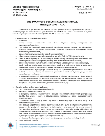 Miejskie Przedsiębiorstwo Wodociągów i Kanalizacji S.A. ul. Senatorska 1 30-106 Kraków Wersja 3 F4-5-9 Obowiązuje od 25.09.2014 DRUK NR ITT-4 SPIS ZAWARTOŚCI DOKUMENTACJI PROJEKTOWEJ PRZYŁĄCZY WOD – KAN. Dokumentacja projektowa w zakresie budowy przyłącza wodociągowego i/lub przyłącza kanalizacyjnego dla nieruchomości, przedkładana do MPWiK S.A. wraz z wnioskiem o wydanie warunków przyłączenia nieruchomości (DRUK NR ITT-3) winna zawierać: 1. Część opisową, w skład której wchodzą: spis treści, temat, zakres opracowania oraz dane dotyczące osoby ubiegającej się o przyłączenie/Inwestora, opis techniczny rozwiązań projektowanych określający warunki, metodę i sposób realizacji przyłączy (oraz w sytuacjach koniecznych likwidacji istniejących rurociągów), wykaz zastosowanych materiałów, opis geotechnicznych warunków posadowienia przyłączy, bilans zapotrzebowania na wodę z podaniem wartości Qdśr [m3/d] i Qhmax [dm3/s], bilans ścieków bytowych i przemysłowych (dla kanalizacji sanitarnej) oraz dodatkowo wód opadowych (dla kanalizacji ogólnospławnej) wraz z obliczeniami hydraulicznymi, obliczenia w zakresie wymiarowania średnic przyłącza wodociągowego i kanalizacyjnego, dobór średnicy wodomierza, przeprowadzony zgodnie z wytycznymi doboru wodomierzy dostępnymi na stronie internetowej MPWiK S.A. (www.mpwik.krakow.pl), obliczenie wartości wymaganego ciśnienia wody dla zapewnienia prawidłowych warunków zasilania w wodę obiektu, na podstawie parametrów ciśnienia dyspozycyjnego w sieci wodociągowej i analizy strat, w sytuacjach koniecznych obliczenia hydrauliczne w zakresie wymiarowania i doboru innych urządzeń montowanych na instalacji wodociągowej lub kanalizacyjnej, takich jak zestawy hydroforowe, zbiorniki p.poż., pompownie ścieków, zbiorniki retencyjne wraz z regulatorami przepływu, urządzenia podczyszczające ścieki przemysłowe, itp. 2. Część formalną, w skład której wchodzą: tytuł prawny do korzystania z nieruchomości, informacja techniczna MPWiK S.A., w przypadku obiektów projektowanych - decyzja o warunkach zabudowy dla przyłączanego obiektu lub wypis i wyrys z obowiązującego miejscowego planu zagospodarowania przestrzennego, uzgodnienie trasy przyłączy wodociągowego i kanalizacyjnego z zarządcą drogi wraz z załącznikiem graficznym, inne decyzje, uzgodnienia, opinie, zgody i porozumienia (wraz z załącznikami graficznymi), stosowne do przyjętych rozwiązań projektowych i uwarunkowań terenowo-prawnych (np. przejście przyłączem przez teren nie stanowiący własności osoby ubiegającej się o przyłączenie, prowadzenie przyłączy pod rowami, przepustami, ciekami wodnymi, wzdłuż rzek, wałów przeciwpowodziowych, torowisk, w rejonie przewodów i słupów energetycznych wysokiego napięcia, gazociągów wysokiego ciśnienia, itp.), w sytuacjach koniecznych, opinie konstrukcyjne opracowane stosownie do potrzeb, mapa ewidencji gruntów, STRONA 1/2 Wersja 3 F4-5-9 Obowiązuje od 25.09.2014 wypisy z rejestru gruntów działek, w których zaprojektowane zostały przyłącza oraz instalacje wodociągowe i kanalizacyjne, oryginał potwierdzenia na mapie do celów projektowych lokalizacji i parametrów istniejącego uzbrojenia wod–kan. (średnice, materiał i rzędne posadowienia) dokonanego przez Dział Dokumentacji i Odbiorów MPWiK S.A. 3. Część rysunkową, w skład której wchodzą: projekt zagospodarowania terenu sporządzony na aktualnej mapie do celów projektowych w skali 1:500 (gwarantującej czytelność opracowania) wraz z trasą projektowanych przyłączy i instalacji wodociągowych i kanalizacyjnych oraz lokalizacją armatury, urządzeń i ewentualnych komór przewiertowych, profile podłużne przyłączy i instalacji wodociągowych i kanalizacyjnych z rozwinięciem poziomu kanalizacyjnego w skali 1:100/100, w nawiązaniu do rzędnej najniższej kondygnacji obiektu i zainstalowanych na tej kondygnacji przyborów i urządzeń sanitarnych, profile podłużne powinny zawierać wszystkie elementy uzbrojenia i projektowane urządzenia z uwzględnieniem szczegółu węzła włączeniowego do sieci wodociągowej i kanalizacyjnej oraz zestawu wodomierza głównego (w budynku lub w studni wodomierzowej), rzut najniższej kondygnacji (piwnica, przyziemie, parter) w skali 1:100 lub 1:50, z trasami przyłączy i instalacji wodociągowych i kanalizacyjnych, w nawiązaniu do granic działki i sieci, z lokalizacją zestawu wodomierza głównego, poziomem kanalizacyjnym i innych urządzeń, na rzucie poziomym najniższej kondygnacji należy podać niezbędne wymiary w zakresie rozmieszczenia projektowanych przewodów względem siebie i obiektów zagospodarowania terenu oraz ich parametry z uwzględnieniem zastosowanej armatury i urządzeń, węzły włączeniowe przyłączy wodociągowego i kanalizacyjnego do sieci, rysunki szczegółowe zestawu wodomierza głównego (w budynku lub w studni wodomierzowej), studzienek kanalizacyjnych, oraz inne rysunki wymagane w zależności od sytuacji, np. rysunek zbiornika retencyjnego wraz z regulatorem przepływu, rysunek sposobu przejść przyłączami pod przeszkodami terenowymi (rowy, przepusty, itp.), rysunek rozwiązania kolizji z infrastrukturą podziemną, rysunki przedstawiające szczegóły przejść metodami bezwykopowymi. W przypadku doprowadzenia wody z ujęcia lokalnego (studnia) lub lokalnego odprowadzenia ścieków (zbiornik bezodpływowy na nieczystości ciekłe, przydomowa oczyszczalnia ścieków), w dokumentacji projektowej należy podać informację na ten temat i przedstawić ogólny schemat zastosowanego rozwiązania. W przypadkach, gdy rozwiązania projektowe w zakresie zasilania w wodę i odprowadzenia ścieków zakładają wykorzystanie istniejących przyłączy i dotyczą wyłącznie rozbudowy/przebudowy instalacji wodociągowej i kanalizacyjnej (np. w przypadku rozbudowy, przebudowy, nadbudowy istniejącego budynku, itp), w d