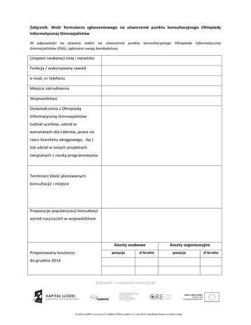 Załącznik. Wzór formularza zgłoszeniowego na utworzenie punktu konsultacyjnego Olimpiady Informatycznej Gimnazjalistów W odpowiedzi na otwarty nabór na utworzenie punktu konsultacyjnego Olimpiady Informatycznej Gimnazjalistów (OIG), zgłaszam swoją kandydaturę. (stopień naukowy) Imię i nazwisko Funkcja / wykonywany zawód e-mail, nr telefonu Miejsce zatrudnienia Województwo Doświadczenia z Olimpiadą Informatyczną Gimnazjalistów (udział uczniów, udział w warsztatach dla Liderów, prace na rzecz Komitetu okręgowego, itp.) lub udział w innych projektach związanych z nauką programowania. Terminarz (ilość planowanych konsultacji) i miejsce Propozycje popularyzacji konsultacji wśród nauczycieli w województwie Koszty osobowe Proponowany kosztorys pozycja zł brutto do grudnia 2014 Człowiek – najlepsza inwestycja Koszty organizacyjne pozycja zł brutto Wyrażam zgodę na przetwarzanie powyższych danych osobowych na potrzeby projektu „Opracowanie i wdrożenie kompleksowego systemu pracy z uczniem zdolnym” realizowanego przez Ośrodek Rozwoju Edukacji ze środków Europejskiego Funduszu Społecznego, w którym jednym z zadań jest Olimpiada Informatyczna Gimnazjalistów. …………………………….. (miejscowość, data) …………………………….. (podpis) Człowiek – najlepsza inwestycja Deklaracja utworzenia punktu konsultacyjnego Olimpiady Informatycznej Gimnazjalistów w ramach projektu „Opracowanie i wdrożenie kompleksowego systemu pracy z uczniem zdolnym” realizowanego przez Ośrodek Rozwoju Edukacji ze środków Europejskiego Funduszu Społecznego, w którym jednym z zadań jest Olimpiada Informatyczna Gimnazjalistów. Deklaruję możliwość utworzenia punktu konsultacyjnego Olimpiady Informatycznej Gimnazjalistów (październik-grudzień 2014 r.), w ramach projektu „Opracowanie i wdrożenie kompleksowego systemu pracy z uczniem zdolnym” , którego wykonawcą jest Stowarzyszenie Talent (www.talent.edu.pl) w szkole …………………………………………………………………………………………………………………………………………… Jednocześnie wskazujemy Panią/Pana ………………………………………………………………………….................. jako nauczyciela informatyki (instruktora) odpowiedzialnego za realizację zadania w szkole. ……………………………………………………………… podpis Dyrektora szkoły, data i pieczątka Człowiek – najlepsza inwestycja