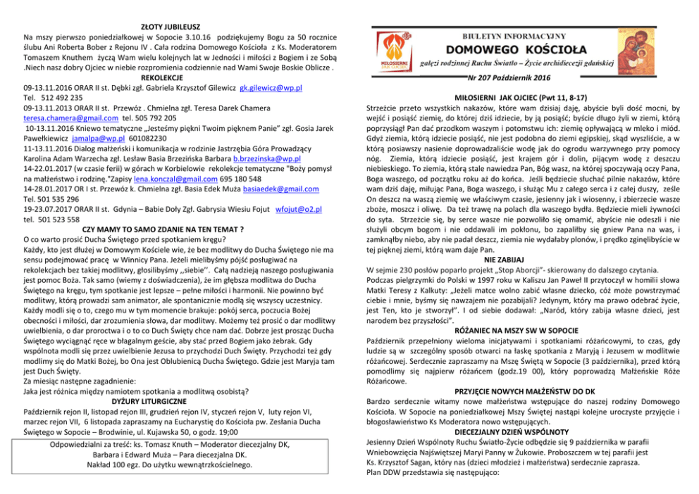 ZŁOTY JUBILEUSZ Na mszy pierwszo poniedziałkowej w Sopocie 3.10.16 podziękujemy Bogu za 50 rocznice ślubu Ani Roberta Bober z Rejonu IV . Cała rodzina Domowego Kościoła z Ks. Moderatorem Tomaszem Knuthem życzą Wam wielu kolejnych lat w Jedności i miłości z Bogiem i ze Sobą .Niech nasz dobry Ojciec w niebie rozpromienia codziennie nad Wami Swoje Boskie Oblicze . REKOLEKCJE 09-13.11.2016 ORAR II st. Dębki zgł. Gabriela Krzysztof Gilewicz [email protected] Tel. 512 492 235 09-13.11.2013 ORAR II st. Przewóz . Chmielna zgł. Teresa Darek Chamera [email protected] tel. 505 792 205 10-13.11.2016 Kniewo tematyczne „Jesteśmy piękni Twoim pięknem Panie” zgł. Gosia Jarek Pawełkiewicz [email protected] 601082230 11-13.11.2016 Dialog małżeoski i komunikacja w rodzinie Jastrzębia Góra Prowadzący Karolina Adam Warzecha zgł. Lesław Basia Brzezioska Barbara [email protected] 14-22.01.2017 (w czasie ferii) w górach w Korbielowie rekolekcje tematyczne "Boży pomysł na małżeostwo i rodzinę."Zapisy [email protected] 695 180 548 14-28.01.2017 OR I st. Przewóz k. Chmielna zgł. Basia Edek Muża [email protected] Tel. 501 535 296 19-23.07.2017 ORAR II st. Gdynia – Babie Doły Zgł. Gabrysia Wiesiu Fojut [email protected] tel. 501 523 558 CZY MAMY TO SAMO ZDANIE NA TEN TEMAT ? O co warto prosid Ducha Świętego przed spotkaniem kręgu? Każdy, kto jest dłużej w Domowym Kościele wie, że bez modlitwy do Ducha Świętego nie ma sensu podejmowad pracę w Winnicy Pana. Jeżeli mielibyśmy pójśd posługiwad na rekolekcjach bez takiej modlitwy, głosilibyśmy ,,siebie’’. Całą nadzieją naszego posługiwania jest pomoc Boża. Tak samo (wiemy z doświadczenia), że im głębsza modlitwa do Ducha Świętego na kręgu, tym spotkanie jest lepsze – pełne miłości i harmonii. Nie powinno byd modlitwy, którą prowadzi sam animator, ale spontanicznie modlą się wszyscy uczestnicy. Każdy modli się o to, czego mu w tym momencie brakuje: pokój serca, poczucia Bożej obecności i miłości, dar zrozumienia słowa, dar modlitwy. Możemy też prosid o dar modlitwy uwielbienia, o dar proroctwa i o to co Duch Święty chce nam dad. Dobrze jest prosząc Ducha Świętego wyciągnąd ręce w błagalnym geście, aby stad przed Bogiem jako żebrak. Gdy wspólnota modli się przez uwielbienie Jezusa to przychodzi Duch Święty. Przychodzi też gdy modlimy się do Matki Bożej, bo Ona jest Oblubienicą Ducha Świętego. Gdzie jest Maryja tam jest Duch Święty. Za miesiąc następne zagadnienie: Jaka jest różnica między namiotem spotkania a modlitwą osobistą? DYŻURY LITURGICZNE Październik rejon II, listopad rejon III, grudzieo rejon IV, styczeo rejon V, luty rejon VI, marzec rejon VII, 6 listopada zapraszamy na Eucharystię do Kościoła pw. Zesłania Ducha Świętego w Sopocie – Brodwinie, ul. Kujawska 50, o godz. 19;00 Odpowiedzialni za treśd: ks. Tomasz Knuth – Moderator diecezjalny DK, Barbara i Edward Muża – Para diecezjalna DK. Nakład 100 egz. Do użytku wewnątrzkościelnego. Nr 207 Październik 2016 MIŁOSIERNI JAK OJCIEC (Pwt 11, 8-17) Strzeżcie przeto wszystkich nakazów, które wam dzisiaj daję, abyście byli dośd mocni, by wejśd i posiąśd ziemię, do której dziś idziecie, by ją posiąśd; byście długo żyli w ziemi, którą poprzysiągł Pan dad przodkom waszym i potomstwu ich: ziemię opływającą w mleko i miód. Gdyż ziemia, którą idziecie posiąśd, nie jest podobna do ziemi egipskiej, skąd wyszliście, a w którą posiawszy nasienie doprowadzaliście wodę jak do ogrodu warzywnego przy pomocy nóg. Ziemia, którą idziecie posiąśd, jest krajem gór i dolin, pijącym wodę z deszczu niebieskiego. To ziemia, którą stale nawiedza Pan, Bóg wasz, na której spoczywają oczy Pana, Boga waszego, od początku roku aż do kooca. Jeśli będziecie słuchad pilnie nakazów, które wam dziś daję, miłując Pana, Boga waszego, i służąc Mu z całego serca i z całej duszy, ześle On deszcz na waszą ziemię we właściwym czasie, jesienny jak i wiosenny, i zbierzecie wasze zboże, moszcz i oliwę. Da też trawę na polach dla waszego bydła. Będziecie mieli żywności do syta. Strzeżcie się, by serce wasze nie pozwoliło się omamid, abyście nie odeszli i nie służyli obcym bogom i nie oddawali im pokłonu, bo zapaliłby się gniew Pana na was, i zamknąłby niebo, aby nie padał deszcz, ziemia nie wydałaby plonów, i prędko zginęlibyście w tej pięknej ziemi, którą wam daje Pan. NIE ZABIJAJ W sejmie 230 posłów poparło projekt „Stop Aborcji”- skierowany do dalszego czytania. Podczas pielgrzymki do Polski w 1997 roku w Kaliszu Jan Paweł II przytoczył w homilii słowa Matki Teresy z Kalkuty: „Jeżeli matce wolno zabid własne dziecko, cóż może powstrzymad ciebie i mnie, byśmy się nawzajem nie pozabijali? Jedynym, który ma prawo odebrad życie, jest Ten, kto je stworzył”. I od siebie dodawał: „Naród, który zabija własne dzieci, jest narodem bez przyszłości”. RÓŻANIEC NA MSZY SW W SOPOCIE Październik przepełniony wieloma inicjatywami i spotkaniami różaocowymi, to czas, gdy ludzie są w szczególny sposób otwarci na łaskę spotkania z Maryją i Jezusem w modlitwie różaocowej. Serdecznie zapraszamy na Mszę Świętą w Sopocie (3 października), przed którą pomodlimy się najpierw różaocem (godz.19 00), który poprowadzą Małżeoskie Róże Różaocowe. PRZYJĘCIE NOWYCH MAŁŻEOSTW DO DK Bardzo serdecznie witamy nowe małżeostwa wstępujące do naszej rodziny Domowego Kościoła. W Sopocie na poniedziałkowej Mszy Świętej nastąpi kolejne uroczyste przyjęcie i błogosławieostwo Ks Moderatora nowo wstępujących. DIECEZJALNY DZIEO WSPÓLNOTY Jesienny Dzieo Wspólnoty Ruchu Światło-Życie odbędzie się 9 października w parafii Wniebowzięcia Najświętszej Maryi Panny w Żukowie. Proboszczem w tej parafii jest Ks. Krzysztof Sagan, który nas (dzieci młodzież i małżeostwa) serd