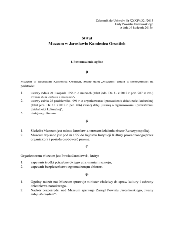Załącznik do Uchwały Nr XXXIV/321/2013 Rady Powiatu Jarosławskiego z dnia 29 kwietnia 2013r. Statut Muzeum w Jarosławiu Kamienica Orsettich I. Postanowienia ogólne §1 Muzeum w Jarosławiu Kamienica Orsettich, zwane dalej „Muzeum" działa w szczególności na podstawie: 1. 2. 3. ustawy z dnia 21 listopada 1996 r. o muzeach (tekst jedn. Dz. U. z 2012 r. poz. 987 ze zm.) zwanej dalej „ustawą o muzeach", ustawy z dnia 25 października 1991 r. o organizowaniu i prowadzeniu działalności kulturalnej (tekst jedn. Dz. U. z 2012 r. poz. 406) zwanej dalej „ustawą o organizowaniu i prowadzeniu działalności kulturalnej", niniejszego Statutu. §2 1. 2. Siedzibą Muzeum jest miasto Jarosław, a terenem działania obszar Rzeczypospolitej. Muzeum wpisane jest pod nr 1/99 do Rejestru Instytucji Kultury prowadzonego przez organizatora i posiada osobowość prawną. §3 Organizatorem Muzeum jest Powiat Jarosławski, który: 1. 2. zapewnia środki potrzebne do jego utrzymania i rozwoju, zapewnia bezpieczeństwo zgromadzonym zbiorom. §4 1. 2. Ogólny nadzór nad Muzeum sprawuje minister właściwy do spraw kultury i ochrony dziedzictwa narodowego. Nadzór bezpośredni nad Muzeum sprawuje Zarząd Powiatu Jarosławskiego, zwany dalej „Zarządem". §5 Muzeum uŜywa pieczęci kwadratowej z napisem „Muzeum w Jarosławiu Kamienica Orsettich" z podaniem adresu, telefonu, faksu, NIP i Regon. II. Cele i zadania Muzeum §6 Celem Muzeum jest działalność określona w art. 1 ustawy o muzeach. §7 Muzeum jest samorządową instytucją kultury, która w szczególności: 1. 2. 3. 4. 5. gromadzi, przechowuje i udostępnia zbiory dotyczące historii miasta Jarosławia i powiatu jarosławskiego, organizuje i prowadzi badania naukowe oraz badania archeologiczne, organizuje wystawy stałe, czasowe i objazdowe, współdziała w upowszechnianiu nauki i sztuki z muzeami, instytucjami, organizacjami i stowarzyszeniami o podobnych celach działającymi w kraju i za granicą prowadzi działalność wydawniczą - publikacje, katalogi, przewodniki wystaw, wyniki badań naukowych, wykopalisk oraz wydaje wydawnictwa naukowe i popularno naukowe z zakresu swej działalności. §8 Muzeum w szczególności gromadzi zabytki i materiały dokumentacyjne dotyczące historii regionu, kultury mieszczańskiej, kultury ludowej materialnej i niematerialnej, dzieła sztuk plastycznych: rzeźby, malarstwa, dekoracji, grafiki, iluminatorstwa, rzemiosł artystycznych, rzemiosł ludowych, broni, strojów, numizmatyki, sfragistyki, fotografii, oraz zabytki archeologiczne. §9 Dla wykonywania zadań określonych w § 7 Muzeum w szczególności: 1. uzupełniania zbiory poprzez nowe nabytki uzyskane drogą zakupu, darowizn, depozytów, 2. inwentaryzuje, kataloguje, opracowuje naukowo zgromadzone muzealia i materiały dokumentacyjne, 3. uzupełnia zbiory biblioteczne w zakresie dyscyplin reprezentowanych w Muzeum, 4. przechowuje zgromadzone muzealia w warunkach zapewniających im bezpieczeństwo, magazynuje je w sposób dostępny dla celów naukowych, 5. zabezpiecza i konserwuje muzealia, w miarę moŜliwości zabezpiecza stanowiska archeologiczne, 6. uŜycza muzealia i przyjmuje w depozyt zabytki zgodnie z obowiązującymi przepisami, 7. udziela informacji, porad, pomocy w zakresie objętym działalnością, 8. zapewnia właściwe warunki zwiedzania i korzystania ze zbiorów. III. Organizacja Muzeum §10 1. 2. 3. Muzeum posiada działy i oddział. Oddziałem Muzeum jest Muzeum Dzieduszyckich w Zarzeczu. Organizację wewnętrzną Muzeum oraz zakres zadań działów i oddziału określa regulamin organizacyjny nadawany przez dyrektora po zasięgnięciu opinii organizatora oraz działających w Muzeum organizacji związkowych i stowarzyszeń twórców. IV. Kierownictwo Muzeum §11 1. 2. 3. 4. Na czele Muzeum stoi Dyrektor, którego powołuje i odwołuje Zarząd w trybie i na zasadach określonych w obowiązujących przepisach. Dyrektor kieruje Muzeum przy pomocy wicedyrektora. Wicedyrektora powołuje i odwołuje Zarząd na wniosek Dyrektora. Oddział - Muzeum Dzieduszyckich w Zarzeczu prowadzi kierownik, którego powołuje i odwołuje Dyrektor. §12 1. Do zakresu działania Dyrektora naleŜy w szczególności: 1) zarządzanie Muzeum i reprezentowanie go na zewnątrz, 2) sprawowanie kierownictwa w sprawach naukowo - badawczych, oświatowych, organizacyjnych, administracyjnych i gospodarczych, 3) nadzór nad zbiorami i ich ewidencjonowaniem oraz nad majątkiem Muzeum, 4) przedstawianie właściwym instytucjom i organom nadzoru planów rzeczowych i finansowych oraz sprawozdań, 5) stwarzanie warunków do podnoszenia kwalifikacji zawodowych pracowników, 6) czuwanie nad racjonalnym i efektywnym gospodarowaniem posiadanymi środkami finansowymi i materiałowymi, 7) wydawanie zarządzeń, 8) zawieranie i rozwiązywanie umów o pracę z pracownikami Muzeum oraz podejmowanie decyzji wynikających ze stosunku pracy. 2. Zakres działania wicedyrektora i kierownika oddziału określa Dyrektor w regulaminie organizacyjnym Muzeum. V. Rada Muzeum §13 1. 2. 3. 4. Przy Muzeum działa Rada Muzeum. Członków Rady Muzeum, w liczbie 10 osób powołuje i odwołuje Zarząd. Rada Muzeum działa w zakresie określonym w art. 11 ustawy o muzeach. Szczegółowy tryb pracy Rady Muzeum określa uchwalony przez nią Regulamin. VI. Majątek i finanse Muzeum §14 Majątek Muzeum wykorzystuje się jedynie dla realizacji celów wynikających z zakresu działania Muzeum. §15 1. Muzeum prowadzi gospodarkę finansową na zasadach określonych w ustawie o organizowaniu i prowadzeniu działalności kulturalnej. 2. Podstawą gospodarki finansowej Muzeum jest plan finansowy ustalany przez dyrektora Muzeum, z zachowaniem wysokości dotacji organizatora. 3. Muzeum samodzielnie dokonuje zmian w planie finansowy. 4. Muzeum pokrywa koszty bieŜącej działalności i zobowiązania z uzyskiwanych przychodów. 5. Działalność Muzeum jest finansowana ze środków publicznych w ram