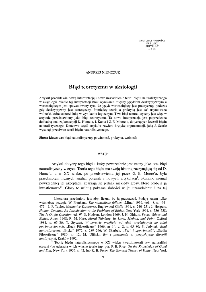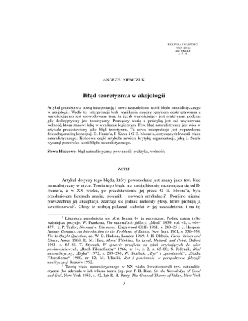 KULTURA I WARTOŚCI NR 3 (2012) ARTYKUŁY s. 7–35 ANDRZEJ NIEMCZUK Błąd teoretyzmu w aksjologii Artykuł przedstawia nową interpretację i nowe uzasadnienie teorii błędu naturalistycznego w aksjologii. Wedle tej interpretacji brak wynikania między językiem deskryptywnym a wartościującym jest spowodowany tym, że język wartościujący jest praktyczny, podczas gdy deskryptywny jest teoretyczny. Pomiędzy teorią a praktyką jest zaś usytuowana wolność, która stanowi lukę w wynikaniu logicznym. Tzw. błąd naturalistyczny jest więc w artykule przedstawiony jako błąd teoretyzmu. Ta nowa interpretacja jest poprzedzona dokładną analizą koncepcji D. Hume’a, I. Kanta i G. E. Moore’a, dotyczących kwestii błędu naturalistycznego. Końcowa część artykułu zawiera krytykę argumentacji, jaką J. Searle wysunął przeciwko teorii błędu naturalistycznego. Słowa kluczowe: błąd naturalistyczny, powinność, praktyka, wolność; WSTĘP Artykuł dotyczy tego błędu, który powszechnie jest znany jako tzw. błąd naturalistyczny w etyce. Teoria tego błędu ma swoją historię zaczynającą się od D. Hume’a, a w XX wieku, po przedstawieniu jej przez G. E. Moore’a, była przedmiotem licznych analiz, polemik i nowych artykulacji1. Pomimo niemal powszechnej jej akceptacji, zdarzają się jednak niekiedy głosy, które próbują ją kwestionować2. Głosy te usiłują pokazać słabości w jej uzasadnieniu i na tej 1 Literatura przedmiotu jest zbyt liczna, by ją przytaczać. Podaję zatem tylko ważniejsze pozycje: W. Frankena, The naturalistic fallacy, „Mind“ 1939, vol. 48, s. 464– 477; J. P. Taylor, Normative Discourse, Englewood Cliffs 1961, s. 240–251; J. Hospers, Human Conduct. An Introduction to the Problems of Ethics, New York 1961, s. 536–538; The Is-Ought Question, ed. W. D. Hudson, London 1969; J. H. Olthuis, Facts, Values and Ethics, Assen 1968; R. M. Hare, Moral Thinking. Its Level, Method, and Point, Oxford 1981, s. 65–86; T. Styczeń, W sprawie przejścia od zdań orzekających do zdań powinnościowych, „Ruch Filozoficzny“ 1966, nr 14, z. 2, s. 65–80; S. Jedynak, Błąd naturalistyczny, „Etyka“ 1972, s. 289–296; W. Skarbek, „Byt“ i „powinność“, „Studia Filozoficzne“ 1980, nr 12; M. Uliński, Byt i powinność w perspektywie filozofii analitycznej, Kraków 1992. 2 Teorię błędu naturalistycznego w XX wieku kwestionowali tzw. naturaliści etyczni (bo uderzała w ich własne teorie (np. por. P. B. Rice, On the Knowledge of Good and Evil, New York 1955, s. 42, lub R. B. Perry, The General Theory of Value, New York 7 ANDRZEJ NIEMCZUK – BŁĄD TEORETYZMU W AKSJOLOGII podstawie ją zdyskredytować. Ponieważ kwestia błędu naturalistycznego w jej ogólnej charakterystyce jest powszechnie znana i wielokrotnie była prezentowana, to nie będę jej całej w sposób historyczny skrupulatnie wykładał. To, co mnie w niej interesuje, to samo jej meritum oraz – przede wszystkim – uzasadnienie. Uzasadnienie to bowiem jest najbardziej kontrowersyjnym elementem teorii. U różnych autorów jest ono formułowane odmiennie, co pozwala niektórym na kwestionowanie samej teorii. Uzasadnienie to przy tym – moim zdaniem – nie jest zadowalające i wymaga radykalnej modyfikacji. Celem artykułu jest zatem przedstawienie nowego uzasadnienia dla teorii tzw. błędu naturalistycznego, a tym samym pokazanie, że błąd ten nie jest w istocie mankamentem tylko różnorakich stanowisk naturalistycznych, jak jednoznacznie sugeruje jego nazwa. Tezą artykułu jest twierdzenie, że błąd, o którym mowa, polega na pomieszaniu myślenia teoretycznego z praktycznym, a dokładniej na tym, że w perspektywie filozofii teoretycznej (lub teorii naukowej) próbuje się ująć i wytłumaczyć to – przede wszystkim wartości, ale nie tylko – co w tej perspektywie jest nieujmowalne i niewytłumaczalne. Tak zwany błąd naturalizmu jest więc w istocie błędem teoretyzmu. HUME W Traktacie o naturze ludzkiej D. Hume napisał: „W każdym systemie moralności stwierdzałem zawsze, że autor przez pewien czas idzie zwykłą drogą rozumowania, ustala istnienie Boga, albo robi spostrzeżenia dotyczące spraw ludzkich, aż nagle i nieoczekiwanie ze zdziwieniem znajduję, iż zamiast zwykłych spójek, jakie znajduje się w zdaniach, a mianowicie »jest« i »nie jest«, nie spotykam żadnego zdania, które by nie było powiązane słowem »powinien« albo »nie powinien«. Ta zmiana jest niedostrzegalna, lecz niemniej ma wielką doniosłość. Wobec tego bowiem, że to »powinien« albo »nie powinien« jest wyrazem pewnego nowego stosunku czy twierdzenia, przeto jest rzeczą konieczną te zwroty zauważyć i wyjaśnić; a jednocześnie konieczne jest, iżby wskazana została racja tego, co wydaje się całkiem niezrozumiałe, a mianowicie, jak ten nowy stosunek może być wydedukowany z innych stosunków, które są całkiem różne od niego”3. Przytoczony fragment jest słynnym sformułowaniem argumentu zwanego „gilotyną Hume’a“ i stanowi historycznie pierwszą wersję tej teorii, którą G. E. Moore na początku XX wieku przedstawi i nazwie teorią błędu naturalistycznego w etyce. To spostrzeżenie Hume’a jest w jego pismach uwagą marginalną, której 1926). Z drugiej strony, kwestionowanie tej teorii można spotkać w metafizyce A. N. Whiteheada, gdzie usiłuje się podważyć sam podział na wiedzę opisową i normatywną. Ostatnimi czasy podział ten próbował zanegować A. MacIntyre (por. tegoż, Dziedzictwo cnoty, tłum. A. Chmielewski, Warszawa 1996). 3 D. Hume, Traktat o naturze ludzkiej, tłum. Cz. Znamierowski, Warszawa 1963, t. II, s. 259–260. 8 ANDRZEJ NIEMCZUK – BŁĄD TEORETYZMU W AKSJOLOGII nigdzie więcej nie wyjaśnia, ani też w swojej pozytywnej teorii etycznej nie przestrzega4. Co w istocie stwierdza ta uwaga? Hume w niej zauważa, jak się zdaje, dwie kwestie. Po pierwsze, że zdania ze spójką „po