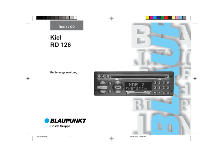 Radio / CD Kiel RD 126 Bedienungsanleitung Kiel RD126 d® 1 03.05.2002, 12:28 Uhr Inhaltsverzeichnis Kurzanleitung ................................. 4 Wichtige Hinweise .......................... 9 Was Sie unbedingt lesen sollten ............ 9 Verkehrssicherheit .................................. 9 Einbau ..................................................... 9 Telefon-Mute ........................................... 9 Zubehör ................................................... 9 Diebstahlschutzsystem KeyCard ........................................ 10 Gerät in Betrieb nehmen ...................... 10 KeyCard entnehmen ............................. 10 Zweite KeyCard “anlernen” / KeyCard ersetzen ................................. 10 Radiopaß-Daten anzeigen ................... 10 Short Additional Memory (S.A.M.) ........ 11 Turn On Message (T.O.M.) .................. 11 Optische Anzeige als Diebstahlsicherung .............................................. 11 Pflege der KeyCard .............................. 11 Betriebsart wählen ....................... 12 Radiobetrieb mit RDS .................. 12 CD-Betrieb .................................... 19 CD-Betrieb einschalten ......................... 19 CD einlegen .......................................... 19 CD herausnehmen ................................ 19 Titel wählen ........................................... 19 MIX ........................................................ 19 Anzeigeart wählen ................................ 19 Anzeigeart speichern ............................ 20 SCAN .................................................... 20 Programmierung mit DSC ........... 20 Übersicht der werkseitigen Grundeinstellung mit DSC .............................. 22 Anhang .......................................... 22 Technische Daten ................................. 22 Verkehrsfunkempfang mit RDS-EON ....................................... 17 Vorrang für Verkehrsfunk ein-/ausschalten ................................... 17 Warnton ................................................ 17 Warnton abschalten .......................... 17 Automatischer Suchlaufstart ................ 18 Lautstärke für Verkehrsfunkdurchsage und Warnton einstellen ....... 18 GEO für Verkehrsfunkdurchsage und Warnton einstellen ................................ 18 2 Kiel RD126 d® 2 03.05.2002, 12:28 Uhr 3 AF - Alternativ-Frequenz ...................... 12 REG-Regional ....................................... 12 Senderabstimmung .............................. 13 Sendersuchlauf / ......................... 13 Manuell abstimmen mit << >> ........... 13 Blättern in den Senderketten ................ 13 Speicherebene wechseln ..................... 13 Sender speichern ................................. 14 Stärkste Sender automatisch speichern mit Travelstore ...................................... 14 Gespeicherte Sender abrufen .............. 14 Gespeicherte Sender anspielen mit Preset Scan .................................... 14 Sender anspielen mit Radio-Scan ........ 14 Anspielzeit (Scan) ändern .................... 14 Empfindlichkeit des Sendersuchlaufs verändern .............................................. 15 Stereo - Mono umschalten ................... 15 PTY – Programm-Typ (Art) .................. 15 PTY ein-/ausschalten ........................ 15 Programmart ......................................... 15 Programmart des Senders abfragen 15 Gewählte Programmart anzeigen ..... 15 Programmart auswählen ................... 16 Progammart speichern ...................... 16 Sender mit PTY-SCAN anspielen ..... 16 PTY-Vorrang ..................................... 16 DEUTSCH ENGLISH 17 FRANÇAIS 18 16 15 ITALIANO 20 19 1 NEDERLANDS 14 SVENSKA 13 3 4 5 6 7 8 9 10 11 12 PORTUGUÊS ESPAÑOL 2 3 Kiel RD126 d® 3 03.05.2002, 12:28 Uhr Kurzanleitung 1 Ein-/Ausschalten mit ON: ON drücken Zum Einschalten mit ON muß die KeyCard eingeschoben sein, das Gerät spielt in voreingestellter Lautstärke. Aus-/Einschalten mit der KeyCard: Das Gerät muß mit ON eingeschaltet sein. Hinweis: Lesen Sie dazu unbedingt die Informationen unter “Diebstahlschutzsystem KeyCard”. Aus-/Einschalten über Zündung: Wenn das Gerät entsprechend angeschlossen ist, kann es über die Zündung des Fahrzeugs aus- und wieder eingeschaltet werden. Nach Ausschalten der Zündung erinnert ein Doppel-Beep daran, daß vor Verlassen des Fahrzeugs die KeyCard entnommen werden sollte. Einschalten bei ausgeschalteter Zündung Bei ausgeschalteter Zündung (KeyCard eingeschoben) kann das Gerät so weiter betrieben werden: Nach dem Doppel-Beep ON drücken. Das Gerät wird eingeschaltet. Nach einer Spielzeit von einer Stunde schaltet das Gerät zum Schutz der Fahrzeug-Batterie automatisch aus. 2 VOL+ / VOLLautstärke verändern. Nach dem Einschalten spielt das Gerät in voreingestellter Lautstärke (VOL FIX). VOL FIX kann verändert werden (siehe “Programmierung mit DSC”). 3 Lautstärke schlagartig verändern. Durch Drücken der -Taste besteht die Möglichkeit, schnell leise zu stellen. Das Display zeigt “MUTE” (stumm). Diese Funktion wird wieder aufgehoben durch Drücken der -Taste oder VOL+. Wird VOL- gedrückt, ist die Normallautstärke um einen Stellwert geringer (Mute)-Lautstärke. als die Die Mute-Lautstärke ist so programmierbar: • gewünschte Lautstärke einstellen • 2 Sek. drücken (Beep ertönt). Diese Lautstärke ist als Mute-Lautstärke gespeichert. Zusatzfunktion Speichertaste im DSC-Menü. 4 FM - UKW Umschalter für die UKW-Speicherebenen I, II. Umschalten der Speicherebenen: FM drücken. Im Display wird FM I oder FM II angezeigt. 5 TS - Travelstore Zum automatischen Speichern der sechs stärksten Sender mit Travelstore: Speichern: TS drücken, bis Suchlauf in der Anzeige beginnt. Abrufen: TS drücken. Im Display erscheint “T”. Danach eine der Stationstasten 1, 2, 3, 4, 5, 6 kurz drücken. 4 Kiel RD126 d® 4 03.05.2002, 12:28 Uhr DEUTSCH 6 Wippe 7 Display CD-Betrieb d ENGL