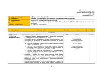 Załącznik do Uchwały Nr 50/15 Komitetu Monitorującego RPO WM na lata 2014-2020 z dnia 6 listopada 2015 r. nr i nazwa osi priorytetowej 8 OŚ PRIORYTETOWA RYNEK PRACY nr i nazwa działania Działanie 8.4 Rozwój kompetencji kadr i adaptacja do zmian (PRIORYTET INWESTYCYJNY 8v) nr i nazwa poddziałania Poddziałanie 8.4.1 Rozwój kompetencji kadr sektora MŚP typ projektu A. wsparcie dotyczące podnoszenia kompetencji i/lub kwalifikacji kadr sektora MŚP w ramach podmiotowego finansowania usług rozwojowych tryb wyboru / ścieżka wyboru tryb konkursowy, nabór zamknięty nazwa kryterium definicja kryterium oceniający ocena waga rodzaj KOP tak / nie - indywidulane ocena formalna Kwalifikowalność wnioskodawcy i partnerów (jeśli dotyczy) Ocenie w ramach kryterium podlega, czy: 1. Wnioskodawca i partnerzy (jeśli dotyczy) znajdują się w katalogu typów Beneficjentów w SzOOP dla danego działania / poddziałania / typu projektu, 2. Wnioskodawca i partnerzy (jeśli dotyczy) nie podlegają wykluczeniu z ubiegania się o dofinansowanie, tj. w odniesieniu do Wnioskodawcy i partnerów nie zachodzą przesłanki określone w: a) art. 207 ust. 4 ustawy z dn. 27 sierpnia 2009 r. o finansach publicznych (j.t. Dz.U. z 2013 r., poz. 885, z późn. zm.), b) art. 12 ust. 1 pkt 1 ustawy z dn. 15 czerwca 2012 r. o skutkach powierzania wykonywania pracy cudzoziemcom przebywającym wbrew przepisom na terytorium Rzeczypospolitej Polskiej (Dz.U. z 2012 r., poz. 769), c) art. 9 ust. 1 pkt 2a ustawy z dn. 28 października 2002 r. o odpowiedzialności podmiotów zbiorowych za czyny zabronione pod groźbą kary (j.t. Dz. U. z 2015 r. poz.1212). 3. Wnioskodawca i partnerzy (o ile budżet projektu uwzględnia wydatki partnera) posiadają roczny obrót równy lub wyższy od rocznych wydatków w projekcie. W przypadku, gdy projekt trwa dłużej niż jeden rok kalendarzowy (12 miesięcy) należy wartość obrotu odnieść do roku realizacji projektu, w którym wartość planowanych wydatków jest najwyższa, 4. Wyboru partnera dokonano zgodnie z art. 33 ust. 2 i 3 ustawy z dnia 11 lipca 2014 r. o zasadach realizacji programów w zakresie polityki spójności finansowanych w 1 dopuszczalne wezwanie Wnioskodawcy do przedstawienia wyjaśnień w celu potwierdzenia spełnienia kryterium niespełnienie kryterium skutkuje negatywną oceną projektu perspektywie finansowej 2014-2020 (jeśli dotyczy). Ocena pkt 2 i 4 odbywa się w oparciu o oświadczenia przedstawione przez Wnioskodawcę. Kwalifikowalność projektu Ocenie w ramach kryterium podlega, czy: KOP 1. projekt wpisuje się w typy projektów wskazane dla danego działania / poddziałania, zgodnie z SzOOP i regulaminem konkursu, 2. Wnioskodawca w okresie realizacji projektu prowadzi biuro projektu (lub posiada siedzibę, filię, delegaturę oddział czy inną formę działalności) na terenie województwa małopolskiego z możliwością udostępnienia pełnej dokumentacji wdrażanego projektu oraz zapewnia uczestnikom projektu możliwość osobistego kontaktu z kadrą projektu, 3. projekt jest zgodny z przepisami art. 65 ust. 6 i art. 125 ust. 3 lit. e) i f) Rozporządzenia Parlamentu Europejskiego i Rady (UE) nr 1303/2013 z dn. 17 grudnia 2013 r. tj. Wnioskodawca złożył oświadczenie, że: projekt nie został zakończony w rozumieniu art. 65 ust. 6, nie rozpoczął realizacji projektu przed dniem złożenia wniosku o dofinansowanie albo że realizując projekt przed dniem złożenia wniosku, przestrzegał obowiązujących przepisów prawa dotyczących danej operacji (art. 125 ust. 3 lit. e), projekt nie obejmuje przedsięwzięć będących częścią operacji, które zostały objęte lub powinny były zostać objęte procedurą odzyskiwania zgodnie z art. 71 (trwałość operacji) w następstwie przeniesienia działalności produkcyjnej poza obszar objęty programem, tak / nie - indywidulane - indywidulane dopuszczalne wezwanie Wnioskodawcy do przedstawienia wyjaśnień w celu potwierdzenia spełnienia kryterium niespełnienie kryterium skutkuje negatywną oceną projektu 4. projekt (lub jego część) nie otrzymał dofinansowania z innych środków, 5. okres realizacji projektu jest zgodny z wymaganiami określonymi w regulaminie konkursu, 6. grupa docelowa jest zgodna z zapisami SzOOP oraz Podręcznikiem kwalifikowania wydatków objętych dofinansowaniem w ramach Regionalnego Programu Operacyjnego Województwa Małopolskiego na lata 2014-2020 oraz regulaminem konkursu. Ocena pkt 3 i 4 odbywa się w oparciu o oświadczenia przedstawione przez Wnioskodawcę. Poprawność wypełnienia wniosku i załączników W ramach kryterium ocenie podlega: KOP 1. czy wypełniono wszystkie wymagane pola wniosku, 2. czy zostały przedstawione wszystkie wymagane załączniki (jeśli dotyczy), 3. czy załączniki zostały przygotowane zgodnie z instrukcją (jeśli dotyczy). tak / nie dopuszczalne wezwanie Wnioskodawcy do przedstawienia wyjaśnień w celu potwierdzenia spełnienia kryterium niespełnienie kryterium skutkuje negatywną oceną projektu 2 Regionalny zasięg projektu W ramach kryterium ocenie podlega czy realizacja projektu obejmuje obszar całego województwa małopolskiego. KOP tak / nie - indywidulane - indywidualne - indywidualne - indywidualne dopuszczalne wezwanie Wnioskodawcy do przedstawienia wyjaśnień w celu potwierdzenia spełnienia kryterium niespełnienie kryterium skutkuje negatywną oceną projektu ocena merytoryczna Specyficzne warunki wstępne W ramach kryterium ocenie podlega: KOP 1. czy projekt jest zgodny ze specyficznymi warunkami dotyczącymi danego działania / poddziałania / typu projektu określonymi w SzOOP, dopuszczalne wezwanie Wnioskodawcy do przedstawienia wyjaśnień w celu potwierdzenia spełnienia kryterium 2. poprawność merytoryczna wypełnienia wniosku o dofinansowanie pod kątem zgodności z warunkami określonymi w regulaminie konkursu na podstawie w szczególności wytycznych horyzontalnych Ministra Infrastruktury i Rozwo