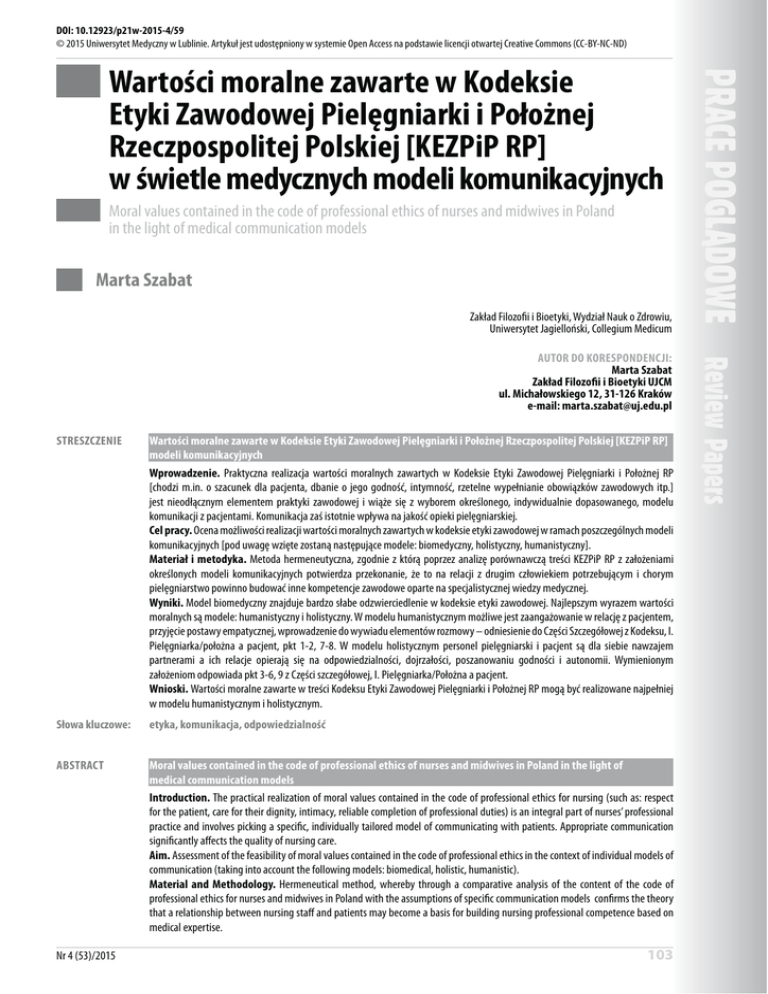 DOI: 10.12923/p21w-2015-4/59 © 2015 Uniwersytet Medyczny w Lublinie. Artykuł jest udostępniony w systemie Open Access na podstawie licencji otwartej Creative Commons (CC-BY-NC-ND) Wartości moralne zawarte w Kodeksie Etyki Zawodowej Pielęgniarki i Położnej Rzeczpospolitej Polskiej [KEZPiP RP] w świetle medycznych modeli komunikacyjnych Moral values contained in the code of professional ethics of nurses and midwives in Poland in the light of medical communication models Marta Szabat Zakład Filozofii i Bioetyki, Wydział Nauk o Zdrowiu, Uniwersytet Jagielloński, Collegium Medicum AUTOR DO KORESPONDENCJI: Marta Szabat Zakład Filozofii i Bioetyki UJCM ul. Michałowskiego 12, 31-126 Kraków e-mail: [email protected] STRESZCZENIE Wartości moralne zawarte w Kodeksie Etyki Zawodowej Pielęgniarki i Położnej Rzeczpospolitej Polskiej [KEZPiP RP] modeli komunikacyjnych Wprowadzenie. Praktyczna realizacja wartości moralnych zawartych w Kodeksie Etyki Zawodowej Pielęgniarki i Położnej RP [chodzi m.in. o szacunek dla pacjenta, dbanie o jego godność, intymność, rzetelne wypełnianie obowiązków zawodowych itp.] jest nieodłącznym elementem praktyki zawodowej i wiąże się z wyborem określonego, indywidualnie dopasowanego, modelu komunikacji z pacjentami. Komunikacja zaś istotnie wpływa na jakość opieki pielęgniarskiej. Cel pracy. Ocena możliwości realizacji wartości moralnych zawartych w kodeksie etyki zawodowej w ramach poszczególnych modeli komunikacyjnych [pod uwagę wzięte zostaną następujące modele: biomedyczny, holistyczny, humanistyczny]. Materiał i metodyka. Metoda hermeneutyczna, zgodnie z którą poprzez analizę porównawczą treści KEZPiP RP z założeniami określonych modeli komunikacyjnych potwierdza przekonanie, że to na relacji z drugim człowiekiem potrzebującym i chorym pielęgniarstwo powinno budować inne kompetencje zawodowe oparte na specjalistycznej wiedzy medycznej. Wyniki. Model biomedyczny znajduje bardzo słabe odzwierciedlenie w kodeksie etyki zawodowej. Najlepszym wyrazem wartości moralnych są modele: humanistyczny i holistyczny. W modelu humanistycznym możliwe jest zaangażowanie w relację z pacjentem, przyjęcie postawy empatycznej, wprowadzenie do wywiadu elementów rozmowy – odniesienie do Części Szczegółowej z Kodeksu, I. Pielęgniarka/położna a pacjent, pkt 1-2, 7-8. W modelu holistycznym personel pielęgniarski i pacjent są dla siebie nawzajem partnerami a ich relacje opierają się na odpowiedzialności, dojrzałości, poszanowaniu godności i autonomii. Wymienionym założeniom odpowiada pkt 3-6, 9 z Części szczegółowej, I. Pielęgniarka/Położna a pacjent. Wnioski. Wartości moralne zawarte w treści Kodeksu Etyki Zawodowej Pielęgniarki i Położnej RP mogą być realizowane najpełniej w modelu humanistycznym i holistycznym. Słowa kluczowe: etyka, komunikacja, odpowiedzialność ABSTRACT Moral values contained in the code of professional ethics of nurses and midwives in Poland in the light of medical communication models Introduction. The practical realization of moral values contained in the code of professional ethics for nursing (such as: respect for the patient, care for their dignity, intimacy, reliable completion of professional duties) is an integral part of nurses’ professional practice and involves picking a specific, individually tailored model of communicating with patients. Appropriate communication significantly affects the quality of nursing care. Aim. Assessment of the feasibility of moral values contained in the code of professional ethics in the context of individual models of communication (taking into account the following models: biomedical, holistic, humanistic). Material and Methodology. Hermeneutical method, whereby through a comparative analysis of the content of the code of professional ethics for nurses and midwives in Poland with the assumptions of specific communication models confirms the theory that a relationship between nursing staff and patients may become a basis for building nursing professional competence based on medical expertise. Nr 4 (53)/2015 103 Wartości moralne zawarte w Kodeksie Etyki Zawodowej Pielęgniarki i Położnej Rzeczpospolitej Polskiej w świetle medycznych modeli komunikacyjnych Results. The biomedical model is rarely referred to in the code of professional ethics. The best expressions of moral values are the humanistic and holistic models. In the humanistic model, nursing staff can have a relationship with a patient and can demonstrate an empathetic attitude as well as introduce elements of conversation to the interview – a reference to the Special Parts of the Code, I. Nurse/midwife and patient, paragraphs 1-2, 7-8. In the holistic model, nursing staff and the patient are one another’s partners and their relationships are based on responsibility, maturity, respect for dignity and autonomy. This assumption corresponds to the point 3-6, 9 of the Special Parts of the Code, I. Nurse/midwife and patient. Conclusions. The moral values contained in the text of the code of professional ethics for nurses and midwives in Poland can be realized most fully in humanistic and holistic models. Key words: ethics, communication, responsibility WPROWADZENIE Rozważania na temat wartości moralnych zawartych w Kodeksie Etyki Zawodowej Pielęgniarki i Położnej RP [1] [dalej: KEZPiP RP] warto zacząć od doprecyzowania zarówno pojęcia wartości moralnej, jak i istoty oraz celu kodeksu etyki zawodowej. W niniejszym artykule wartość moralna jest rozumiana jako kategoria aksjologiczna oznaczająca rzeczy dobre lub złe ze względu na cel i/lub rezultat jaki one wywołują [2]. Może być ona rozpatrywana z dwóch zasadniczych punktów widzenia – normatywnego i konsekwencjalistycznego [3]. Należy także doprecyzować, że od lat 80 – tych w zakresie etyki pielęgniarskiej powstało i nadal powstają opracowania koncentrujące się, z jednej strony, na 