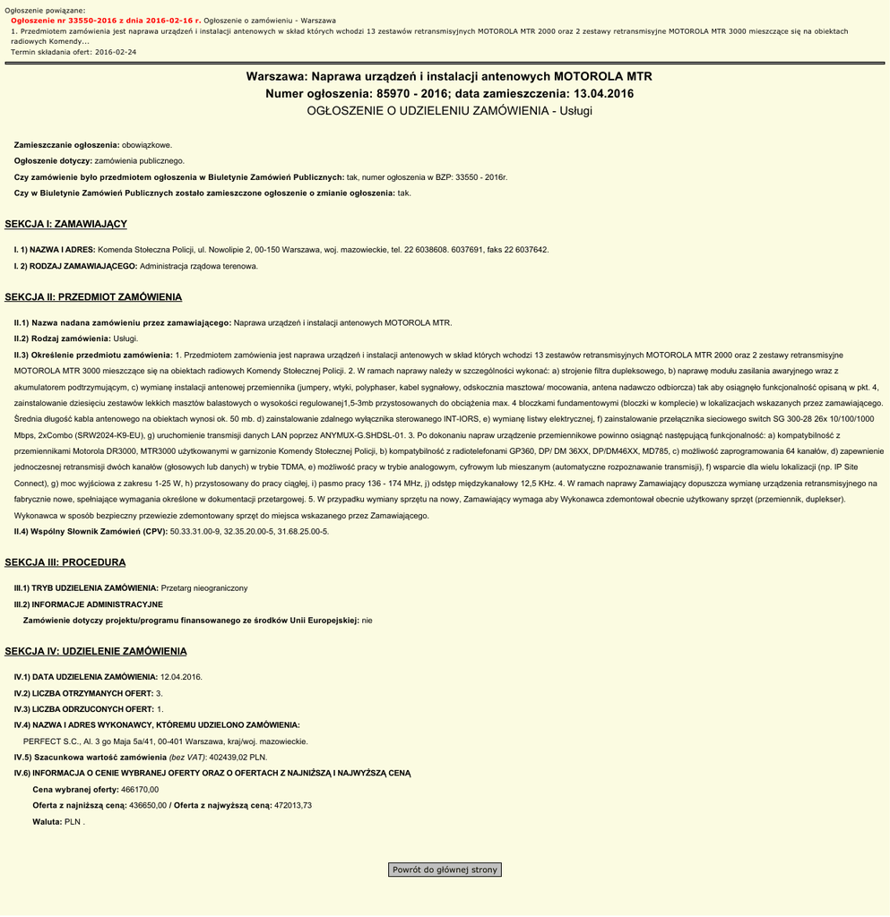 Ogłoszenie powiązane: Ogłoszenie nr 33550-2016 z dnia 2016-02-16 r. Ogłoszenie o zamówieniu - Warszawa 1. Przedmiotem zamówienia jest naprawa urządzeń i instalacji antenowych w skład których wchodzi 13 zestawów retransmisyjnych MOTOROLA MTR 2000 oraz 2 zestawy retransmisyjne MOTOROLA MTR 3000 mieszczące się na obiektach radiowych Komendy... Termin składania ofert: 2016-02-24 Warszawa: Naprawa urządzeń i instalacji antenowych MOTOROLA MTR Numer ogłoszenia: 85970 - 2016; data zamieszczenia: 13.04.2016 OGŁOSZENIE O UDZIELENIU ZAMÓWIENIA - Usługi Zamieszczanie ogłoszenia: obowiązkowe. Ogłoszenie dotyczy: zamówienia publicznego. Czy zamówienie było przedmiotem ogłoszenia w Biuletynie Zamówień Publicznych: tak, numer ogłoszenia w BZP: 33550 - 2016r. Czy w Biuletynie Zamówień Publicznych zostało zamieszczone ogłoszenie o zmianie ogłoszenia: tak. SEKCJA I: ZAMAWIAJĄCY I. 1) NAZWA I ADRES: Komenda Stołeczna Policji, ul. Nowolipie 2, 00-150 Warszawa, woj. mazowieckie, tel. 22 6038608. 6037691, faks 22 6037642. I. 2) RODZAJ ZAMAWIAJĄCEGO: Administracja rządowa terenowa. SEKCJA II: PRZEDMIOT ZAMÓWIENIA II.1) Nazwa nadana zamówieniu przez zamawiającego: Naprawa urządzeń i instalacji antenowych MOTOROLA MTR. II.2) Rodzaj zamówienia: Usługi. II.3) Określenie przedmiotu zamówienia: 1. Przedmiotem zamówienia jest naprawa urządzeń i instalacji antenowych w skład których wchodzi 13 zestawów retransmisyjnych MOTOROLA MTR 2000 oraz 2 zestawy retransmisyjne MOTOROLA MTR 3000 mieszczące się na obiektach radiowych Komendy Stołecznej Policji. 2. W ramach naprawy należy w szczególności wykonać: a) strojenie filtra dupleksowego, b) naprawę modułu zasilania awaryjnego wraz z akumulatorem podtrzymującym, c) wymianę instalacji antenowej przemiennika (jumpery, wtyki, polyphaser, kabel sygnałowy, odskocznia masztowa/ mocowania, antena nadawczo odbiorcza) tak aby osiągnęło funkcjonalność opisaną w pkt. 4, zainstalowanie dziesięciu zestawów lekkich masztów balastowych o wysokości regulowanej1,5-3mb przystosowanych do obciążenia max. 4 bloczkami fundamentowymi (bloczki w komplecie) w lokalizacjach wskazanych przez zamawiającego. Średnia długość kabla antenowego na obiektach wynosi ok. 50 mb. d) zainstalowanie zdalnego wyłącznika sterowanego INT-IORS, e) wymianę listwy elektrycznej, f) zainstalowanie przełącznika sieciowego switch SG 300-28 26x 10/100/1000 Mbps, 2xCombo (SRW2024-K9-EU), g) uruchomienie transmisji danych LAN poprzez ANYMUX-G.SHDSL-01. 3. Po dokonaniu napraw urządzenie przemiennikowe powinno osiągnąć następującą funkcjonalność: a) kompatybilność z przemiennikami Motorola DR3000, MTR3000 użytkowanymi w garnizonie Komendy Stołecznej Policji, b) kompatybilność z radiotelefonami GP360, DP/ DM 36XX, DP/DM46XX, MD785, c) możliwość zaprogramowania 64 kanałów, d) zapewnienie jednoczesnej retransmisji dwóch kanałów (głosowych lub danych) w trybie TDMA, e) możliwość pracy w trybie analogowym, cyfrowym lub mieszanym (automatyczne rozpoznawanie transmisji), f) wsparcie dla wielu lokalizacji (np. IP Site Connect), g) moc wyjściowa z zakresu 1-25 W, h) przystosowany do pracy ciągłej, i) pasmo pracy 136 - 174 MHz, j) odstęp międzykanałowy 12,5 KHz. 4. W ramach naprawy Zamawiający dopuszcza wymianę urządzenia retransmisyjnego na fabrycznie nowe, spełniające wymagania określone w dokumentacji przetargowej. 5. W przypadku wymiany sprzętu na nowy, Zamawiający wymaga aby Wykonawca zdemontował obecnie użytkowany sprzęt (przemiennik, duplekser). Wykonawca w sposób bezpieczny przewiezie zdemontowany sprzęt do miejsca wskazanego przez Zamawiającego. II.4) Wspólny Słownik Zamówień (CPV): 50.33.31.00-9, 32.35.20.00-5, 31.68.25.00-5. SEKCJA III: PROCEDURA III.1) TRYB UDZIELENIA ZAMÓWIENIA: Przetarg nieograniczony III.2) INFORMACJE ADMINISTRACYJNE Zamówienie dotyczy projektu/programu finansowanego ze środków Unii Europejskiej: nie SEKCJA IV: UDZIELENIE ZAMÓWIENIA IV.1) DATA UDZIELENIA ZAMÓWIENIA: 12.04.2016. IV.2) LICZBA OTRZYMANYCH OFERT: 3. IV.3) LICZBA ODRZUCONYCH OFERT: 1. IV.4) NAZWA I ADRES WYKONAWCY, KTÓREMU UDZIELONO ZAMÓWIENIA: PERFECT S.C., Al. 3 go Maja 5a/41, 00-401 Warszawa, kraj/woj. mazowieckie. IV.5) Szacunkowa wartość zamówienia (bez VAT): 402439,02 PLN. IV.6) INFORMACJA O CENIE WYBRANEJ OFERTY ORAZ O OFERTACH Z NAJNIŻSZĄ I NAJWYŻSZĄ CENĄ Cena wybranej oferty: 466170,00 Oferta z najniższą ceną: 436650,00 / Oferta z najwyższą ceną: 472013,73 Waluta: PLN . Powrót do głównej strony