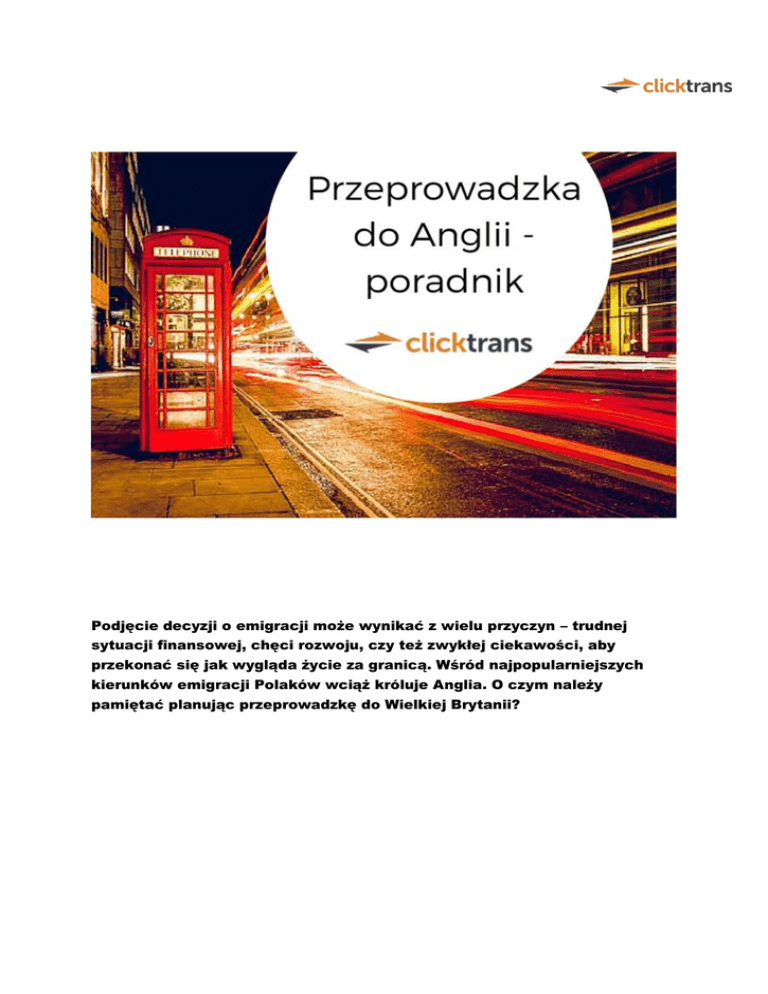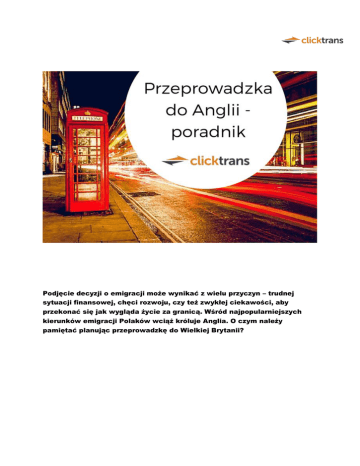 Podjęcie decyzji o emigracji może wynikać z wielu przyczyn – trudnej sytuacji finansowej, chęci rozwoju, czy też zwykłej ciekawości, aby przekonać się jak wygląda życie za granicą. Wśród najpopularniejszych kierunków emigracji Polaków wciąż króluje Anglia. O czym należy pamiętać planując przeprowadzkę do Wielkiej Brytanii? Przygotowania do emigracji – o co zadbać jeszcze w Polsce? Jeśli planujemy przeprowadzkę do Anglii ze znacznym wyprzedzeniem, warto zadbać o to, aby podszlifować język jeszcze w Polsce. To właśnie zdolność komunikacji w języku angielskim zwiększy nasze szansę na zatrudnienie oraz załatwianie codziennych spraw. Najlepszym rozwiązaniem będzie udział w intensywnym kursie opartym na konwersacjach – to pomoże nam pozbyć się blokady językowej i osłuchać z językiem. Kolejną istotną sprawą jest rezygnacja z wszelkich usług, z których nie będziemy korzystać podczas nieobecności w kraju – pamiętajmy o tym, aby wypowiedzieć umowę o abonament na telefon, telewizję kablową, czy Internet. Pierwsze kroki na Wyspach Jak można się z Tobą skontaktować? Jedną z pierwszych spraw, o które należy zadbać jest zakupienie karty do telefonu. W Anglii nie kupimy telefonu na abonament, jeśli nie przebywamy w kraju ponad 6 miesięcy. Najkorzystniejszą opcją będzie zabranie telefonu bez simlocka z Polski i zakupienie karty pay as you go . Przykładowe pakiety pay as you go to np. £10 miesięcznie w sieci Vodafone (smsy bez limitu, 150 minut rozmów na terenie Wielkiej Brytanii, Internet 500MB 4G ), identyczny pakiet w tej samej cenie możemy zakupić w sieci EE, czy O2. Wynajem mieszkania lub pokoju Poszukiwania mieszkania w Anglii różnią się nieco od tych w Polsce. Jeśli nie udało nam się zapewnić sobie lokum u znajomych lub rodziny, a zależy nam na wynajęciu mieszkania bez lokatorów, kolejnym krokiem jest udanie się do agencji. Agencja pośrednicząca w wynajmie będzie wymagała od nas dokumentów potwierdzających tożsamość i udowadniających naszą wypłacalność, czyli: dokument tożsamości pay slip lub wyciąg z konta kontrakt na co najmniej 20 h tygodniowo referencje od pracodawcy gotówka Poszukiwania mieszkania ułatwi też znajomość realiów. Warto wiedzieć, że angielskie one bedroom flat oznacza mieszkanie, w którym znajduje się pokój dzienny i oddzielna sypialnia. Analogicznie, two bedroom flat będzie mieszkaniem z 2 sypialniami i pokojem dziennym. Średni koszt wynajmu dwupokojowego mieszkania w Londynie oscyluje pomiędzy 2-4 tysiącami funtów miesięcznie. Należy pamiętać, że większość umów najmu zakazuje podnajmowania pokoi innym lokatorom. Jeśli natomiast poszukujemy pokoju, wystarczy przejrzeć ogłoszenia w serwisach takich jak np. SpareRoom, EasyRoommate czy Kangaroom. Warto także zapoznać się z serwisami polonijnymi – tam również znajdziemy wiele ogłoszeń o wynajmie pokoi u naszych rodaków np. w serwisie MojaWyspa.co.uk. Średni koszt wynajmu jednego pokoju w Londynie to 350 do 550 funtów. Niektórzy landlordowie pozwolą na opłacanie czynszu w ratach, co tydzień. Kosztem, na który trzeba koniecznie się przygotować jest deposit, czyli kaucja w wysokości miesięcznego czynszu, którą płacimy wraz z pierwszym czynszem. Zanim zapłacimy deposit, warto wspólnie z właścicielem mieszkania dokonać oględzin miejsca, które będziemy wynajmować i spisać na kartce (lub w umowie najmu tzw. tenancy agreement) wszystkie usterki, które zauważyliśmy jeszcze przed wprowadzeniem się. W ten sposób uda nam się uniknąć utracenia kaucji na poczet uszkodzeń, za które to nie my jesteśmy odpowiedzialni. Życzymy udanej przeprowadzki! E-book został opracowany przez serwis: http://clicktrans.pl Więcej ciekawych raportów znajdziecie na http://www.info.clicktrans.pl