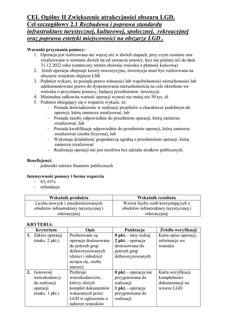 CEL Ogólny II Zwiększenie atrakcyjności obszaru LGD. Cel szczegółowy 2.1 Rozbudowa i poprawa standardu infrastruktury turystycznej, kulturowej, społecznej, rekreacyjnej oraz poprawa estetyki miejscowości na obszarze LGD . Warunki przyznania pomocy: 1. Operacja jest realizowana nie więcej niż w dwóch etapach, przy czym zostanie ona zrealizowana w terminie dwóch lat od zawarcia umowy, lecz nie później niż do dnia 31.12.2022 roku (ostateczny termin złożenia wniosku o płatność końcową) 2. Jeżeli operacja obejmuje koszty inwestycyjne, inwestycja musi być realizowana na obszarze wiejskim objętym LSR 3. Podmiot wykaże, że posiada prawo własności lub współwłasności nieruchomości lub udokumentowane prawo do dysponowania nieruchomością na cele określone we wniosku o przyznanie pomocy, będącej przedmiotem inwestycji. 4. Minimalna całkowita wartość operacji wynosi nie mniej niż 50 tys. zł. 5. Podmiot ubiegający się o wsparcie wykaże, że: - Posiada doświadczenie w realizacji projektów o charakterze podobnym do operacji, którą zamierza zrealizować, lub - Posiada zasoby odpowiednie do przedmiotu operacji, którą zamierza zrealizować, lub - Posiada kwalifikacje odpowiednie do przedmiotu operacji, którą zamierza zrealizować (osoba fizyczna), lub - Wykonuje działalność gospodarczą zgodną z przedmiotem operacji, którą zamierza zrealizować - Realizacja operacji nie jest możliwa bez udziału środków publicznych. Beneficjenci: - jednostki sektora finansów publicznych Intensywność pomocy i forma wsparcia - 63, 63% - refundacja Wskaźnik produktu Liczba nowych i zmodernizowanych obiektów infrastruktury turystycznej i rekreacyjnej KRYTERIA: Kryterium 1. Zakres operacji (maks. 2 pkt.) 2. Gotowość wnioskodawcy do realizacji operacji (maks. 1 pkt.) Opis Preferowane są operacje dostosowane do potrzeb grup defaworyzowanych (dzieci i młodzież ucząca się, osoby starsze) Preferuje wnioskodawców, którzy złożyli komplet dokumentów wskazanych przez LGD w ogłoszeniu o naborze wniosków Wskaźnik rezultatu Wzrost liczby osób korzystających z obiektów infrastruktury turystycznej i rekreacyjnej Punktacja 0 pkt. - inny rodzaj 2 pkt. - operacja dostosowana do potrzeb grup defaworyzowanych Źródło weryfikacji Karta opisu operacji, informacje we wniosku 0 pkt. - operacja nie przygotowana do realizacji 1 pkt. - operacja przygotowana do realizacji Karta weryfikacji kompletności dokumentacji na wzorze LGD 3. Okres realizacji operacji (maks. 1 pkt.) Preferowane są operacje, których czas realizacji nie przekracza 12 miesięcy 0 pkt. - Okres realizacji operacji powyżej 12 miesięcy 1 pkt. - Okres realizacji operacji poniżej 12 miesięcy 4. Innowacyjność operacji (maks. 1 pkt.) Preferowane są operacje o charakterze innowacyjnym. Innowacja rozumiana jako: a) Dostarczenie usługi/produktu turystycznego i/lub b) Zrealizowanie inwestycji i/lub c) Nowatorskie wykorzystanie lokalnych zasobów i surowców i/lub d) Wykorzystanie technologii w procesie usług i/lub e) Rozwój nowych rynków dotychczas nieznanych/ niestosowanych na obszarze LSR. Preferowane są operacje, których koszty są racjonalne i znajdują swoje uzasadnienie w dołączonych do wniosku ofertach, kosztorysach itp. dokumentach. Kryterium preferuje operacje, które w swoich celach lub działalności bezpośrednio przyczynią się do ochrony środowiska (np. recykling odpadów, odnawialne źródła energii, gospodarka wodnościekowa) lub 0 pkt. – brak Informacja opisu we innowacyjności wniosku, karta 1 pkt. – innowacyjny operacji w skali 1 gminy objętej LSR, na której realizowana jest operacja 3 pkt. – innowacyjny w skali całego obszaru 5. Racjonalność budżetu (Uzasadnienie kosztów zaplanowanych do poniesienia w ramach operacji) (maks. 1 pkt.) 6. Wpływ operacji na stan środowiska naturalnego i zmiany klimatyczne (maks. 2 pkt.) 0 pkt. – brak racjonalności budżetu 1 pkt. – budżet racjonalny Informacja we wniosku Wniosek wraz z załącznikami 0 pkt. – brak wpływu Informacje zawarte na ochronę we wniosku środowiska i klimat 2 pkt. – operacje mające pozytywny wpływ na ochronę środowiska i klimat 7. Doradztwo biura LGD (maks. 2 pkt.) 8. Wkład wnioskodawcy pośrednio uwzględnia technologie wpływające na oszczędność energii lub emisję szkodliwych substancji. To kryterium wymaga uzasadnienia przez każdego członka Rady. Informacja musi być zawarta w biznesplanie lub dodatkowym oświadczeniu podpisanym przez beneficjenta. Preferowani są wnioskodawcy, którzy korzystali z usług pracowników biura w zakresie przygotowania wniosku o przyznanie dofinansowania. Doradztwo indywidualne w trakcie trwania naborów, konsultacje telefoniczne. 0 pkt. – wnioskodawca korzystał z doradztwa na etapie sporządzania wniosku o przyznanie dofinansowania 1 pkt. – wnioskodawca korzystał z 1 formy doradztwa biura LGD na etapie sporządzania wniosku 2 pkt. – wnioskodawca korzystał z 2 lub więcej form doradztwa biura LGD na etapie sporządzania wniosku w tym szkolenie/spotkanie informacyjne Preferowane są 0 pkt. – wkład wnioski, w których wnioskodawcy nie wkład własny przekracza wnioskodawcy intensywność przekracza pomocy intensywność pomocy 1 pkt. – wkład własny wnioskodawcy przekracza intensywność pomocy Listy ze spotkań informacyjnych szkoleń, wydruki email, rejestr beneficjentów korzystających z doradztwa LGD. Maksymalna liczba punktów: 13 pkt. (min. 7 pkt., aby otrzymać wsparcie)