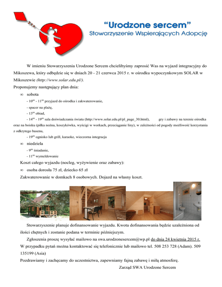 W imieniu Stowarzyszenia Urodzone Sercem chcielibyśmy zaprosić Was na wyjazd integracyjny do Mikoszewa, który odbędzie się w dniach 20 - 21 czerwca 2015 r. w ośrodku wypoczynkowym SOLAR w Mikoszewie (http://www.solar.edu.pl/). Proponujemy następujący plan dnia: • sobota - 1000 - 1100 przyjazd do ośrodka i zakwaterowanie, - spacer na plażę, - 1300 obiad, - 1400 - 1900 sala doświadczania świata (http://www.solar.edu.pl/pl_page_30.html), gry i zabawy na terenie ośrodka oraz na boisku (piłka nożna, koszykówka, wyścigi w workach, przeciąganie liny), w zależności od pogody możliwość korzystania z odkrytego basenu, - 1900 ognisko lub grill, karaoke, wieczorna integracja • niedziela - 900 śniadanie, - 1100 wymeldowanie Koszt całego wyjazdu (nocleg, wyżywienie oraz zabawy): • osoba dorosła 75 zł, dziecko 65 zł Zakwaterowanie w domkach 8 osobowych. Dojazd na własny koszt. Stowarzyszenie planuje dofinansowanie wyjazdu. Kwota dofinansowania będzie uzależniona od ilości chętnych i zostanie podana w terminie późniejszym. Zgłoszenia proszę wysyłać mailowo na [email protected] do dnia 24 kwietnia 2015 r. W przypadku pytań można kontaktować się telefonicznie lub mailowo tel. 508 253 728 (Adam). 509 135199 (Asia) Pozdrawiamy i zachęcamy do uczestnictwa, zapewniamy fajną zabawę i miłą atmosferę. Zarząd SWA Urodzone Sercem