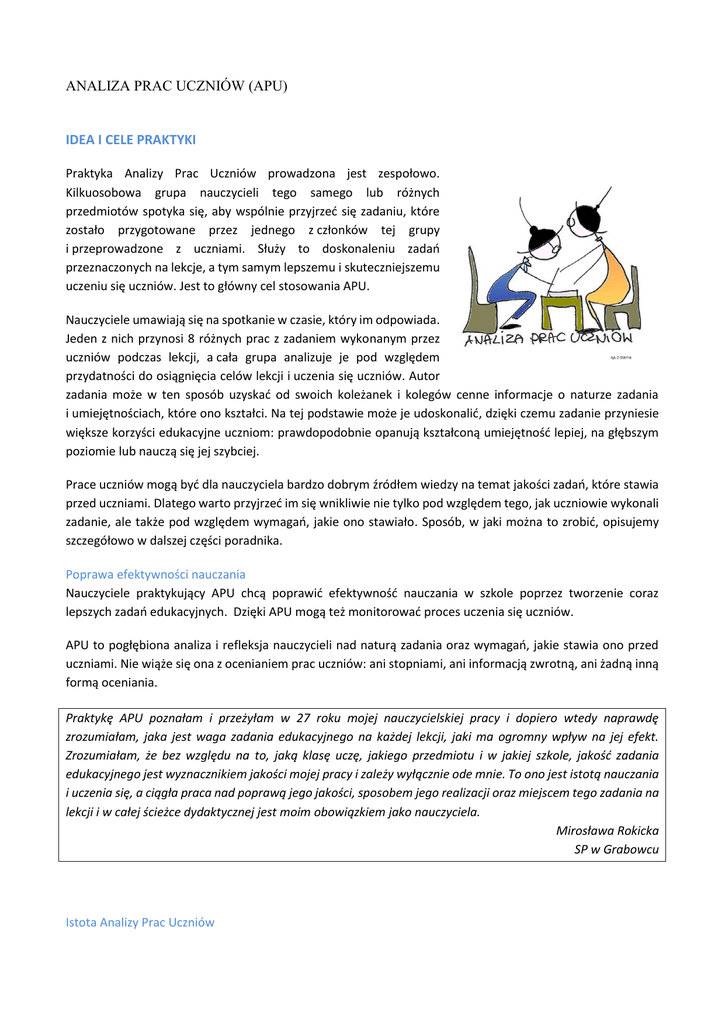 ANALIZA PRAC UCZNIÓW (APU) IDEA I CELE PRAKTYKI Praktyka Analizy Prac Uczniów prowadzona jest zespołowo. Kilkuosobowa grupa nauczycieli tego samego lub różnych przedmiotów spotyka się, aby wspólnie przyjrzeć się zadaniu, które zostało przygotowane przez jednego z członków tej grupy i przeprowadzone z uczniami. Służy to doskonaleniu zadań przeznaczonych na lekcje, a tym samym lepszemu i skuteczniejszemu uczeniu się uczniów. Jest to główny cel stosowania APU. Nauczyciele umawiają się na spotkanie w czasie, który im odpowiada. Jeden z nich przynosi 8 różnych prac z zadaniem wykonanym przez uczniów podczas lekcji, a cała grupa analizuje je pod względem przydatności do osiągnięcia celów lekcji i uczenia się uczniów. Autor zadania może w ten sposób uzyskać od swoich koleżanek i kolegów cenne informacje o naturze zadania i umiejętnościach, które ono kształci. Na tej podstawie może je udoskonalić, dzięki czemu zadanie przyniesie większe korzyści edukacyjne uczniom: prawdopodobnie opanują kształconą umiejętność lepiej, na głębszym poziomie lub nauczą się jej szybciej. Prace uczniów mogą być dla nauczyciela bardzo dobrym źródłem wiedzy na temat jakości zadań, które stawia przed uczniami. Dlatego warto przyjrzeć im się wnikliwie nie tylko pod względem tego, jak uczniowie wykonali zadanie, ale także pod względem wymagań, jakie ono stawiało. Sposób, w jaki można to zrobić, opisujemy szczegółowo w dalszej części poradnika. Poprawa efektywności nauczania Nauczyciele praktykujący APU chcą poprawić efektywność nauczania w szkole poprzez tworzenie coraz lepszych zadań edukacyjnych. Dzięki APU mogą też monitorować proces uczenia się uczniów. APU to pogłębiona analiza i refleksja nauczycieli nad naturą zadania oraz wymagań, jakie stawia ono przed uczniami. Nie wiąże się ona z ocenianiem prac uczniów: ani stopniami, ani informacją zwrotną, ani żadną inną formą oceniania. Praktykę APU poznałam i przeżyłam w 27 roku mojej nauczycielskiej pracy i dopiero wtedy naprawdę zrozumiałam, jaka jest waga zadania edukacyjnego na każdej lekcji, jaki ma ogromny wpływ na jej efekt. Zrozumiałam, że bez względu na to, jaką klasę uczę, jakiego przedmiotu i w jakiej szkole, jakość zadania edukacyjnego jest wyznacznikiem jakości mojej pracy i zależy wyłącznie ode mnie. To ono jest istotą nauczania i uczenia się, a ciągła praca nad poprawą jego jakości, sposobem jego realizacji oraz miejscem tego zadania na lekcji i w całej ścieżce dydaktycznej jest moim obowiązkiem jako nauczyciela. Mirosława Rokicka SP w Grabowcu Istota Analizy Prac Uczniów Stosowanie APU polega na cyklicznym, szczegółowym badaniu prac uczniów przez zespoły nauczycieli po to, aby wnioski z analiz wykorzystać do poprawienia własnej pracy i pracy wszystkich nauczycieli w szkole. APU można wykorzystać w trzech obszarach: jako analizę efektów wykonania przez uczniów zadań oraz zbieranie dowodów na to, że uczniowie robią postępy, jako porównywanie nauczycielskich intencji związanych z zadaniem z tym, co udało się uczniom osiągnąć, współpracy nauczycieli w śledzeniu toku myślenia uczniów. Dowody uczenia się uczniów odnajdujemy w ich pracach. Analizując prace uczniów, nauczyciele biorą pod uwagę cele lekcji, cel edukacyjny zadania, wcześniej ustalone kryteria dobrze wykonanego zadania oraz zakres, w jakim uczniowie spełnili każde kryterium. Prace, które były poddane analizie, mogą być gromadzone, aby tworzyć bazę dobrych, efektywnych zadań. Nauczyciele mogą korzystać z takiej bazy dowolnie, np. modyfikować zadania i dostosować je do aktualnych potrzeb lub posłużyć się nimi jedynie jako inspiracją. Jeśli nauczyciel dodatkowo gromadzi arkusze i kopie prac uczniów, na przykład w segregatorach lub w elektronicznym portfolio, ma szansę śledzić rozwój procesu uczenia się uczniów, a także swojego nauczania. Oczekiwania nauczyciela a osiągnięcia ucznia Szczegółowa analiza prac uczniów dostarcza wiedzy na temat różnicy pomiędzy tym, co nauczyciel zamierzał osiągnąć, stawiając przed uczniami konkretne zadanie edukacyjne, a tym, co faktycznie osiągnęli uczniowie, wykonując to zadanie. Rzeczywistym dowodem osiągnięć (mierzonym zakresem spełnienia kryteriów sukcesu do zadania) są prace uczniów. Gdy analiza prac uczniów ujawni lukę między oczekiwanymi a rzeczywistymi osiągnięciami uczniów, nauczyciel ma szansę zmodyfikować zadanie, co prowadzi do zmiany sposobu nauczania. Zmiana dotyczy konstrukcji i treści zadania bądź osadzenia zadania w lekcji lub w ich cyklu (czasem i jednego, i drugiego). Śledzenie toku myślenia ucznia i wybór zadań do analizy Nie każde zadanie edukacyjne pozwala rozpoznać i zrozumieć tok myślenia ucznia. Umożliwiają to zadania reprezentujące wyższe poziomy poznawcze, np. wymagające pogłębionej analizy, wymyślenia określonej koncepcji, opracowania strategii rozwiązania problemu. Takie zadania mogą ujawnić, jak uczeń dochodził do rozwiązania i z czego wynikają ewentualne błędy. Na tej podstawie można prześledzić proces uczenia się ucznia, który zachodził w cyklu lekcji i doprowadził do kompetencji widocznych w analizowanej pracy. Zadania z poziomu wiedzy nie dają tej możliwości. Nie warto zbierać grupy analizującej prace uczniów, aby zastanawiała się np. dlaczego uczeń nie zapamiętał wzoru na obliczenie prędkości w ruchu jednostajnym lub ma kłopot z określeniem, co to jest mierzeja, albo ile jest 6 razy 7. APU nie da odpowiedzi na te pytania. Natomiast zadania z wyższych poziomów poznawczych, których redagowania uczą się nauczyciele, analizując prace, mogą pomóc uczniom zrozumieć ruch jednostajny, powstawanie mierzei lub algorytm mnożenia. Z tych powodów praktycy APU nie analizują kartkówek i testów sprawdzających wiedzę. Rzadko też analizowane są karty pracy, z