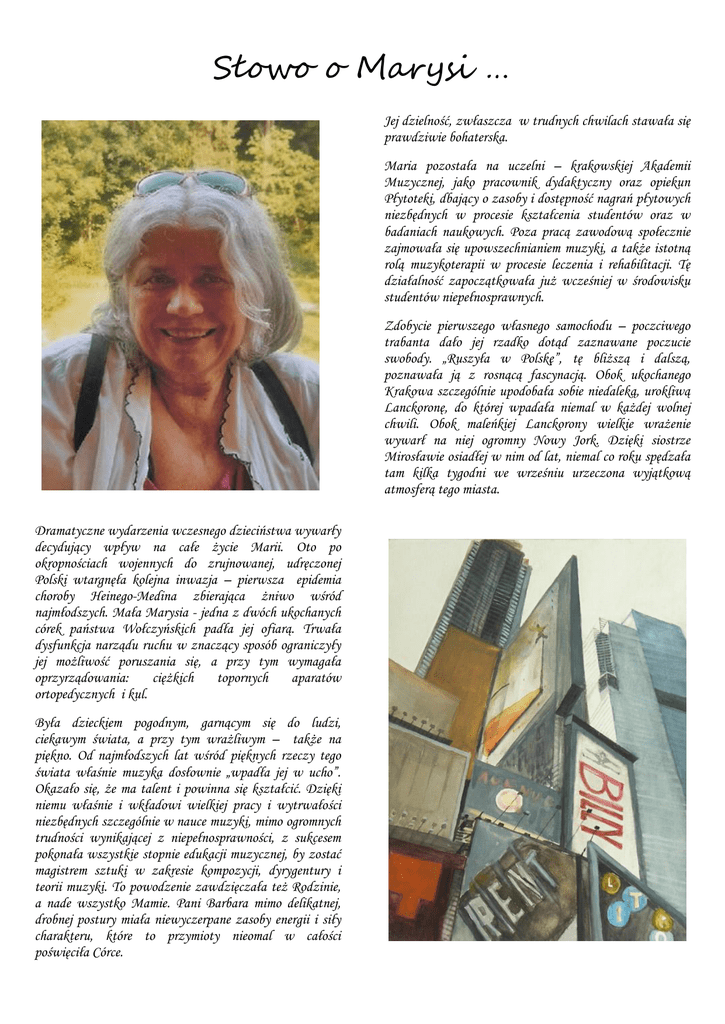 Słowo o Marysi … Jej dzielność, zwłaszcza w trudnych chwilach stawała się prawdziwie bohaterska. Maria pozostała na uczelni – krakowskiej Akademii Muzycznej, jako pracownik dydaktyczny oraz opiekun Płytoteki, dbający o zasoby i dostępność nagrań płytowych niezbędnych w procesie kształcenia studentów oraz w badaniach naukowych. Poza pracą zawodową społecznie zajmowała się upowszechnianiem muzyki, a także istotną rolą muzykoterapii w procesie leczenia i rehabilitacji. Tę działalność zapoczątkowała już wcześniej w środowisku studentów niepełnosprawnych. Zdobycie pierwszego własnego samochodu – poczciwego trabanta dało jej rzadko dotąd zaznawane poczucie swobody. „Ruszyła w Polskę”, tę bliższą i dalszą, poznawała ją z rosnącą fascynacją. Obok ukochanego Krakowa szczególnie upodobała sobie niedaleką, urokliwą Lanckoronę, do której wpadała niemal w każdej wolnej chwili. Obok maleńkiej Lanckorony wielkie wrażenie wywarł na niej ogromny Nowy Jork. Dzięki siostrze Mirosławie osiadłej w nim od lat, niemal co roku spędzała tam kilka tygodni we wrześniu urzeczona wyjątkową atmosferą tego miasta. Dramatyczne wydarzenia wczesnego dzieciństwa wywarły decydujący wpływ na całe życie Marii. Oto po okropnościach wojennych do zrujnowanej, udręczonej Polski wtargnęła kolejna inwazja – pierwsza epidemia choroby Heinego-Medina zbierająca żniwo wśród najmłodszych. Mała Marysia - jedna z dwóch ukochanych córek państwa Wołczyńskich padła jej ofiarą. Trwała dysfunkcja narządu ruchu w znaczący sposób ograniczyły jej możliwość poruszania się, a przy tym wymagała oprzyrządowania: ciężkich topornych aparatów ortopedycznych i kul. Była dzieckiem pogodnym, garnącym się do ludzi, ciekawym świata, a przy tym wrażliwym – także na piękno. Od najmłodszych lat wśród pięknych rzeczy tego świata właśnie muzyka dosłownie „wpadła jej w ucho”. Okazało się, że ma talent i powinna się kształcić. Dzięki niemu właśnie i wkładowi wielkiej pracy i wytrwałości niezbędnych szczególnie w nauce muzyki, mimo ogromnych trudności wynikającej z niepełnosprawności, z sukcesem pokonała wszystkie stopnie edukacji muzycznej, by zostać magistrem sztuki w zakresie kompozycji, dyrygentury i teorii muzyki. To powodzenie zawdzięczała też Rodzinie, a nade wszystko Mamie. Pani Barbara mimo delikatnej, drobnej postury miała niewyczerpane zasoby energii i siły charakteru, które to przymioty nieomal w całości poświęciła Córce. że były one zwodnicze. Zmarła nad ranem 29 listopada. Dotąd dojmującym uczuciem bliskich i przyjaciół była rosnąca bezsilność, a teraz wielki żal po Jej stracie. Kilka dni później koło południa 5 grudnia słońce jasno świeciło na błękitnym niebie, zwłaszcza jak na tę porę roku, u progu zimy. Rodzina, przyjaciele, koleżanki i koledzy z uczelni żegnali ją na nabożeństwie w kaplicy Cmentarza Rakowickiego, a potem odprowadzili na miejsce wiecznego spoczynku w grobowcu, obok Rodziców. Wzięła tam ze sobą bukiecik kwiatów, ulubioną maskotkę przytulankę – wąsatego morsika, a nade wszystko anioła, i to nie byle jakiego. Był to bowiem wizerunek Anioła Ludzkości – własnoręcznie wykonanej statuetki, nagrody zdobytej w Konkursie Rzeźby zorganizowanego przed laty przez Fundację. Słusznie była z niego dumna i bardzo doń przywiązana. Mogiłę pokryły kwietne wieńce i wiązanki, wypowiedziano wiele ciepłych słów, przywołano wspomnienia, nie brakło też poezji. Przełom lat 80/90-tych i ją pobudził do pracy społecznej w nowym duchu. Wraz z gronem przyjaciół współtworzyła w 1989 roku Towarzystwo Inwalidów Narządu Ruchu IKAR, a w dwa lata później Fundację Sztuki Osób Niepełnosprawnych. Działalność tej organizacji przywołała po latach jej dziecięce zamiłowanie do rysowania. Poczuła, że swoje widzenie świata może wyrażać poprzez różnorodne rodzaje sztuki, jak malarstwo, grafika i rzeźba, czy słowo pisane w postaci dziennikarstwa reportażowego i poezji. Udanie wypowiadała się także w fotografii rejestrując swoje wędrówki krajoznawcze i umiłowanie przyrody. W swej twórczości odnosiła sukcesy, a udział w wystawach i konkursach procentował nie tylko uznaniem, ale licznymi nagrodami i wyróżnieniami. Jej ostatnim odnotowanym sukcesem było zdobycie drugiej nagrody w kategorii poezji 20. Konkursu Literackiego przed kilku miesiącami. Jako prawdziwa artystka była indywidualistką, miała swoje zdanie, ale ci, którzy Ją poznali wiedzieli dobrze, jak jest serdeczna i życzliwa. Mawia się przy podobnych smutnych okazjach, że ktoś „odszedł w pełni sił twórczych ”. W przypadku Marii nie jest to żaden stereotyp, tak właśnie było, bowiem pełna radości życia snuła swoje plany na przyszłość, przy pięknej pogodzie, w miłym towarzystwie była w ukochanej Lanckoronie na krótko przed ujawnieniem się dolegliwości, których drastycznie rosnący rozmiar i zasięg okazał się zbyt wielki, by skołatane ciało mogło je pokonać, mimo intensywnego leczenia. Choć kilka dni wcześniej odwiedzający ją w szpitalu przyjaciółki stwierdziły widoczną poprawę w stanie zdrowia, a te krzepiące objawy wzmogły nadzieje na jej wyzdrowienie w czuwającej przy niej Siostrze, okazało się, Odpoczywaj w pokoju Marysiu, po wielu tygodniach niewypowiedzianego cierpienia, w lepszym, piękniejszym świecie… P.S. To, że o Marii piszę per „Marysia” nie wynika ze zbytniej, niestosownej poufałości. Spowodowane jest dwoma względami. Po pierwsze poznaliśmy się, jako kilkuletnie brzdące, a właściwie „towarzysze niedoli”. Nasze Mamy przyprowadzały nas do poradni rehabilitacyjnej na mniej lub bardziej wyrafinowane zabiegi, które miały zmniejszyć skutki przebytej HeineMedina. Mamy się zaprzyjaźniły, ponadto byliśmy niedalekimi sąsiadami. Dzieliła nas (poza płcią) r