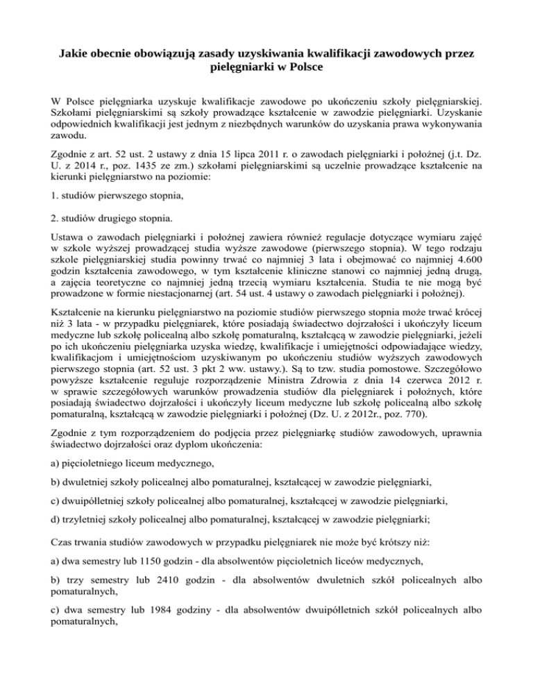 Jakie obecnie obowiązują zasady uzyskiwania kwalifikacji zawodowych przez pielęgniarki w Polsce W Polsce pielęgniarka uzyskuje kwalifikacje zawodowe po ukończeniu szkoły pielęgniarskiej. Szkołami pielęgniarskimi są szkoły prowadzące kształcenie w zawodzie pielęgniarki. Uzyskanie odpowiednich kwalifikacji jest jednym z niezbędnych warunków do uzyskania prawa wykonywania zawodu. Zgodnie z art. 52 ust. 2 ustawy z dnia 15 lipca 2011 r. o zawodach pielęgniarki i położnej (j.t. Dz. U. z 2014 r., poz. 1435 ze zm.) szkołami pielęgniarskimi są uczelnie prowadzące kształcenie na kierunki pielęgniarstwo na poziomie: 1. studiów pierwszego stopnia, 2. studiów drugiego stopnia. Ustawa o zawodach pielęgniarki i położnej zawiera również regulacje dotyczące wymiaru zajęć w szkole wyższej prowadzącej studia wyższe zawodowe (pierwszego stopnia). W tego rodzaju szkole pielęgniarskiej studia powinny trwać co najmniej 3 lata i obejmować co najmniej 4.600 godzin kształcenia zawodowego, w tym kształcenie kliniczne stanowi co najmniej jedną drugą, a zajęcia teoretyczne co najmniej jedną trzecią wymiaru kształcenia. Studia te nie mogą być prowadzone w formie niestacjonarnej (art. 54 ust. 4 ustawy o zawodach pielęgniarki i położnej). Kształcenie na kierunku pielęgniarstwo na poziomie studiów pierwszego stopnia może trwać krócej niż 3 lata - w przypadku pielęgniarek, które posiadają świadectwo dojrzałości i ukończyły liceum medyczne lub szkołę policealną albo szkołę pomaturalną, kształcącą w zawodzie pielęgniarki, jeżeli po ich ukończeniu pielęgniarka uzyska wiedzę, kwalifikacje i umiejętności odpowiadające wiedzy, kwalifikacjom i umiejętnościom uzyskiwanym po ukończeniu studiów wyższych zawodowych pierwszego stopnia (art. 52 ust. 3 pkt 2 ww. ustawy.). Są to tzw. studia pomostowe. Szczegółowo powyższe kształcenie reguluje rozporządzenie Ministra Zdrowia z dnia 14 czerwca 2012 r. w sprawie szczegółowych warunków prowadzenia studiów dla pielęgniarek i położnych, które posiadają świadectwo dojrzałości i ukończyły liceum medyczne lub szkołę policealną albo szkołę pomaturalną, kształcącą w zawodzie pielęgniarki i położnej (Dz. U. z 2012r., poz. 770). Zgodnie z tym rozporządzeniem do podjęcia przez pielęgniarkę studiów zawodowych, uprawnia świadectwo dojrzałości oraz dyplom ukończenia: a) pięcioletniego liceum medycznego, b) dwuletniej szkoły policealnej albo pomaturalnej, kształcącej w zawodzie pielęgniarki, c) dwuipółletniej szkoły policealnej albo pomaturalnej, kształcącej w zawodzie pielęgniarki, d) trzyletniej szkoły policealnej albo pomaturalnej, kształcącej w zawodzie pielęgniarki; Czas trwania studiów zawodowych w przypadku pielęgniarek nie może być krótszy niż: a) dwa semestry lub 1150 godzin - dla absolwentów pięcioletnich liceów medycznych, b) trzy semestry lub 2410 godzin - dla absolwentów dwuletnich szkół policealnych albo pomaturalnych, c) dwa semestry lub 1984 godziny - dla absolwentów dwuipółletnich szkół policealnych albo pomaturalnych, d) dwa semestry - dla absolwentów trzyletnich szkół policealnych albo pomaturalnych; Program kształcenia na ww. studiach zawodowych, w tym wymiar zajęć teoretycznych, praktycznych i praktyk zawodowych, ustala uczelnia, uwzględniając różnice pomiędzy treściami kształcenia określonymi w standardach kształcenia dla kierunków studiów pielęgniarstwo i położnictwo oraz programami nauczania zrealizowanymi odpowiednio w wyżej wymienionych szkołach. Po zaliczeniu przewidzianych programem kształcenia na studiach zawodowych zajęć teoretycznych i praktycznych oraz praktyk zawodowych student przystępuje do teoretycznego i praktycznego egzaminu kończącego studia zawodowe. Edukacja pielęgniarek na uczelni prowadzącej kształcenie na kierunku pielęgniarstwo obejmuje kształcenie teoretyczne i kliniczne (praktykę). W trakcie kształcenia teoretycznego student zdobywa wiedzę zawodową, doświadczenie i umiejętności niezbędne do planowania, organizowania i sprawowania opieki zdrowotnej oraz oceny działań z tym związanych. W trakcie kształcenia klinicznego student uczy się sprawowania kompleksowej opieki zdrowotnej jako członek zespołu, w bezpośrednim kontakcie z osobami zdrowymi i chorymi. Kształcenie kliniczne odbywa się w podmiotach leczniczych, pod kierunkiem wykładowców pielęgniarstwa lub położnictwa oraz przy pomocy innych specjalistów, w szczególności pielęgniarek i położnych. Kształcenie kliniczne jest praktyką w rozumieniu przepisów ustawy z dnia 27 lipca 2005 r. - Prawo o szkolnictwie wyższym. NIPiP