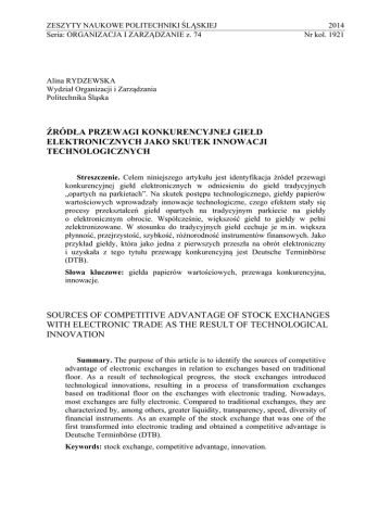ZESZYTY NAUKOWE POLITECHNIKI ŚLĄSKIEJ Seria: ORGANIZACJA I ZARZĄDZANIE z. 74 2014 Nr kol. 1921 Alina RYDZEWSKA Wydział Organizacji i Zarządzania Politechnika Śląska ŹRÓDŁA PRZEWAGI KONKURENCYJNEJ GIEŁD ELEKTRONICZNYCH JAKO SKUTEK INNOWACJI TECHNOLOGICZNYCH Streszczenie. Celem niniejszego artykułu jest identyfikacja źródeł przewagi konkurencyjnej giełd elektronicznych w odniesieniu do giełd tradycyjnych „opartych na parkietach”. Na skutek postępu technologicznego, giełdy papierów wartościowych wprowadzały innowacje technologiczne, czego efektem stały się procesy przekształceń giełd opartych na tradycyjnym parkiecie na giełdy o elektronicznym obrocie. Współcześnie, większość giełd to giełdy w pełni zelektronizowane. W stosunku do tradycyjnych giełd cechuje je m.in. większa płynność, przejrzystość, szybkość, różnorodność instrumentów finansowych. Jako przykład giełdy, która jako jedna z pierwszych przeszła na obrót elektroniczny i uzyskała z tego tytułu przewagę konkurencyjną jest Deutsche Terminbörse (DTB). Słowa kluczowe: giełda papierów wartościowych, przewaga konkurencyjna, innowacje. SOURCES OF COMPETITIVE ADVANTAGE OF STOCK EXCHANGES WITH ELECTRONIC TRADE AS THE RESULT OF TECHNOLOGICAL INNOVATION Summary. The purpose of this article is to identify the sources of competitive advantage of electronic exchanges in relation to exchanges based on traditional floor. As a result of technological progress, the stock exchanges introduced technological innovations, resulting in a process of transformation exchanges based on traditional floor on the exchanges with electronic trading. Nowadays, most exchanges are fully electronic. Compared to traditional exchanges, they are characterized by, among others, greater liquidity, transparency, speed, diversity of financial instruments. As an example of the stock exchange that was one of the first transformed into electronic trading and obtained a competitive advantage is Deutsche Terminbörse (DTB). Keywords: stock exchange, competitive advantage, innovation. 606 A. Rydzewska 1. Wstęp Przełom XX i XXI wieku to okres dynamicznych zmian w funkcjonowaniu giełd papierów wartościowych. Giełdy pod wpływem postępu technologicznego, zmian prawnych w zakresie liberalizacji inwestycji w papiery wartościowe oraz rozwoju kultury inwestycyjnej, wprowadzały liczne innowacje1. Największe zmiany zostały uwarunkowane przez innowacje technologiczne. Nowe rozwiązania w zakresie systemów komputerowych i telekomunikacyjnych spowodowały, że dotychczas stosowany na giełdach, działających na bazie tradycyjnego parkietu, system open outcry, który polega na zawieraniu transakcji pomiędzy maklerami uczestniczącymi fizycznie w transakcjach, został zastąpiony przez obrót elektroniczny2. W zelektronizowanych giełdach, dzięki systemom informatycznym, transakcje są zawierane na podstawie wpływających zleceń, według ściśle określonego algorytmu, natomiast budynki giełd papierów wartościowych zamieniają się w wielkie serwerownie. Giełda papierów wartościowych najogólniej jest definiowana jako „organizacja, stowarzyszenie lub grupa osób, mające lub nie osobowość prawną, która stanowi miejsce lub urządzenie stanowiące rynek łączący nabywców i sprzedających papiery wartościowe i/lub wykonująca inne czynności, np. rozliczeniowe w odniesieniu do papierów wartościowych, zgodnie z przyjętymi zasadami”3. Tradycyjny model giełdy stanowiła organizacja w formie spółdzielni, której współwłaścicielami byli członkowie giełdy. Członkowie to zazwyczaj instytucje finansowe pośredniczące w obrocie papierami, którzy reprezentują interesy inwestorów (brokerzy) lub własne (dealerzy)4. Ich głównym zadaniem było uczestnictwo w sesji na parkiecie oraz pośrednictwo w składaniu i realizacji zleceń. Z tego też tytułu czerpali swe dochody. Jednakże ta forma organizacyjna giełd z czasem okazała się mniej 1 Innowacje to rozwiązania, które pojawiły się jako wynik procesów związanych z tworzeniem, rozwijaniem i wprowadzaniem nowych wartości w produktach lub nowych połączeń środków i zasobów, które są nowością dla tworzącej je lub wprowadzającej jednostki. Jako twórcę koncepcji innowacji w ekonomii uznaje się J.A. Schumpetera. Autor ten za innowację uznał pierwsze zastosowanie danego rozwiązania w podstawowych obszarach funkcjonalnych przedsiębiorstwa. Odrzucał natomiast stosowanie rozważanego pojęcia w odniesieniu do dyfuzji nowych koncepcji do nowych produktów, przedsiębiorstw, przemysłów itd. Część autorów utożsamia innowację z tzw. nowością subiektywną i odnosi ją do dobra, usługi lub pomysłu, który jest postrzegany przez kogoś jako nowy. I tak, na przykład Ph. Kotler i P. Drucker jako innowację traktują każdą koncepcję, będącą nowością dla jej nowego użytkownika. Por. W. Janasz, K. Kozioł: Determinanty działalności innowacyjnej przedsiębiorstw, PWE, Warszawa 2007, s. 57. Patrz też: T. Nawrocki, B. Jabłoński: Inwestowanie na rynku akcji, CeDeWu, Warszawa 2011, s. 96 oraz D. Szwajca: „The innovativeness of Polish companies according to research results”, „Forum Statisticum Slovacum” 6/2010, Slovenska Statisticka a Demograficka Spolocnost, Bratislava 2010, p. 85. 2 H.R. Stoll: Future of Securities Markets: Competition or Consolidation?, Financial Analysts Journal”, Charlottesville, Nov/Dec 2008., Vol. 64, p. 15-27. 3 C. Di Noia: The Stock-Exchange Industry: Network Effects, Implicit Mergers, And Corporate Governance, Quaderni Di Finanza, Studi E Ricerche, No. 33, Marzo 1999, p. 17, cyt. za: American Securities Exchange Act (Fragment 3.a.1). 4 B. Steil: Why do exchanges demutualize?, 25/06/2002,http://www.mondovisione.com/exchanges/handbookarticles/why-do-exchanges-demutualize/. Źródła przewagi konkurencyjnej giełd… 607 konkurencyjna w stosunku do nowo powstających giełd o