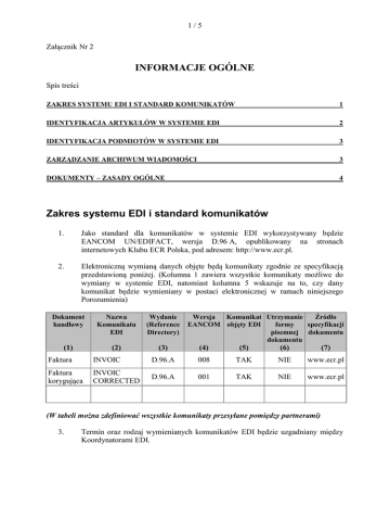 1/5 Załącznik Nr 2 INFORMACJE OGÓLNE Spis treści ZAKRES SYSTEMU EDI I STANDARD KOMUNIKATÓW 1 IDENTYFIKACJA ARTYKUŁÓW W SYSTEMIE EDI 2 IDENTYFIKACJA PODMIOTÓW W SYSTEMIE EDI 3 ZARZĄDZANIE ARCHIWUM WIADOMOŚCI 3 DOKUMENTY – ZASADY OGÓLNE 4 Zakres systemu EDI i standard komunikatów 1. Jako standard dla komunikatów w systemie EDI wykorzystywany będzie EANCOM UN/EDIFACT, wersja D.96 A, opublikowany na stronach internetowych Klubu ECR Polska, pod adresem: http://www.ecr.pl. 2. Elektroniczną wymianą danych objęte będą komunikaty zgodnie ze specyfikacją przedstawioną poniżej. (Kolumna 1 zawiera wszystkie komunikaty możliwe do wymiany w systemie EDI, natomiast kolumna 5 wskazuje na to, czy dany komunikat będzie wymieniany w postaci elektronicznej w ramach niniejszego Porozumienia) Wersja Komunikat Utrzymanie Źródło EANCOM objęty EDI formy specyfikacji pisemnej dokumentu dokumentu Dokument handlowy Nazwa Komunikatu EDI Wydanie (Reference Directory) (1) (2) (3) (4) (5) (6) (7) Faktura INVOIC D.96.A 008 TAK NIE www.ecr.pl Faktura korygująca INVOIC CORRECTED D.96.A 001 TAK NIE www.ecr.pl (W tabeli można zdefiniować wszystkie komunikaty przesyłane pomiędzy partnerami) 3. Termin oraz rodzaj wymienianych komunikatów EDI będzie uzgadniany między Koordynatorami EDI. 2/5 4. Komunikaty EDI zostaną przetworzone możliwie najszybciej po otrzymaniu, jednak nie później niż w następnym dniu roboczym. Identyfikacja artykułów w systemie EDI Do identyfikacji artykułów w systemie EDI wykorzystywane są numery GTIN z zachowaniem następujących reguł: Do oznaczania swoich artykułów w EDI Dostawca obowiązany jest używać kodów GTIN uzyskanych z Instytutu Logistyki i Magazynowania w Poznaniu w przypadku produktów krajowych lub od upoważnionej do nadawania kodów GTIN jednostki zagranicznej w przypadku produktów zagranicznych. Numer GTIN produktu jest podstawowym identyfikatorem artykułu dla potrzeb EDI. Wszelkie inne identyfikatory należy uzupełniać zgodnie ze specyfikacją szczegółową dla poszczególnych dokumentów dostępną na stronie www.ecr.pl Kod GTIN artykułu Dostawcy stosowany w ramach systemu EDI jest jednoznacznie powiązany z jednym tylko numerem artykułu zamawiającego w ramach tego samego numeru dostawcy i związanego z nim kodu GLN. Dostawca, który będzie uczestniczył w systemie EDI, zobowiązuje się, że będzie bezwzględnie przestrzegał obowiązku nadawania kodów GTIN dla każdego artykułu dostarczanego do zamawiającego, przy czym artykuł rozumiany jest jako jednostka zamawiającego (zgodnie z ustaleniami z ogólnych warunków handlowych) identyfikowana jednoznacznie przez numer artykułu zamawiającego i w ramach jednego numeru Dostawcy zamawiającego. Przed przystąpieniem do testów EDI Dostawca zobowiązany jest do uzgodnienia z Działem Handlowym kodów GTIN dla aktywnych do zamówień artykułów oraz każdorazowego uaktualniania kodów GTIN w przypadku jakichkolwiek zmian. Dostawca, zobowiązuje się, że będzie bezwzględnie przestrzegał reguł nadawania numerów identyfikacyjnych GTIN. W szczególności numery, które uprzednio były wykorzystywane do oznaczania artykułu, mogą być użyte ponownie do oznaczenia innego artykułu nie wcześniej niż po upływie 3 lat od zaprzestania wykorzystania w sposób poprzedni. Dostawca, zobowiązuje się, że będzie informował Osoby odpowiedzialne za sprawy handlowe u Zamawiającego z przynajmniej 1 tygodniowym wyprzedzeniem o numerze GTIN nowych produktów (w momencie uzgadniania warunków handlowych dla danego artykułu). Wszelkie zmiany kodów GTIN artykułu dostawcy stosowanego w zamówieniach w systemie EDI muszą dokonywać się za wiedzą i potwierdzeniem osoby odpowiedzialnej za sprawy handlowe u Zamawiającego i z przynajmniej 1 3/5 tygodniowym wyprzedzeniem, gdyż musi on dokonać zmiany przyporządkowania kodu GTIN do numeru artykułu zamawiającego. Możliwe do stosowania kody GTIN to: kody 8, 12, 13, 14 nadawane artykułom sztukowym lub opakowaniom zbiorczym; kody 14 nadawane artykułom zmiennowagowym (cyfrą wiodącą jest 9). Należy przestrzegać aby rodzaj stosowanych kodów GTIN był zgodny z wytycznymi Instytutu Logistyki i Magazynowania w Poznaniu. Stosowanie zasad identyfikowania i znakowania towarów o zmiennej ilości, zgodnie z globalnymi standardami systemu GS1, konieczne jest ze względu na odrębność zasad w porównaniu z towarami o standardowych - o stałych ilościach. Właściwe ich kodowanie pozostaje w zgodzie z globalnymi standardami GS1 i jest warunkiem koniecznym do prowadzenia elektronicznej wymiany danych. Identyfikacja podmiotów w systemie EDI Do identyfikacji podmiotów w systemie EDI wykorzystywany jest Globalny Numer Lokalizacyjny GLN oraz dodatkowo numer dostawcy wg zamawiającego z zachowaniem następujących reguł: Dostawca może używać jedynie numerów lokalizacyjnych GLN przyznanych mu przez GS1. O każdej planowanej zmianie własnego numeru lokalizacyjnego GLN Dostawca musi poinformować pisemnie lub poczta elektroniczną Koordynatora EDI zamawiającego co najmniej z 1 tygodniowym wyprzedzeniem. Zarządzanie archiwum wiadomości 1. Zamawiający i Dostawca zobowiązuje się przechowywać kopie wszystkich przychodzących i wychodzących dokumentów EDI , zgodnie z wymogami obowiązującego prawa. 2. Czas przechowywania kopii dokumentów będzie nie krótszy niż wynika to z wymogów prawa, albo w przypadku braku uregulowań dotyczących dokumentów elektronicznych, nie krótszy niż to wynika z wymogów prawa w odniesieniu do odpowiednich dokumentów papierowych. 3. Zamawiający oraz Dostawca gwarantują, że w przypadku faktur system archiwizacji i przeglądania dokumentów będzie spełniał wymogi Rozporządzenia. 4. Szczegółowe zabezpieczenia gwarantowane przez usługodawcę archiwum, spełniające wymogi weryfikacji pochodzenia i integralności danych są określone w następującej umowie zawartej pomiędzy: 4/5 Zamawi