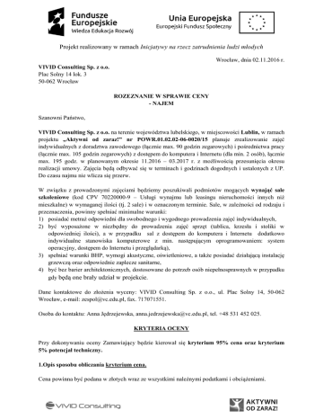 Projekt realizowany w ramach Inicjatywy na rzecz zatrudnienia ludzi młodych Wrocław, dnia 02.11.2016 r. VIVID Consulting Sp. z o.o. Plac Solny 14 lok. 3 50-062 Wrocław ROZEZNANIE W SPRAWIE CENY - NAJEM Szanowni Państwo, VIVID Consulting Sp. z o.o. na terenie województwa lubelskiego, w miejscowości Lublin, w ramach projektu „Aktywni od zaraz!” nr POWR.01.02.02-06-0020/15 planuje zrealizowanie zajęć indywidualnych z doradztwa zawodowego (łącznie max. 90 godzin zegarowych) i pośrednictwa pracy (łącznie max. 105 godzin zegarowych) z dostępem do komputera i Internetu (dla min. 2 osób), łącznie max. 195 godz. w planowanym okresie 11.2016 – 03.2017 r. z możliwością przesunięcia okresu realizacji umowy. Zajęcia będą odbywać się w terminach i godzinach dogodnych i ustalonych z UP. Do czasu najmu nie wlicza się przerw. W związku z prowadzonymi zajęciami będziemy poszukiwali podmiotów mogących wynająć sale szkoleniowe (kod CPV 70220000-9 – Usługi wynajmu lub leasingu nieruchomości innych niż mieszkalne) w wymaganej ilości (tj. 2 sale) i w oznaczonym terminie. Sale, w zależności od rodzaju i przeznaczenia, powinny spełniać minimalne warunki: 1) posiadać metraż odpowiedni dla swobodnego i wygodnego prowadzenia zajęć indywidualnych, 2) być wyposażone w niezbędny do prowadzenia zajęć sprzęt (tablica, krzesła i stoliki w odpowiedniej ilości), a w przypadku sal z dostępem do komputera i Internetu dodatkowo indywidualne stanowiska komputerowe z min. następującym oprogramowaniem: system operacyjny, dostępem do Internetu i przeglądarką), 3) spełniać warunki BHP, wymogi akustyczne, oświetleniowe, a także posiadać działającą instalację grzewczą oraz odpowiednie zaplecze sanitarne, 4) być bez barier architektonicznych, dostosowane do potrzeb osób niepełnosprawnych w przypadku gdy będą one brały udział w projekcie. Dane kontaktowe do złożenia wyceny: VIVID Consulting Sp. z o.o., ul. Plac Solny 14, 50-062 Wrocław, e-mail: [email protected], fax. 717071551. Osoba do kontaktu: Anna Jędrzejewska, [email protected], tel. +48 531 452 025. KRYTERIA OCENY Przy dokonywaniu oceny Zamawiający będzie kierował się kryterium 95% cena oraz kryterium 5% potencjał techniczny. 1.Opis sposobu obliczania kryterium cena. Cena powinna być podana w złotych wraz ze wszystkimi należnymi podatkami i obciążeniami. Projekt realizowany w ramach Inicjatywy na rzecz zatrudnienia ludzi młodych Punkty przyznawane za kryterium cena będą liczone wg następującego wzoru: C = (Cmin : C0) x 95 gdzie: C – liczba punktów przyznana danej ofercie, Cmin – najniższa cena spośród ważnych ofert, C0 – cena obliczona badanej oferty. Maksymalna liczba punktów do uzyskania przez Wykonawcę w kryterium cena wynosi 95. Wszystkie obliczenia będą dokonywane z dokładnością do dwóch miejsc po przecinku. 2.Opis sposobu obliczania kryterium potencjał techniczny. Przez potencjał techniczny Wykonawcy rozumie się dysponowanie salą szkoleniową/salami szkoleniowymi spełniającymi normy budownictwa energooszczędnego/pasywnego zgodnie z zasadą zrównoważonego rozwoju. Ocena spełnienia tego warunku dla danej sali będzie dokonywana na podstawie oświadczenia Wykonawcy. Punkty przyznawane za kryterium potencjał techniczny będą liczone następująco: Każdy Wykonawca dysponujący salą szkoleniową/salami szkoleniowymi spełniającymi normy budownictwa energooszczędnego/pasywnego zgodnie z zasadą zrównoważonego rozwoju otrzyma dodatkowo 5 punktów za spełnienie kryterium potencjał techniczny dla danej sali. Każdy Wykonawca, który nie dysponuje salą szkoleniową/salami szkoleniowymi spełniającymi normy budownictwa energooszczędnego/pasywnego zgodnie z zasadą zrównoważonego rozwoju otrzyma 0 punktów za spełnienie kryterium potencjał techniczny dla danej sali. Maksymalna liczba punktów do uzyskania przez Wykonawcę w kryterium potencjał techniczny dla danej sali wynosi 5. Ważna wycena, która uzyska najwyższą liczbę punktów za daną salę (suma kryteriów cena + potencjał techniczny) uznana zostanie za najkorzystniejszą. DODATKOWE INFORMACJE Informujemy, iż w umowie najmu, poza powyższymi wymaganiami, zawarte zostaną postanowienia dotyczące: - obowiązku świadczenia usługi z należytą starannością i wysokimi standardami przyjętymi na rynku, - możliwości zmiany liczby godzin najmu, - obowiązku archiwizacji dokumentów związanych z realizacją umowy na zasadach określonych przez Najemcę, - obowiązku oznaczenia sal oraz budynków, w których będą prowadzone zajęcia zgodnie z zasadami PO WER 2014-2020, Projekt realizowany w ramach Inicjatywy na rzecz zatrudnienia ludzi młodych - obowiązku zapłaty na rzecz Najemcy kar umownych w przypadku nieprzestrzegania harmonogramów, świadczenia usługi bez zachowania należytej staranności (w tym zapisy o możliwości potrącania naliczonych kar umownych z wynagrodzenia Wynajmującego; zastrzegające Najemcy możliwość dochodzenia od Wynajmującego odszkodowania przenoszącego wysokość kar umownych, na zasadach ogólnych; zakazujące Wynajmującemu dokonywania cesji wierzytelności należności wynikających z tytułu realizacji umowy na banki, firmy ubezpieczeniowe, inne podmioty gospodarcze czy osoby fizyczne lub prawne), - obowiązku poddania się kontroli dokonywanej przez Najemcę, Instytucję Pośredniczącą oraz inne uprawnione podmioty w zakresie prawidłowości realizacji Projektu, - możliwości występowania opóźnień w płatnościach wynagrodzenia Wynajmującemu, które uzależnione będzie od terminu wpłynięcia na konto W środków przeznaczonych na pokrycie wydatków związanych realizacją umowy na etapie, w którym uczestniczył w nim Wynajmujący Informujemy, iż niniejsze rozeznanie w sprawie ceny ma charakter informacyjny i nie zobowiązuje Zamawiającego do zawarcia umowy na określonych warunkach i z określonym podmiotem oraz nie rod
