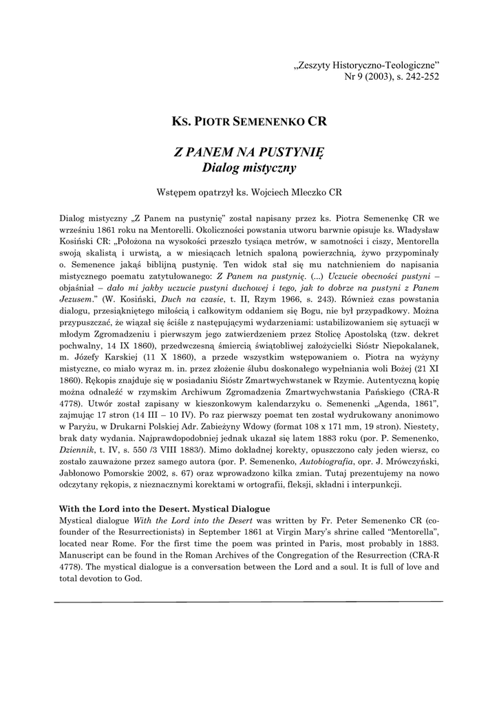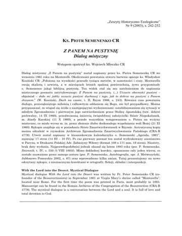 „Zeszyty Historyczno-Teologiczne” Nr 9 (2003), s. 242-252 KS. PIOTR SEMENENKO CR Z PANEM NA PUSTYNIĘ Dialog mistyczny Wstępem opatrzył ks. Wojciech Mleczko CR Dialog mistyczny „Z Panem na pustynię” został napisany przez ks. Piotra Semenenkę CR we wrześniu 1861 roku na Mentorelli. Okoliczności powstania utworu barwnie opisuje ks. Władysław Kosiński CR: „Położona na wysokości przeszło tysiąca metrów, w samotności i ciszy, Mentorella swoją skalistą i urwistą, a w miesiącach letnich spaloną powierzchnią, żywo przypominały o. Semenence jakąś biblijną pustynię. Ten widok stał się mu natchnieniem do napisania mistycznego poematu zatytułowanego: Z Panem na pustynię. (...) Uczucie obecności pustyni – objaśniał – dało mi jakby uczucie pustyni duchowej i tego, jak to dobrze na pustyni z Panem Jezusem.” (W. Kosiński, Duch na czasie, t. II, Rzym 1966, s. 243). Również czas powstania dialogu, przesiąkniętego miłością i całkowitym oddaniem się Bogu, nie był przypadkowy. Można przypuszczać, że wiązał się ściśle z następującymi wydarzeniami: ustabilizowaniem się sytuacji w młodym Zgromadzeniu i pierwszym jego zatwierdzeniem przez Stolicę Apostolską (tzw. dekret pochwalny, 14 IX 1860), przedwczesną śmiercią świątobliwej założycielki Sióstr Niepokalanek, m. Józefy Karskiej (11 X 1860), a przede wszystkim wstępowaniem o. Piotra na wyżyny mistyczne, co miało wyraz m. in. przez złożenie ślubu doskonałego wypełniania woli Bożej (21 XI 1860). Rękopis znajduje się w posiadaniu Sióstr Zmartwychwstanek w Rzymie. Autentyczną kopię można odnaleźć w rzymskim Archiwum Zgromadzenia Zmartwychwstania Pańskiego (CRA-R 4778). Utwór został zapisany w kieszonkowym kalendarzyku o. Semenenki „Agenda, 1861”, zajmując 17 stron (14 III – 10 IV). Po raz pierwszy poemat ten został wydrukowany anonimowo w Paryżu, w Drukarni Polskiej Adr. Zabieżyny Wdowy (format 108 x 171 mm, 19 stron). Niestety, brak daty wydania. Najprawdopodobniej jednak ukazał się latem 1883 roku (por. P. Semenenko, Dziennik, t. IV, s. 550 /3 VIII 1883/). Mimo dokładnej korekty, opuszczono cały jeden wiersz, co zostało zauważone przez samego autora (por. P. Semenenko, Autobiografia, opr. J. Mrówczyński, Jabłonowo Pomorskie 2002, s. 67) oraz wprowadzono kilka zmian. Tutaj prezentujemy na nowo odczytany rękopis, z nieznacznymi korektami w ortografii, fleksji, składni i interpunkcji. With the Lord into the Desert. Mystical Dialogue Mystical dialogue With the Lord into the Desert was written by Fr. Peter Semenenko CR (cofounder of the Resurrectionists) in September 1861 at Virgin Mary’s shrine called “Mentorella”, located near Rome. For the first time the poem was printed in Paris, most probably in 1883. Manuscript can be found in the Roman Archives of the Congregation of the Resurrection (CRA-R 4778). The mystical dialogue is a conversation between the Lord and a soul. It is full of love and total devotion to God. 2 PAN Na samotność zaprowadzę Ciebie, duszo, miłą moją Obok siebie Cię posadzę, Serce twoje z moim spoję Całą Ciebie tam posiądę I do serca mówić będę. DUSZA Panie, uczyń! PAN Chcesz? DUSZA Bez miary! Całą wiedzą twojej wiary Całą żądzą twej nadziei Całym ogniem twej miłości Chcę z tej świata wyjść zawiei Raz być z Tobą w samotności. Ty mnie całą tam posiądziesz I do serca mówić będziesz. PAN Więc chcesz? DUSZA Chcę, ach! nieskończenie! PAN Ciesz się! spełnię twe życzenie Na samotność zaprowadzę Obok siebie Cię posadzę Tam Ty w sercu spoczniesz moim, A ja w sercu spocznę twoim. Wtedy serce twe zrozumie, Co ma miłość chce i umie, Co ma miłość chce i czyni. O najmilsza! w tej pustyni Ja tak chcę byś była ze mną: A ty chceszże? DUSZA Nadaremno 3 Mnie się pytasz. Ty wiesz przecie Jak mi ciasno na tym świecie, Wśród tych stworzeń jak mi smutno, I wśród ludzi jak okrutno. Ty wiesz dobrze o mój drogi, Jaki dla mnie los to srogi Być bez Ciebie! być w pożarze Świata tego, kiedym w skwarze Uczuć własnych, być w tym grobie Siebie samej, w samej sobie! Ach Najdroższy! wszystkie stopnie Zgrozy tu przechodzić muszę! Zbaw mój drogi, zbaw mą duszę! Bo tu straszno, tu okropnie! Nie ma Ciebie; nie ma Ciebie! Wszelkie życie stąd uciekło. Kiedym z Tobą, jestem w Niebie, Lecz bez Ciebie tylko piekło. PAN Więc chcesz do mnie? DUSZA Już nie pytaj! Czytaj raczej w sercu, czytaj! Patrzaj co się w duszy dzieje. Myśli moje, jak zawieje Po bezdrożnych puszczach gonią: I bez ciebie gdzież się schronią? Me uczucia, z ziemi rodne A zziajane, życia głodne. Istne burze, wciąż szaleją, Wszystko niszczą i śmierć wieją, We mnie samej męką moją, Jak bez Ciebie się ukoją? I uczynki moje biedne, Tak bez Ciebie, same jedne, Jak owieczki zabłąkane Bez pasterza, co je strzeże. I trwożliwe i znękane, Na nieznane idą leże; Bez napoju i bez żeru, Bez opieki i bez steru Od swojego zdala dachu Pełne tylko zgrozy strachu Płaczą nad swym opuszczeniem Bo bez Ciebie żyć nie mogą! – Ach, bez Ciebie wszystko trwogą, Wszystko zgrozą i zniszczeniem! 4 Strach mi, strach mi, o mój miły. I drżąc wołam z całej siły: O Najmilszy! chcę do Ciebie! Chcę być z Tobą! W tej potrzebie Ty mnie ratuj! A nie zwlekaj! PAN Więc chcesz do mnie? DUSZA Nie, nie czekaj! Prędko, prędko, skończ mą mękę, Przyjdź łaskawie, weź za rękę Wyrwij mnie od samej siebie, Przybierz rączo, pochwyć twoje Ze mną razem wszystko moje! Chcę do Ciebie! chcę do Ciebie! PAN Chcesz doprawdy? DUSZA O Najdroższy! Co Ty czynisz? Coraz sroższy Cios zadajesz mojej duszy, Jakbyś rad był mej katuszy! Ty mnie pytasz czy chcę Ciebie? I chociaż wciąż Ci to przysięgam, Pragnień celu nie dosięgam! Ach nie bierzesz mnie do siebie! O Najmilszy! czyś okrutny Że tak męczysz? Duch mój smutny Już się pyta: czy nie łechcesz Biednej duszy czczą nadzieją? I dopraw