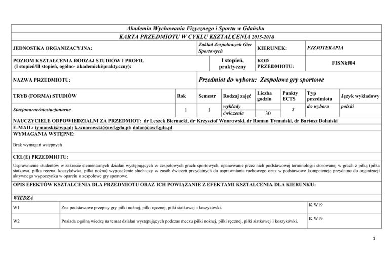 Akademia Wychowania Fizycznego i Sportu w Gdańsku KARTA PRZEDMIOTU W CYKLU KSZTAŁCENIA 2015-2018 Zakład Zespołowych Gier Sportowych JEDNOSTKA ORGANIZACYJNA: I stopień, praktyczny POZIOM KSZTAŁCENIA RODZAJ STUDIÓW I PROFIL (I stopień/II stopień, ogólno- akademicki/praktyczny): FIZJOTERAPIA KOD PRZEDMIOTU: FISNkf04 Przedmiot do wyboru: Zespołowe gry sportowe NAZWA PRZEDMIOTU: TRYB (FORMA) STUDIÓW KIERUNEK: Rok Semestr Rodzaj zajęć Liczba godzin Punkty ECTS Typ przedmiotu do wyboru Język wykładowy wykłady polski 2 ćwiczenia 30 NAUCZYCIELE ODPOWIEDZIALNI ZA PRZEDMIOT: dr Leszek Biernacki, dr Krzysztof Wnorowski, dr Roman Tymański, dr Bartosz Dolański E-MAIL: [email protected]; [email protected]; [email protected] WYMAGANIA WSTĘPNE: Stacjonarne/niestacjonarne 1 I Brak wymagań wstępnych CEL(E) PRZEDMIOTU: Usprawnienie studentów w zakresie elementarnych działań występujących w zespołowych grach sportowych, opanowanie przez nich podstawowej terminologii stosowanej w grach z piłką (piłka siatkowa, piłka ręczna, koszykówka, piłka nożna) wyposażenie słuchaczy w zasób ćwiczeń przydatnych do usprawniania ruchowego oraz w podstawowe kompetencje przydatne do organizacji aktywnego wypoczynku w oparciu o zespołowe gry sportowe. OPIS EFEKTÓW KSZTAŁCENIA DLA PRZEDMIOTU ORAZ ICH POWIĄZANIE Z EFEKTAMI KSZTAŁCENIA DLA KIERUNKU: WIEDZA W1 Zna podstawowe przepisy gry piłki nożnej, piłki ręcznej, piłki siatkowej i koszykówki. W2 Posiada ogólną wiedzę na temat działań występujących podczas meczu piłki nożnej, piłki ręcznej, piłki siatkowej i koszykówki. K W19 K W19 1 W3 Zna podstawowe zasady organizacji turnieju lub festynu sportowego. K W13 UMIEJĘTNOŚCI U1 U2 Potrafi przeprowadzić podstawowe ćwiczenia ruchowe zawierające elementy zespołowych gier sportowych. Potrafi zorganizować turniej piłki nożnej, piłki ręcznej, piłki siatkowej i koszykówki. K U10 K U10 KOMPETENCJE K1 Samodzielnie wykonuje powierzone mu zadania i właściwie organizuje pracę własną. K_K06 K2 Potrafi propagować i aktywnie kreować zdrowy styl życia i promocję zdrowia. K_K16 KRYTERIA I METODY OCENY OSIĄGNIĘTYCH EFEKTÓW KSZTAŁCENIA: FORMY ZALICZENIA: W1 - W3 - odpowiedź ustna, sprawdzian pisemny (wiedza ogólna) U1 – U2 - sprawdzian praktyczny z wybranych elementów techniki specjalnej – ocena eksperta (kryteria oceny: student oceniany jest za poprawność techniczną demonstrowanych elementów, czas wykonania tych elementów oraz skuteczność) W2, W3, K1, K2 - sędziowanie gry uproszczonej, szkolnej i właściwej – obserwacja i ocena eksperta (kryteria oceny: znajomość: przepisów gry, umiejętność interpretacji przepisów podczas gry, zachowanie bezpieczeństwa) Aby uzyskać zaliczenie przedmiotu na ocenę dostateczną student musi osiągnąć wszystkie wymienione w programie efekty kształcenia. METODY I FORMY REALIZACJI PRZEDMIOTU: METODY DYDAKTYCZNE: - demonstrowanie: jako forma przekazywania informacji nauczania umiejętności ruchowych; - instruowanie: przekazywanie informacji nauczania w sposób werbalny lub pisemny; - gra sportowa; FORMY DYDAKTYCZNE: - ćwiczenia TREŚCI KSZTAŁCENIA: WYKŁADY: 2 ĆWICZENIA: - gry i zabawy ruchowe z wykorzystaniem zespołowych gier sportowych - ćwiczenia usprawnienia ruchowego z piłką - nauczanie i doskonalenie podstawowych umiejętności techniczno-taktycznych - fundamentalne indywidualne i grupowe działania w atakowaniu i w bronieniu - podstawowe przepisy gier FORMA ZALICZENIA: - zaliczenie z oceną LITERATURA: Literatura podstawowa: 1. Biernacki L., Nowiński W., Kubrycht J. Pierwsze kroki w piłce ręcznej. Poradnik metodyczny. AWFiS, Gdańsk, 2010. 2. Bondarowicz M., „Zabawy i gry ruchowe w zajęciach sportowych”, COS, Warszawa, 2002. 3. Mazur D., Mikołajec K.. Koszykarski atlas cwiczeń. COS, Warszawa, 2009. 4. Paluszek K.: „Kompedium instruktora i trenera piłki nożnej”. Wrocław, 2010. 5. Superlak E. „Piłka siatkowa. Technika i taktyka. AWF, Wrocław”, 2005. 6. Szwarc A. (red.): „Vademecum piłki nożnej”. AWFiS Gdańsk, 2010. Literatura uzupelniająca: 1. Czerwiński J. i współpracownicy; „Kontrola treningu i walki sportowej w grach zespołowych” AWFiS Gdańsk, 2007. 2. Naglak Z. Teoria zespołowej gry sportowej. Kształcenie gracza. AWF, Wrocław, 2001. 3. Panfil R. Prakseologia gry sportowe. AWF, Wrocław, 2006. Bilans punktów ECTS (1 pkt ECTS – 25-30 godz. pracy studenta): Aktywność Obciążenie studenta godz. 10 godz. 30 godz. 5 godz. 5 godz. 5 godz. 5 godz. Udział w wykładach Samodzielne studiowanie tematyki wykładów Udział w ćwiczeniach Przygotowanie się do ćwiczeń Konsultacje Opracowanie scenariusza lekcji z piłki nożnej Przygotowanie do sprawdzianów praktycznych i teoretycznych Całkowite obciążenie pracą studenta Punkty ECTS za przedmiot 60 godz. 2 ECTS Opracował: dr Bartosz Dolański 3