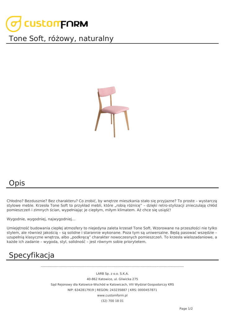 Tone Soft, różowy, naturalny Opis Chłodno? Bezdusznie? Bez charakteru? Co zrobić, by wnętrze mieszkania stało się przyjazne? To proste – wystarczą stylowe meble. Krzesła Tone Soft to przykład mebli, które „robią różnicę” – dzięki retro-stylizacji znieczulają chłód pomieszczeń i zimnych ścian, wypełniając je ciepłym, miłym klimatem. Aż chce się usiąść! Wygodnie, wygodniej, najwygodniej… Umiejętność budowania ciepłej atmosfery to niejedyna zaleta krzeseł Tone Soft. Wzorowane na przeszłości nie tylko stylem, ale również jakością – są solidne i starannie wykonane. Poza tym są uniwersalne. Będą pasować wszędzie – uzupełnią klasyczne wnętrza, albo „podkręcą” charakter nowoczesnych pomieszczeń. To krzesła wielozadaniowe, a każde ich zadanie – wygoda, styl, solidność – jest równym sobie priorytetem. Specyfikacja ----------------------------------------------------------------------------------------------------------------------------------LARB Sp. z o.o. S.K.A. 40-862 Katowice, ul. Gliwicka 275 Sąd Rejonowy dla Katowice-Wschód w Katowicach, VIII Wydział Gospodarczy KRS NIP: 6342817919 | REGON: 243235887 | KRS: 0000457871 www.customform.pl (32) 700 18 01 Page 1/2 Wysokość 80 cm Szerokość 50 cm Głębokość 50 cm Siedzisko tkanina Podstawa drewno Dodatkowe zdjęcia ----------------------------------------------------------------------------------------------------------------------------------LARB Sp. z o.o. S.K.A. 40-862 Katowice, ul. Gliwicka 275 Sąd Rejonowy dla Katowice-Wschód w Katowicach, VIII Wydział Gospodarczy KRS NIP: 6342817919 | REGON: 243235887 | KRS: 0000457871 www.customform.pl (32) 700 18 01 Page 2/2 Powered by TCPDF (www.tcpdf.org)