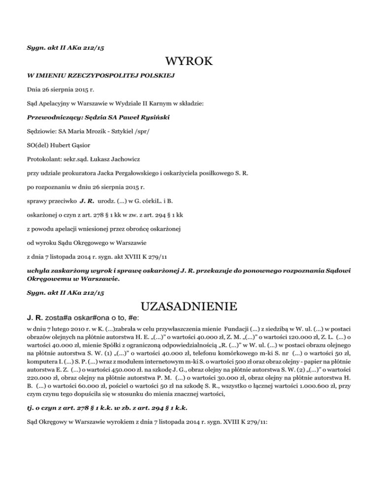 Sygn. akt II AKa 212/15 WYROK W IMIENIU RZECZYPOSPOLITEJ POLSKIEJ Dnia 26 sierpnia 2015 r. Sąd Apelacyjny w Warszawie w Wydziale II Karnym w składzie: Przewodniczący: Sędzia SA Paweł Rysiński Sędziowie: SA Maria Mrozik - Sztykiel /spr/ SO(del) Hubert Gąsior Protokolant: sekr.sąd. Łukasz Jachowicz przy udziale prokuratora Jacka Pergałowskiego i oskarżyciela posiłkowego S. R. po rozpoznaniu w dniu 26 sierpnia 2015 r. sprawy przeciwko J. R. urodz. (...) w G. córkiL. i B. oskarżonej o czyn z art. 278 § 1 kk w zw. z art. 294 § 1 kk z powodu apelacji wniesionej przez obrońcę oskarżonej od wyroku Sądu Okręgowego w Warszawie z dnia 7 listopada 2014 r. sygn. akt XVIII K 279/11 uchyla zaskarżony wyrok i sprawę oskarżonej J. R. przekazuje do ponownego rozpoznania Sądowi Okręgowemu w Warszawie. Sygn. akt II AKa 212/15 UZASADNIENIE J. R. zosta#a oskar#ona o to, #e: w dniu 7 lutego 2010 r. w K. (...)zabrała w celu przywłaszczenia mienie Fundacji (...) z siedzibą w W. ul. (...) w postaci obrazów olejnych na płótnie autorstwa H. E. „(...)” o wartości 40.000 zł, Z. M. „(...)” o wartości 120.000 zł, Z. L. (...) o wartości 40.000 zł, mienie Spółki z ograniczoną odpowiedzialnością „R. (...)” w W. ul. (...) w postaci obrazu olejnego na płótnie autorstwa S. W. (1) „(...)” o wartości 40.000 zł, telefonu komórkowego m-ki S. nr (...) o wartości 50 zł, komputera I. (...) S. P. (...) wraz z modułem internetowym m-ki S. o wartości 500 zł oraz obraz olejny - papier na płótnie autorstwa E. Z. (...) o wartości 450.000 zł. na szkodę J. G., obraz olejny na płótnie autorstwa S. W. (2) „(...)” o wartości 220.000 zł, obraz olejny na płótnie autorstwa P. M. (...) o wartości 30.000 zł, obraz olejny na płótnie autorstwa H. B. (...) o wartości 60.000 zł, pościel o wartości 50 zł na szkodę S. R., wszystko o łącznej wartości 1.000.600 zł, przy czym czynu tego dopuściła się w stosunku do mienia znacznej wartości, tj. o czyn z art. 278 § 1 k.k. w zb. z art. 294 § 1 k.k. Sąd Okręgowy w Warszawie wyrokiem z dnia 7 listopada 2014 r. sygn. XVIII K 279/11: uznał oskarżoną J. R. winną tego, że w dniu 7 lutego 2010 r. wK. (...) zabrała w celu przywłaszczenia mienie Fundacji (...) z siedzibą w W. ul. (...) w postaci obrazów olejnych na płótnie autorstwa H. E. „(...)” o wartości 40.000 zł, Z. M. „(...)” o wartości 120.000 zł, Z. L. (...) o wartości 40.000 zł, mienie Spółki z ograniczoną odpowiedzialnością „R. (...)” w W. ul. (...) w postaci obrazu olejnego na płótnie autorstwa S. W. (1) „(...)” o wartości 40.000 zł, telefonu komórkowego m-ki S. nr (...) o wartości 50 zł, komputera I. (...) S. P. (...) oraz obraz olejny - papier na płótnie autorstwa E. Z. (...) o wartości 450.000 zł. na szkodę J. G., obraz olejny na płótnie autorstwa S. W. (2) „(...)” o wartości 220.000 zł, obraz olejny na płótnie autorstwa P. M. (...) o wartości 30.000 zł, obraz olejny na płótnie autorstwa H. B. (...) o wartości 60.000 zł, pościel o wartości 50 zł na szkodę S. R., wszystko o łącznej wartości 1.000.100 zł, przy czym czynu tego dopuściła się w stosunku do mienia znacznej wartości tj. o czyn z art. 278 § 1 k.k. w zb. z art. 294 § 1 k.k. i wymierzył J. R. karę roku pozbawienia wolności; na podstawie art.69§ l k.k. i art.70 § l pkt. l k.k. wykonanie orzeczonej kary pozbawienia wolności zawiesił na okres próby lat trzech; na mocy art. 33§ l,2 i 3 k.k. wymierzył karę grzywny w wymiarze 50 stawek dziennych po 10 złotych każda; na mocy art.230§2 k.p.k. dowody rzeczowe opisane w wykazie dowodów rzeczowych nr (...) (k-435) pod poz.(...) obraz olejny na płótnie H. E. „(...)” wraz z ramą opisaną pod poz.(...), pod poz.(...)obraz olejny na płótnie Z. M. „(...)”, pod poz. (...) obraz olejny na płótnie Z. L. „(...)” zwrócił właścicielowi Fundacji (...); dowody rzeczowe opisane w wykazie dowodów rzeczowych nr I/10 pod poz.7 obraz S. W. (1) ,,G. dziewczynki” pastel na papierze, pod poz.9 telefon komórkowy marki S. nr (...) zwrócił właścicielowi Spółce z o.o. (...) – 1”; dowód rzeczowy opisany w wykazie dowodów rzeczowych nr (...) pod poz.(...) obraz olejny, papier na płótnie E. Z. „(...)” wraz z ramą opisaną pod poz.(...) zwrócił właścicielowi J. G.; dowody rzeczowe opisane w wykazie dowodów rzeczowych nr (...) pod poz.(...) obraz olejny na płótnie S. W. (2) „(...)” wraz z ramą opisaną pod poz.(...), pod poz.(...) obraz olejny na płótnie H. B. (...) i ramę opisaną pod poz.(...), zwrócił właścicielowi S. R.; dowód rzeczowy opisany w wykazie dowodów rzeczowych (...) pod poz.(...) telefon komórkowy N. (...) nr (...), pod poz. (...)karta Sim nr (...) zwrócił J. L. - R.; na mocy art. 46 § l k.k. zasądził od J. R. na rzecz pokrzywdzonego S. R. kwotę 29.500 (dwadzieścia tysięcy pięćset) złotych tytułem naprawienia szkody; zasądził od J. R. na rzecz Skarbu Państwa tytułem opłaty kwotę 280 złotych oraz koszty postępowania w sprawie. A. tego wyroku wniosła obrońca oskarżonej zarzucając: a) obrazę przepisu postępowania, tj. 424 § 1 pkt 1 k.p.k., poprzez nie odniesienie się w uzasadnieniu do wszystkich przeprowadzonych w sprawie dowodów, pomijając w szczególności dokumenty przedłożone przez oskarżoną, z których wynikał jej tytuł prawny do ruchomości, których przywłaszczenie jej zarzucono, pomijając w całości wyjaśnienia oskarżonej zawarte w 7 protokołach, pomijając zeznania niektórych świadków w całości, a niektórych w zasadniczej części oraz nie wskazanie, jakie fakty sąd uznał za nieudowodnione i na jakich w tej mierze oparł się dowodach i przede wszystkim - dlaczego nie uznał dowodów przeciwnych do tych, które - zdaniem sądu - potwierdzać miały zasadność zarzutu aktu oskarżenia; b) obrazę przepisów postępowania, tj. art. 9 § 1 i 2 k.p.k., ar