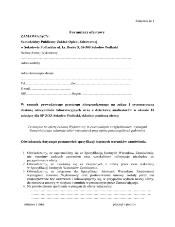 Załącznik nr 1 Formularz ofertowy ZAMAWIAJĄCY: Samodzielny Publiczny Zakład Opieki Zdrowotnej w Sokołowie Podlaskim ul. ks. Bosko 5, 08-300 Sokołów Podlaski Nazwa (Firma) Wykonawcy ......................................................................................................................................... Adres siedziby ......................................................................................................................................... Adres do korespondencji......................................................................................................................................... Tel........................................................;fax..................................................................... E-mail................................................... NIP.......................................................; Regon ............................................................... W ramach prowadzonego przetargu nieograniczonego na zakup i systematyczną dostawę odczynników laboratoryjnych wraz z dzierżawą analizatorów w okresie 18 miesięcy dla SP ZOZ Sokołów Podlaski, składam poniższą ofertę: Tu miejsce na ofertę cenową Wykonawcy (z ewentualnym uwzględnieniem wymagań Zamawiającego odnośnie tabel wskazanych przy opisie poszczególnych pakietów) Oświadczenie dotyczące postanowień specyfikacji istotnych warunków zamówienia. 1. Oświadczamy, że zapoznaliśmy się ze Specyfikacją Istotnych Warunków Zamówienia, nie wnosimy żadnych zastrzeżeń oraz uzyskaliśmy informacje niezbędne do przygotowania oferty. 2. Oświadczamy, że uważamy się za związanych z ofertą przez czas wskazany w Specyfikacji Istotnych Warunków Zamówienia. 3. Oświadczamy, że załączone do Specyfikacji Istotnych Warunków Zamówienia wymagania stawiane Wykonawcy oraz postanowienia umowy zostały przez nas zaakceptowane bez zastrzeżeń i zobowiązujemy się, w przypadku wyboru naszej oferty, do zawarcia umowy w miejscu i terminie wyznaczonym przez Zamawiającego. 4. Na potwierdzenie spełnienia wymagań do oferty załączamy: ………………………………………………………………………………………… ………………………………………………………………………………………… …………………………………………………………………………………… miejsce i data pieczęć i podpis osoby upoważnionej PAKIET I Dostawa odczynników laboratoryjnych do badań „rzadkich” i pilnych z dzierżawą automatycznego analizatora immunologicznego z drukarką laserową. LP. NAZWA 1. 2. 3. 4. 5. 6. 7. 8. 9. 10. 11. 12. D-Dimery Prokalcytonina Toxoplazmoza IgM Toxoplazmoza IgG Różyczka IgM Różyczka IgG Borelioza IgM Borelioza IgG Helicobacter Pylori IgE Total EBV IgM Części zużywalne i zamienne niezbędne do pracy analizatora w ilości i asortymencie zapewniających pracę analizatora przez 18miesięcy Dzierżawa aparatu 12. ILOŚĆ OZNACZEŃ NA 18 MIESIĘCY 1500 230 1200 1200 800 800 1200 1200 100 500 120 18 miesięcy W przypadku okresowego braku testu wykonawca zapewni ciągłość wykonywania badań. Wymagania jakie powinien spełniać analizator: • Automatyczny, wieloparametrowy analizator • Analizator wyposażony w wewnętrzny czytnik kodów paskowych odczynników i próbek badanych, oraz zewnętrzny komputer do podłączenia do stacji roboczej Marcel i monitor LCD led 18,5 cala • Fabrycznie nowy (rok produkcji 2012) • Możliwość wykonywania pojedynczych badań lub w serii • Kompletne zestawy odczynnikowe zawierające kalibratory i kontrole oraz wszelkie inne akcesoria niezbędne do wykonywania oznaczenia • Podłączenie analizatora do pracującego w laboratorium systemu informatycznego • Analizator wyposażony w UPS podtrzymujący pracę aparatu w przypadku awarii przez okres minimum 30 minut Wykonawca zapewni bezpłatny autoryzowany serwis gwarancyjny na analizator w okresie trwania umowy oraz bezpłatny przegląd aparatu raz na rok. Zamawiający wymaga aby czas reakcji autoryzowanego serwisu na zgłoszoną awarię analizatora wynosił maksymalnie 24 godziny. Wykonawca dostarczy analizator do Laboratorium SP ZOZ w Sokołowie Podlaskim ul. Ks. Bosko 5, bezpłatnie zainstaluje, podłączy do sieci informatycznej oraz przeszkoli personel. Wykonawca do pierwszej dostawy odczynników dostarczy: • • karty charakterystyki substancji niebezpiecznych ISTRUKCJA OBSŁUGI ANALIZATORA W JĘZYKU POLSKIM Ofertę należy sporządzić w postaci tabeli zawierającej następujące kolumny: • • • • • • • • • • • Nr katalogowy Asortyment Wielkość opakowania Ilość oznaczeń z jednego opakowania Przewidywana ilość oznaczeń wg przedmiotu zamówienia Ilość pełnych zestawów (opakowań) Cena netto jednego opakowania Cena brutto jednego opakowania Cena brutto jednego oznaczenia uwzględniając kontrole, kalibratory itd. Wartość netto danego asortymentu Wartość brutto danego asortymentu PAKIET II Dostawa odczynników , kalibratorów , kontroli , części zużywalnych do wykonywania morfologii krwi metodą 5 diff wraz z dzierżawą analizatora (z drukarką • Odczynniki do wykonania 52 500 badań morfologii na 18 miesięcy. • Odczynniki do wykonania 600 badań retikulocytów na 18 miesięcy. • Odczynniki do wykonania 1500 badań morfologii na aparacie CELL-DYN 3700będącym własnością Zamawiającego+ serwisowanie analizatora CELL – DYN 3700, wraz z przeglądami. • Krew kontrolna - trzy poziomy ( kontrola nastawiana codziennie) Nazwa aparatu : Producent : Typ : Model : Rok produkcji : Należy wypełnić wpisując ˝TAK˝ lub „NIE” Lp 1 Parametry graniczne Analizator rok produkcji – nie starszy niż z 2010 roku 2 Wydajność min 84 ozn./godz 3 System operacyjny wewnętrznego komputera sterującego pracą analizatora Windows NT lub XP. 4 Parametry wydawane na wyniku: WBC, 5 parametrowy rozdział krwine