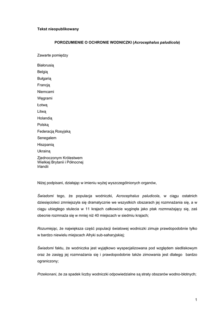Tekst nieopublikowany POROZUMIENIE O OCHRONIE WODNICZKI (Acrocephalus paludicola) Zawarte pomiędzy Białorusią Belgią Bułgarią Francją Niemcami Węgrami Łotwą Litwą Holandią Polską Federacją Rosyjską Senegalem Hiszpanią Ukrainą Zjednoczonym Królestwem Wielkiej Brytanii i Północnej Irlandii Niżej podpisani, działając w imieniu wyżej wyszczególnionych organów, Świadomi tego, że populacja wodniczki, Acrocephalus paludicola, w ciągu ostatnich dziesięcioleci zmniejszyła się dramatycznie we wszystkich obszarach jej rozmnażania się, a w ciągu ubiegłego stulecia w 11 krajach całkowicie wyginęła jako ptak rozmnażający się, zaś obecnie rozmnaża się w mniej niż 40 miejscach w siedmiu krajach; Rozumiejąc, że największa część populacji światowej wodniczki zimuje prawdopodobnie tylko w bardzo niewielu miejscach Afryki sub-saharyjskiej; Świadomi faktu, że wodniczka jest wyjątkowo wyspecjalizowana pod względem siedliskowym oraz że zasięg jej rozmnażania się i prawdopodobnie także zimowania jest dlatego bardzo ograniczony; Przekonani, że za spadek liczby wodniczki odpowiedzialne są straty obszarów wodno-błotnych; 1 Uważając, że w ukierunkowaniu środków ochronnych pomogłaby lepsza wiedza o jej biologii, trasach migracji i zimowiskach; Uważając także, iż wodniczka jest traktowana przez Światową Unię Ochrony Przyrody IUCN jako gatunek wrażliwy; Przypominając, że podpisana w Bonn, dnia 23 czerwca 1979 Konwencja w sprawie ochrony wędrownych gatunków dzikich zwierząt wzywa do międzynarodowych wspólnych działań w celu ochrony gatunków wędrownych oraz że wodniczka jest wymieniona w Załączniku I do tej Konwencji i została zidentyfikowana jako gatunek priorytetowy do prowadzenia skoordynowanych działań przez państwa jej występowania; Zdając sobie sprawę, że takie działania muszą zostać podjęte bezzwłocznie w celu uchronienia jej pozostałych populacji przed wyginięciem; Potwierdzając swoją wspólną odpowiedzialność za ochronę wodniczki i mądre gospodarowanie nią oraz siedliskami w obszarach wodno-błotnych, w których ona występuje oraz swoją wolę zaangażowania się we wspólne inicjatywy wszystkich państw jej występowania w zakresie terenów rozmnażania się i zimowania, a także wzdłuż tras migracji tego gatunku; UZGADNIAJĄ, że będą razem ściśle pracować na rzecz poprawy statusu ochronnego wodniczki na obszarach jej rozmnażania się, migracji i zimowania. W tym celu, w duchu wzajemnego zrozumienia i współpracy: 1. Zapewnią ścisłą ochronę wodniczki oraz zidentyfikują i będą chronić siedliska na obszarach wodno-błotnych istotnych dla jej przetrwania. 2. Z zastrzeżeniem osiągalności środków, wdrożą w swoich krajach postanowienia Planu Działania, [załączonego] do niniejszego Porozumienia, jako podstawy do ochrony wszystkich populacji tego gatunku. W aspekcie krótkoterminowym, celem Planu Działania będzie utrzymanie aktualnej populacji wodniczki w całym zasięgu jej występowania, zaś w aspekcie średnio- i długoterminowym, promowanie rozszerzenia rozmnażania się populacji na inne obszary jej uprzedniego występowania. Plan Działania będzie zawierał między innymi: środki ochrony tradycyjnego rozmnażania, obszary etapowe i zimowe wodniczki; postanowienia dotyczące identyfikacji kluczowych miejsc rozmnażania, migracji i zimowania wodniczek oraz przygotowania krajowych planów działania; szczegółowe postanowienia dotyczące monitoringu, badań i praktycznych środków odtworzenia populacji wodniczki; oraz propozycje ustanowienia mechanizmu finansowania tych środków ochronnych. Wdrażanie Porozumienia, a w 2 tym Planu Działania, będzie podlegać ocenie na regularnych spotkaniach, w których będą uczestniczyć przedstawiciele każdego z zainteresowanych rządów oraz osób lub agencji przygotowanych technicznie do ochrony wodniczki. Takie spotkania będą zwoływane przez Sekretariat Konwencji z 1979 roku w sprawie ochrony wędrownych gatunków dzikich zwierząt - Sekretariat UNEP/CMS - i będą goszczone przez jeden z krajów występowania lub Organizację Współpracującą oraz organizowane we współpracy 3. z nimi. Ułatwią sprawną wymianę informacji naukowej, technicznej, ekonomicznej i prawnej potrzebnej w celu koordynowania środków ochronnych; oraz będą współpracować z uznanymi naukowcami z organizacji międzynarodowych oraz innych państw występowania w celu ułatwienia własnej pracy związanej z Planem Działania. 4. Wyznaczą właściwy organ, który będzie służył jako punkt kontaktowy dla innych Stron i zakomunikują bez zwłoki Sekretariatowi UNEP/CMS nazwę i dane kontaktowe tego organu (oraz wszelkie ich zmiany). 5. Dostarczą do Sekretariatu UNEP/CMS, do 31 marca każdego roku, raport w sprawie wdrażania niniejszego Porozumienia w każdym z Państw-Sygnatariuszy. Sekretariat przekaże każdemu z krajów występowania wszystkie otrzymane raporty wraz z raportem przeglądowym, który opracuje on na podstawie posiadanych przezeń informacji. Podstawowe zasady 1. Niniejsze Porozumienie będzie traktowane jako umowa na podstawie Artykułu IV, paragraf 4, Konwencji w sprawie ochrony wędrownych gatunków dzikich zwierząt („Konwencji Bońskiej”). Porozumienie wejdzie w życie w dniu (data) dla tych dwóch lub więcej krajów występowania, które je podpisały. Pozostanie ono otwarte do podpisania przez czas nie określony i wejdzie w życie dla wszystkich innych Państw-Sygnatariuszy pierwszego dnia pierwszego miesiąca następującego po dacie podpisania przez nie. Porozumienie pozostanie w mocy przez czas nie określony z zastrzeżeniem prawa każdej ze Stron do wypowiedzenia swojego uczestnictwa poprzez dostarczenie wszystkim innym Stronom pisemnego zawiadomienia z jednorocznym wyprzedzeniem. 2. Niniejsze Porozumienie mogą podpisać wszystkie kraje występowania wodniczki. 3. Nic w niniejszym Porozumieniu nie wi