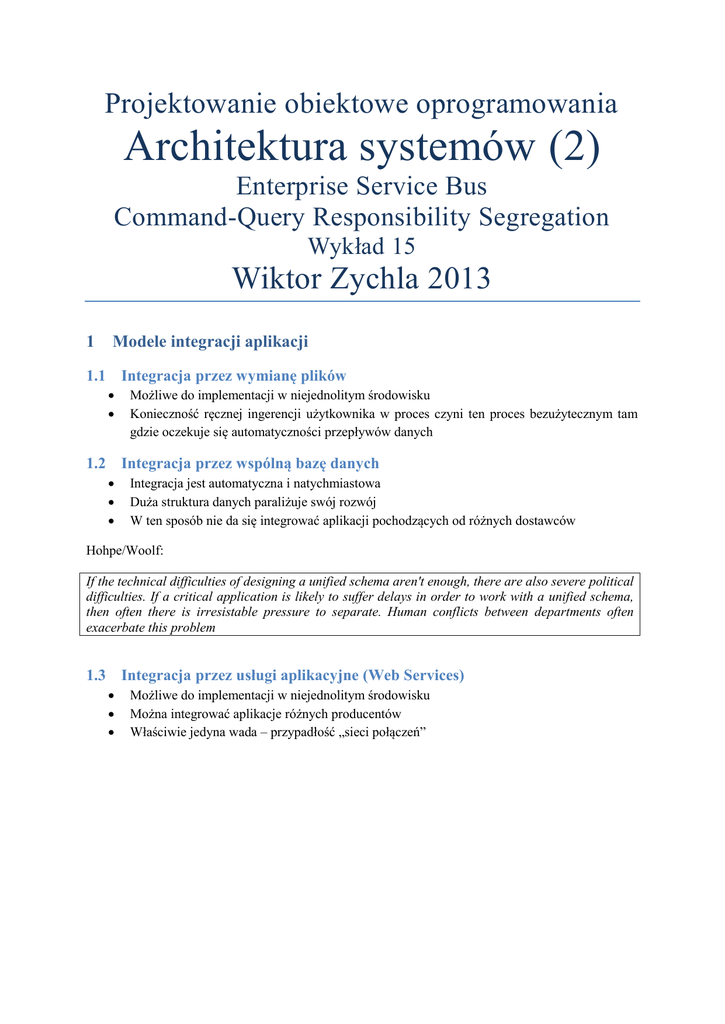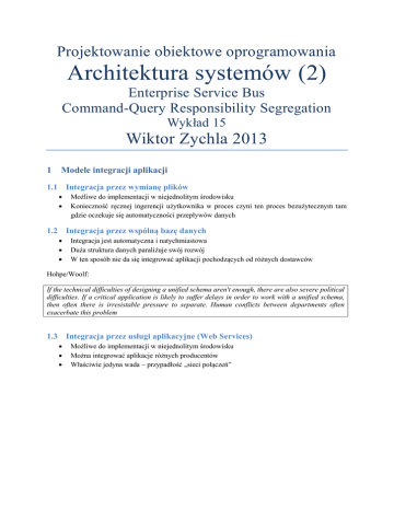 Projektowanie obiektowe oprogramowania Architektura systemów (2) Enterprise Service Bus Command-Query Responsibility Segregation Wykład 15 Wiktor Zychla 2013 1 Modele integracji aplikacji 1.1 Integracja przez wymianę plików Możliwe do implementacji w niejednolitym środowisku Konieczność ręcznej ingerencji użytkownika w proces czyni ten proces bezużytecznym tam gdzie oczekuje się automatyczności przepływów danych 1.2 Integracja przez wspólną bazę danych Integracja jest automatyczna i natychmiastowa Duża struktura danych paraliżuje swój rozwój W ten sposób nie da się integrować aplikacji pochodzących od różnych dostawców Hohpe/Woolf: If the technical difficulties of designing a unified schema aren't enough, there are also severe political difficulties. If a critical application is likely to suffer delays in order to work with a unified schema, then often there is irresistable pressure to separate. Human conflicts between departments often exacerbate this problem 1.3 Integracja przez usługi aplikacyjne (Web Services) Możliwe do implementacji w niejednolitym środowisku Można integrować aplikacje różnych producentów Właściwie jedyna wada – przypadłość „sieci połączeń” 1.4 Integracja za pośrednictwem szyny usług 2 Połączenie pomysłu integracji przez usługi aplikacyjne z ideą wzorca Observer Każda aplikacja łączy się z szyną usług i publikuje lub subskrybuje powiadomienia Złożoność sieci połączeń jest liniowa – każda aplikacja integruje się tylko z szyną usług Szyna dostarcza mechanizmów wiarygodnego dostarczania komunikatów Enterprise Service Bus (Integracyjna szyna usług) Message-oriented architecture – model architektury zorientowany na komunikaty wymieniane między modułami. Ciekawie zaczyna robić się wtedy, kiedy mówimy o architekturze systemów ponieważ wtedy do wymiany komunikatów niezbędny staje się zewnątrzprocesowy pośrednik – Message-oriented Middleware (MOM). Enterprise Service Bus – usługa zewnątrzprocesowa typu MOM, dostarczająca narzędzi komunikacyjnych w rozległym środowisku aplikacyjnym. Szczegóły niżej. Przykład – wiele niezależnych systemów bankowych, integracja przelewów i innych operacji finansowych – natychmiastowa aktualizacja między systemami. W praktyce wzorzec ESB tak samo dobrze organizuje architekturę systemu, jak Event Aggregator organizował architekturę aplikacji. 2.1 Szyna usług - podstawowe pojęcia Publish/Subscribe – wzorzec wymiany komunikatów w szynie usług, w którym wybrane aplikacje pełnią rolę publikatorów komunikatów (powiadomień), a inne pełnią rolę subskrybentów tych komunikatów. Na tym atomowym wzorcu oparte są pozostałe wzorce złożone – Request/Reply i Saga. Request/Reply – wzorzec wymiany komunikatów w szynie usług, w którym aplikacja zadaje zapytanie do szyny usług, a jedna (zwyczajowo) z aplikacji jest zarejestrowana jako dostawca takich danych i odpowiada na żądanie. Należy zauważyć, że R/R implementuje się z wykorzystaniem wzorca P/S – R/R dla aplikacji A i B wygląda następująco: B subskrybuje komunikatu typu „Żądam danych typu X” A subskrybuje komunikat typu „Odpowiedź na zapytanie o dane typu X” A publikuje komunikat typu „Żądam danych typu X” B otrzymuje komunikat i go przetwarza; publikuje komunikat typu „Odpowiedź na zapytanie o dane typu X” i w adresata wstawia A (opcjonlanie) Szyna filtruje komunikat tak żeby dostał go tylko A A otrzymuje odpowiedź Saga (inaczej long running transaction; transakcja długoterminowa) – wzorzec wymiany komunikatów w szynie usług, oparty o złożony proces biznesowy, którego koordynatorem jest szyna. Proces zwykle składa się z atomowych kroków, najważniejsze z nich to komunikacja z portami wejścia/wyjścia. Przykładowa saga: komunikat od konsultanta do spraw sprzedaży z wnioskiem o kredyt dla klienta trafia do szyny. Jeśli kwota kredytu jest mniejsza niż 1000$, szyna tworzy komunikat typu „aprobata wniosku” i przekazuje nowy komunikat do serwera departamentu wypłacania kredytów. Jeśli kwota kredytu jest większa lub równa 1000$, szyna przekazuje ten komunikat dalej, do serwera departamentu kredytowego, gdzie komunikat oczekuje w systemie na akceptację kierownika działu. Szyna oczekuje na odpowiedź nie dłużej niż 48h. Jeśli w tym czasie nadchodzi odpowiedź pozytywna – szyna konwertuje ją na komunikat typu „aprobata wniosku” i przekazuje nowy komunikat do serwera departamentu wypłacania kredytów. Jeśli odpowiedź jest odmowna lub upłynęło więcej niż 48h, szyna tworzy komunikat typu „odmowa” i przekazuje zwrotnie do systemu, w którym zobaczy go konsultant. Rysunek 1 (za http://www.codeproject.com/Articles/13277/Configuring-BizTalk-Orchestrations-to-handle-un-ty) (Uwaga! Diagram nie odpowiada treści przykładowego procesu!) Asynchroniczna komunikacja – dlaczego rozproszonych usług integracyjnych nie można zaimplementować tak samo jak wzorca Observer? Dlatego że subskrybenci mają różne tempo przetwarzania powiadomień. Sto powiadomień od A do B i C może być przez B przetwarzane w ciągu 1 sekundy, a przez C w ciągu 1 godziny. Szyna musi wiarygodnie koordynować przekazywanie komunikatów i wymaga wsparcia jakiegoś repozytorium trwałego, np. relacyjnej bazy danych lub usługi kolejkowania wiadomości. Specyfikacje formatów wymiany danych – zwyczajowo szyny usług do integracji aplikacji niejednolitych technologicznie wykorzystują nośnik XML, wsparty opcjonalnie walidacją XSD Port wejścia – szyny są usługami zewnątrzprocesowymi; typowa szyna usług jest równocześnie usługą systemową (demonem systemowym). To oznacza, że komunikat trzeba do szyny jakoś dostarczyć. Port wejścia jest abstrakcją źródła danych, a typowe tzw. adaptery (implementacje konkretne) obejmują: relacyjne bazy danych, system plików czy usługi aplikacyjne. Na przykład więc por