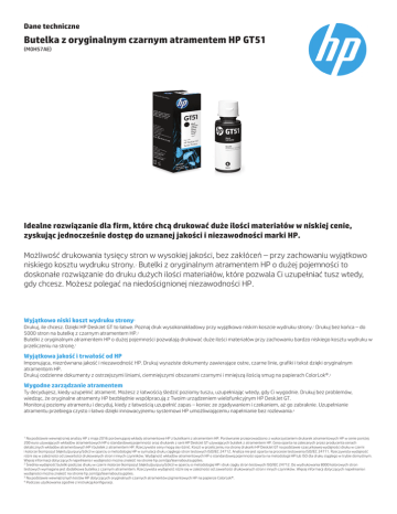 Dane techniczne Butelka z oryginalnym czarnym atramentem HP GT51 (M0H57AE) Idealne rozwiązanie dla firm, które chcą drukować duże ilości materiałów w niskiej cenie, zyskując jednocześnie dostęp do uznanej jakości i niezawodności marki HP. Możliwość drukowania tysięcy stron w wysokiej jakości, bez zakłóceń – przy zachowaniu wyjątkowo niskiego kosztu wydruku strony. Butelki z oryginalnym atramentem HP o dużej pojemności to doskonałe rozwiązanie do druku dużych ilości materiałów, które pozwala Ci uzupełniać tusz wtedy, gdy chcesz. Możesz polegać na niedoścignionej niezawodności HP. 1 Wyjątkowo niski koszt wydruku strony 1 Drukuj, ile chcesz. Dzięki HP DeskJet GT to łatwe. Poznaj druk wysokonakładowy przy wyjątkowo niskim koszcie wydruku strony.1 Drukuj bez końca – do 5000 stron na butelkę z czarnym atramentem HP.2 Butelki z oryginalnym atramentem HP o dużej pojemności pozwalają drukować duże ilości materiałów przy zachowaniu bardzo niskiego kosztu wydruku w przeliczeniu na stronę.1 Wyjątkowa jakość i trwałość od HP Imponująca, niezrównana jakość i niezawodność HP. Drukuj wyraziste dokumenty zawierające ostre, czarne linie, grafiki i tekst dzięki oryginalnym atramentom HP. Drukuj codzienne dokumenty z ostrzejszymi liniami, ciemniejszymi obszarami czarnymi i mniejszą ilością smug na papierach ColorLok®.3 Wygodne zarządzanie atramentem Ty decydujesz, kiedy uzupełnić atrament. Możesz z łatwością śledzić poziomy tuszu, uzupełniając wtedy, gdy Ci wygodnie. Drukuj bez problemów, wiedząc, że oryginalne atramenty HP bezbłędnie współpracują z Twoim urządzeniem wielofunkcyjnym HP DeskJet GT. Monitoruj poziomy atramentu i decyduj, kiedy z łatwością uzupełnić zapas – koniec ze zgadywaniem i czekaniem, aż go zabraknie. Uzupełnianie atramentu przebiega czysto i łatwo dzięki innowacyjnemu systemowi HP umożliwiającemu napełnianie bez rozlewania.4 Na podstawie wewnętrznej analizy HP z maja 2016 porównującej wkłady atramentowe HP z butelkami z atramentem HP. Porównanie przeprowadzono z wykorzystaniem drukarek atramentowych HP w cenie poniżej 200 euro używających wkładów atramentowych HP o standardowej pojemności oraz drukarek z serii HP DeskJet GT używających butelek z atramentem HP. Cena oparta na zalecanych przez producenta cenach detalicznych wkładów atramentowych HP i butelek z atramentem HP. Rzeczywiste ceny mogą się różnić. Koszt w przeliczeniu na stronę drukarki HP DeskJet GT na podstawie szacunkowej wydajności druku w czerni i kolorze (kompozyt błękitu/purpury/żółci) w oparciu o metodologię HP w symulacji druku ciągłego stron testowych ISO/IEC 24712. Analiza nie jest oparta na procesie testowania ISO/IEC 24711. Rzeczywista wydajność różni się w zależności od zawartości drukowanych stron i innych czynników. Wydajność wkładów atramentowych HP o standardowej pojemności oparta na metodologii HP lub ISO dla druku ciągłego w trybie domyślnym. Więcej informacji dotyczących napełniania i wydajności można znaleźć na stronie hp.com/go/learnaboutsupplies. 2 Średnia wydajność butelki podczas druku w czerni i kolorze (kompozyt błękitu/purpury/żółci) w oparciu o metodologię HP i druk ciągły stron testowych ISO/IEC 24712. Do wydrukowania 8000 kolorowych stron testowych wymagana jest dodatkowa butelka z czarnym atramentem. Rzeczywista wydajność różni się w zależności od zawartości drukowanych stron i innych czynników. Więcej informacji dotyczących napełniania i wydajności można znaleźć na stronie hp.com/go/learnaboutsupplies. 3 Na podstawie wewnętrznych testów HP dotyczących oryginalnych czarnych atramentów pigmentowych HP na papierze ColorLok®. 4 Podczas użytkowania zgodnie z instrukcją konfiguracji. 1 Dane techniczne | Butelka z oryginalnym czarnym atramentem HP GT51 Informacje o zgodności Urządzenie wielofunkcyjne HP DeskJet GT 5810; Urządzenie wielofunkcyjne HP DeskJet GT 5820 Dane techniczne produktu P/N Opis Średnia wydajność kasety z tonerem * Wymiary (dł x szer x gł) Waga Kod UPC M0H57AE Butelka z oryginalnym czarnym atramentem HP GT51 ok. 5000 stron 47 × 47 × 141 mm 0,13 kg 190780132579 *Średnia wydajność butelki podczas druku w czerni i kolorze (kompozyt błękitu/purpury/żółci) w oparciu o metodologię HP w symulacji druku ciągłego stron testowych ISO/IEC 24712. Wyniki nie pochodzą z procesu testowego ISO/IEC 24711. Do wydrukowania 8000 kolorowych stron testowych wymagana jest dodatkowa butelka z czarnym tuszem. Rzeczywista wydajność różni się w zależności od zawartości drukowanych stron i innych czynników. Więcej informacji dotyczących napełniania i wydajności można znaleźć na stronie hp.com/go/learnaboutsupplies. Gwarancja Firma HP gwarantuje, że oryginalne wkłady atramentowe i głowice drukujące HP są wolne od wad materiałowych i produkcyjnych przez okres obowiązywania gwarancji. Aby uzyskać więcej informacji na temat materiałów konsumpcyjnych HP, odwiedź http://www.hp.com Produkt może odbiegać wyglądem od widocznego na ilustracjach. © Copyright 2016 HP Development Company, L.P. Informacje zawarte w niniejszym dokumencie mogą ulec zmianie bez powiadomienia. Jedyne gwarancje, jakich firma HP udziela na produkty i usługi, są określone w oświadczeniach gwarancyjnych dostarczanych wraz z tymi produktami i usługami. Żadne informacje przedstawione w niniejszym dokumencie nie powinny być interpretowane jako dodatkowa gwarancja. Firma HP nie ponosi odpowiedzialności za błędy techniczne lub redakcyjne oraz braki występujące w niniejszym dokumencie. 4AA6-7837PLE, Grudzień 2016