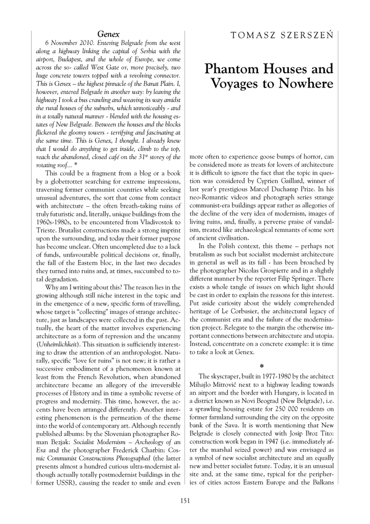 Genex 6 November 2010. Entering Belgrade from the west along a highway linking the capital of Serbia with the airport, Budapest, and the whole of Europe, we come across the so- called West Gate or, more precisely, two huge concrete towers topped with a revolving connector. This is Genex —the highest pinnacle of the Banat Plain. I, however, entered Belgrade in another way: by leaving the highway I took a bus crawling and weaving its way amidst the rural houses of the suburbs, which unnoticeably - and in a totally natural manner - blended with the housing es tates of New Belgrade. Between the houses and the blocks flickered the gloomy towers - terrifying and fascinating at the same time. This is Genex, I thought. I already knew that I would do anything to get inside, climb to the top, reach the abandoned, closed café on the 31st storey of the rotating roof... * This could be a fragment from a blog or a book by a globetrotter searching for extreme impressions, traversing former communist countries while seeking unusual adventures, the sort that come from contact with architecture - the often breath-taking ruins of truly futuristic and, literally, unique buildings from the 1960s-1980s, to be encountered from Vladivostok to Trieste. Brutalist constructions made a strong imprint upon the surrounding, and today their former purpose has become unclear. Often uncompleted due to a lack of funds, unfavourable political decisions or, finally, the fall of the Eastern bloc, in the last two decades they turned into ruins and, at times, succumbed to to tal degradation. Why am I writing about this? The reason lies in the growing although still niche interest in the topic and in the emergence of a new, specific form of travelling, whose target is “collecting” images of strange architec ture, just as landscapes were collected in the past. A c tually, the heart of the matter involves experiencing architecture as a form of repression and the uncanny (Unheimlichkeit). This situation is sufficiently interest ing to draw the attention of an anthropologist. N atu rally, specific “love for ruins” is not new; it is rather a successive embodiment of a phenomenon known at least from the French Revolution, when abandoned architecture became an allegory of the irreversible processes of History and in time a symbolic reverse of progress and modernity. This time, however, the ac cents have been arranged differently. Another inter esting phenomenon is the permeation of the theme into the world of contemporary art. Although recently published albums: by the Slovenian photographer Ro man Bezjak: Socialist Modernism — Archeology of an Era and the photographer Frederick Charbin: Cos mic Communist Constructions Photographed (the latter presents almost a hundred curious ultra-modernist al though actually totally postmodernist buildings in the former USSR), causing the reader to smile and even 151 TOMASZ SZERSZEŃ Phantom Houses and Voyages to Nowhere more often to experience goose bumps of horror, can be considered more as treats for lovers of architecture it is difficult to ignore the fact that the topic in ques tion was considered by Cyprien Gaillard, winner of last year’s prestigious Marcel Duchamp Prize. In his neo-Romantic videos and photograph series strange communist-era buildings appear rather as allegories of the decline of the very idea of modernism, images of living ruins, and, finally, a perverse praise of vandal ism, treated like archaeological remnants of some sort of ancient civilisation. In the Polish context, this theme - perhaps not brutalism as such but socialist modernist architecture in general as well as its fall - has been broached by the photographer Nicolas Grospierre and in a slightly different manner by the reporter Filip Springer. There exists a whole tangle of issues on which light should be cast in order to explain the reasons for this interest. Put aside curiosity about the widely comprehended heritage of Le Corbusier, the architectural legacy of the communist era and the failure of the modernisa tion project. Relegate to the margin the otherwise im portant connections between architecture and utopia. Instead, concentrate on a concrete example: it is time to take a look at Genex. * The skyscraper, built in 1977-1980 by the architect Mihajlo Mitrovic next to a highway leading towards an airport and the border with Hungary, is located in a district known as Novi Beograd (New Belgrade), i.e. a sprawling housing estate for 250 000 residents on former farmland surrounding the city on the opposite bank of the Sava. It is worth mentioning that New Belgrade is closely connected with Josip Broz Tito: construction work began in 1947 (i.e. immediately af ter the marshal seized power) and was envisaged as a symbol of new socialist architecture and an equally new and better socialist future. Today, it is an unusual site and, at the same time, typical for the peripher ies of cities across Eastern Europe and the Balkans Tomasz S z erszen • PHANTO M H O U S E S A N D VOYAGES TO N OWHERE - m o de r n a a d often inreresting a rcUitecture bouders wisp ur^cor^srciie;nrK^fus^ c^unrpsE^nm e^mcor^m bpiid' ing s .lt U eko wnrth rv t ^llicgei^i^t thesk yecroper o rs comg leted m eCSdn-p^^ yeat o i: T ieo^^ doe^t^lp .k ^ eepu tio n fu r shc C^o p ex cepc^i^t:ce^ns(^U:ium waSe rh^r^fterc, a srmbolic paoguro ,e emnptom oCall tXe fundamendal cnntO£^g^io k )o^ - r ^^isk:£^S-ctt^nkspinn eoor^on^i^Cr iO £it cxm ^o^smxl cho sued fid ta oeY sgosravitc The skytcraper wri U rütin t^ o iN li: o fb m tsiiistert cb^^^i^iutec^utc ^f ^^w « mcrcts , i.r . otasoeUil^ e i^t^gfi^e^sS strcoyly with e^i^s^uir^sron d serabxlio nuCgncs b u t riso with rab^it^r^inuspgion xnO ter mert Sdufiur the r went ti^oth ceutury concrète was used for monuments, ind u d in g fhosc orrh e H olboghrt1) •T h o xrohi^sroti^i^u oS Geaeo consitrs ge dwo rail c(^r^aceieoc^Apers - (^r^e cntis dontiels^ndeC^^e^Utess^s^ct for e ffices,r(^mism