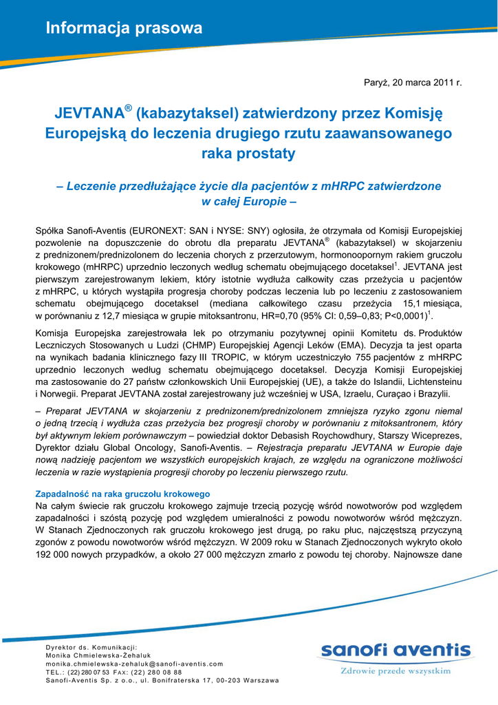 Informacja prasowa Paryż, 20 marca 2011 r. JEVTANA® (kabazytaksel) zatwierdzony przez Komisję Europejską do leczenia drugiego rzutu zaawansowanego raka prostaty – Leczenie przedłużające życie dla pacjentów z mHRPC zatwierdzone w całej Europie – Spółka Sanofi-Aventis (EURONEXT: SAN i NYSE: SNY) ogłosiła, że otrzymała od Komisji Europejskiej pozwolenie na dopuszczenie do obrotu dla preparatu JEVTANA® (kabazytaksel) w skojarzeniu z prednizonem/prednizolonem do leczenia chorych z przerzutowym, hormonoopornym rakiem gruczołu krokowego (mHRPC) uprzednio leczonych według schematu obejmującego docetaksel1. JEVTANA jest pierwszym zarejestrowanym lekiem, który istotnie wydłuża całkowity czas przeżycia u pacjentów z mHRPC, u których wystąpiła progresja choroby podczas leczenia lub po leczeniu z zastosowaniem schematu obejmującego docetaksel (mediana całkowitego czasu przeżycia 15,1 miesiąca, w porównaniu z 12,7 miesiąca w grupie mitoksantronu, HR=0,70 (95% CI: 0,59–0,83; P<0,0001)1. Komisja Europejska zarejestrowała lek po otrzymaniu pozytywnej opinii Komitetu ds. Produktów Leczniczych Stosowanych u Ludzi (CHMP) Europejskiej Agencji Leków (EMA). Decyzja ta jest oparta na wynikach badania klinicznego fazy III TROPIC, w którym uczestniczyło 755 pacjentów z mHRPC uprzednio leczonych według schematu obejmującego docetaksel. Decyzja Komisji Europejskiej ma zastosowanie do 27 państw członkowskich Unii Europejskiej (UE), a także do Islandii, Lichtensteinu i Norwegii. Preparat JEVTANA został zarejestrowany już wcześniej w USA, Izraelu, Curaçao i Brazylii. – Preparat JEVTANA w skojarzeniu z prednizonem/prednizolonem zmniejsza ryzyko zgonu niemal o jedną trzecią i wydłuża czas przeżycia bez progresji choroby w porównaniu z mitoksantronem, który był aktywnym lekiem porównawczym – powiedział doktor Debasish Roychowdhury, Starszy Wiceprezes, Dyrektor działu Global Oncology, Sanofi-Aventis. – Rejestracja preparatu JEVTANA w Europie daje nową nadzieję pacjentom we wszystkich europejskich krajach, ze względu na ograniczone możliwości leczenia w razie wystąpienia progresji choroby po leczeniu pierwszego rzutu. Zapadalność na raka gruczołu krokowego Na całym świecie rak gruczołu krokowego zajmuje trzecią pozycję wśród nowotworów pod względem zapadalności i szóstą pozycję pod względem umieralności z powodu nowotworów wśród mężczyzn. W Stanach Zjednoczonych rak gruczołu krokowego jest drugą, po raku płuc, najczęstszą przyczyną zgonów z powodu nowotworów wśród mężczyzn. W 2009 roku w Stanach Zjednoczonych wykryto około 192 000 nowych przypadków, a około 27 000 mężczyzn zmarło z powodu tej choroby. Najnowsze dane Dyrektor ds. Komunikacji: Monika Chmielewska-Żehaluk [email protected] T E L . : ( 22) 280 07 53 F A X : ( 2 2 ) 2 8 0 0 8 8 8 Sanofi-Aventis Sp. z o.o., ul. Bonifraterska 17, 00-203 Warszawa wskazują, że w Unii Europejskiej każdego roku pojawia się około 300 000 nowych przypadków raka gruczołu krokowego2. U wielu pacjentów z rakiem gruczołu krokowego choroba ta nadal postępuje pomimo wcześniejszego leczenia – w tym także chirurgicznego i/lub metodą kastracji hormonalnej, a następnie chemioterapii. W przerzutowym raku gruczołu krokowego dochodzi do rozsiewu nowotworu do węzłów chłonnych lub innych części organizmu, zwłaszcza kości. Rak gruczołu krokowego oporny na kastrację/hormonooporny oznacza nowotwór, który nadal się rozwija pomimo supresji hormonów męskich stymulujących wzrost komórek raka gruczołu krokowego. Szacuje się, że u 10–20 procent pacjentów z rakiem gruczołu krokowego choroba ta jest rozpoznawana dopiero w stadium przerzutowym. Informacje o badaniu TROPIC Wyniki badania TROPIC wykazały 30-procentową [HR=0,70 (95% CI: 0,59–0,83); P<0,0001] redukcję ryzyka zgonu z powodu mHRPC wśród pacjentów przyjmujących preparat JEVTANA w skojarzeniu z prednizonem lub prednizolonem, w porównaniu ze schematem chemioterapii obejmującym standardową dawkę mitoksantronu oraz prednizon lub prednizolon. Ponadto mediana czasu przeżycia pacjentów otrzymujących preparat JEVTANA wynosiła 15,1 miesiąca, czyli o 2,4 miesiąca dłużej niż wśród pacjentów otrzymujących mitoksantron2. W badaniu TROPIC najczęstszymi (≥10%) zdarzeniami niepożądanymi stopnia ≥3 były: niedokrwistość, leukopenia, neutropenia, małopłytkowość i biegunka. Najczęstszymi (≥5%) działaniami niepożądanymi stopnia 3–4 u pacjentów, którzy otrzymywali preparat JEVTANA, były: neutropenia, leukopenia, niedokrwistość, gorączka neutropeniczna i biegunka. Informacje o preparacie JEVTANA® (kabazytaksel do wstrzykiwań) Preparat JEVTANA jest półsyntetycznym taksanem, którego mechanizm działania jest inny niż w przypadku docetakselu i paklitakselu. Jest to lek przeciwnowotworowy, którego działanie polega na zakłócaniu funkcjonowania sieci mikrotubuli w komórkach. Wiąże się on z tubuliną i sprzyja jej wbudowywaniu do mikrotubuli, a jednocześnie hamuje rozpad takiego połączenia. Prowadzi to do stabilizacji mikrotubuli. Preparat JEVTANA wykazuje szerokie spektrum działania przeciwnowotworowego przeciwko zaawansowanym guzom litym wszczepionym w formie heteroprzeszczepów u myszy. Ponadto wykazuje także aktywność w guzach wrażliwych na docetaksel oraz w modelach guzów niewrażliwych na chemioterapię, w tym docetaksel. Informacje o Dziale Sanofi-Aventis Oncology Dział Sanofi-Aventis Oncology z siedzibą w Cambridge, w stanie Massachusetts oraz Vitry we Francji, zajmuje się przekładaniem nauki na skuteczne terapie przeciwnowotworowe w celu zaspokojenia istniejących potrzeb medycznych pacjentów z nowotworami. Począwszy od dogłębnego zrozumienia mechanizmów rozwoju, wzrostu i rozsiewu nowotworów, a także od zidentyfikowania właściwej gałęzi nauki na wczesnym etapie procesu dokonywania odkryć, spółka stosuje innowacyjne metod