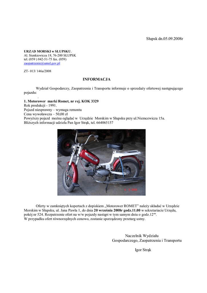 upsk dn.05.09.2008r URZAD MORSKI w S UPSKU. Al. Sienkiewicza 18, 76-200 S UPSK tel. (059 ) 842-51-75 fax. (059) [email protected] ZT- 013/ 146a/2008 INFORMACJA Wydzia Gospodarczy, Zaopatrzenia i Transportu informuje o sprzeda y ofertowej nast puj cego pojazdu: . 1. Motorower marki Romet, nr rej. KOK 3329 Rok produkcji - 1991. Pojazd niesprawny – wymaga remontu Cena wywo awcza – 50,00 z Powy szy pojazd mo na ogl da w Urz dzie Morskim w S upsku przy ul.Niemcewicza 15a. Bli szych informacji udziela Pan Igor Str k, tel. 664065157 Oferty w zamkni tych kopertach z dopiskiem „Motorower ROMET” nale y sk ada w Urz dzie Morskim w S upsku, ul. Jana Paw a 1, do dnia 20 wrze nia 2008r godz.11.00 w sekretariacie Urz du, pokój nr 524. Rozpatrzenie ofert na w/w pojazdy nast pi w tym samym dniu o godz.12ºº. W przypadku ofert równorz dnych cenowo, zostanie sporz dzony przetarg ustny. Naczelnik Wydzia u Gospodarczego, Zaopatrzenia i Transportu Igor Str k
