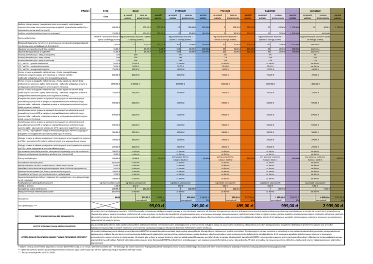 PAKIET: Free Basic w ramach pakietu Cena Godzina obsługi prawnej (sporządzanie pism procesowych, opinii prawnych, czynności terenowe, zastępstwo procesowe w sądach, prowadzenie mediacji itp. z wyłączeniem spraw windykacyjnych) Godzina konsultacji telefonicznych i e-‐mailowych Czynności terenowe Bieżąca obsługa spraw (w tym m.in. przyjmowanie korespondencji przychodzącej) -‐ nie dotyczy spraw windykacyjnych [miesięcznie] Wysłanie korespondencji w trybie zwykłym Wysłniei korespondencji w trybie KPC Prowizja windykacyjna -‐ etap przedsądowy Prowizja windykacyjna -‐ etap sądowy Prowizja windykacyjna -‐ etap przymusowy ITD / vaiTOLL -‐ porada telefoniczna ITD / vaiTOLL -‐ analiza dokumentów ITD / vaiTOLL -‐ przygotowanie pisma Pomoc prawna w przypadku nałożenia kary z tytułu nieprawidłowego określenia kategorii pojazdu przy rejestracji w systemie viaTOLL – (całkowite zastępstwo prawne przy prowadzeniu sprawy). Pomoc prawna w przypadku nałożenia kary z tytułu wjazdu na odcinek drogi publicznej bez uiszczenia opłaty elektronicznej: -‐ całkowite zastępstwo prawne w postępowaniu administracyjnym przed organem I instancji Pomoc prawna w przypadku nałożenia kary z tytułu wjazdu na odcinek drogi publicznej bez uiszczenia opłaty elektronicznej: -‐ całkowite zastępstwo prawne w postępowaniu administracyjnym przed organem II instancji Kompleksowa pomoc prawna w sprawach dotyczących kar administracyjnych prowadzonych przez GITD w związku z nieprawidłowościami elektronicznego systemu opłat -‐ całkowite zastępstwo prawne w postępowaniu administracyjnym przed organem I instancji Kompleksowa pomoc prawna w sprawach dotyczących kar administracyjnych prowadzonych przez GITD w związku z nieprawidłowościami elektronicznego systemu opłat -‐ całkowite zastępstwo prawne w postępowaniu administracyjnym przed organem II instancji Kompleksowa pomoc prawna w sprawach dotyczących kar administracyjnych prowadzonych przez GITD w związku z nieprawidłowościami elektronicznego systemu opłat -‐ sporządzenie wniosku do GITD o ponowne rozpatrzenie sprawy ITD / viaTOLL -‐ Sporządzenie skargi do Wojewódzkiego Sądu Administracyjnego w przypadku nieuwzględnienia odwołania przez organ II instancji. Obsługa prawna w zakresie postępowań reklamacyjnych przed operatorem systemu viaTOLL -‐ sporządzenie formularzy reklamacyjnych oraz wypowiedzenia umowy Obsługa prawna w zakresie postępowań reklamacyjnych przed operatorem systemu viaTOLL -‐ pełne zastępstwo w procesie reklamacyjnym Opracowanie i wdrożenie procedur zabezpieczenia prawnego przyszłych należności Prawo do posługiwania się pieczęcią windykacyjną [miesięcznie] w ramach pakietu Superior cena po przekroczeniu wartość pakietu w ramach pakietu Exclusive cena po przekroczeniu wartość pakietu 2,0 130,00 zł 260,00 zł 5 120,00 zł 600,00 zł 10 110,00 zł 1 100,00 zł 150,00 zł 1 100,00 zł 100,00 zł 2,0 90,00 zł 180,00 zł 5 80,00 zł 400,00 zł 15 70,00 zł 1 050,00 zł 100,00 zł + poniesione koszty + wg posniesionych kosztów + opłata opłata za obsługę prawną za obsługę prawną 10,00 zł 15 wg posniesionych kosztów + opłata za obsługę prawną 10,00 zł 150,00 zł 10,00 zł 15,00 zł 0,00 zł 0,00 zł wg posniesionych kosztów + opłata za obsługę prawną wg posniesionych kosztów + opłata za obsługę prawną w ramach pakietu cena po przekroczeniu 25 30,0 10,00 zł 300,00 zł 60 10,00 zł 600,00 zł 150 10,00 zł 1 500,00 zł bez limitu 10,0 10,0 9% 14% 18% za darmo 50,00 zł 140,00 zł 10,00 zł 15,00 zł 100,00 zł 150,00 zł 35 35 7% 12% 16% za darmo 50,00 zł 130,00 zł 10,00 zł 15,00 zł 350,00 zł 525,00 zł 50 50 5% 10% 15% za darmo 50,00 zł 120,00 zł 10,00 zł 15,00 zł 500,00 zł 750,00 zł bez limitu bez limitu 5% 10% 15% za darmo za darmo 100,00 zł 800,00 zł 800,00 zł 800,00 zł 750,00 zł 750,00 zł 700,00 zł 1 000,00 zł 1 000,00 zł 1 000,00 zł 1 000,00 zł 1 000,00 zł 750,00 zł 750,00 zł 750,00 zł 750,00 zł 750,00 zł 750,00 zł 500,00 zł 500,00 zł 500,00 zł 500,00 zł 500,00 zł 500,00 zł 500,00 zł 500,00 zł 500,00 zł 500,00 zł 500,00 zł 500,00 zł 500,00 zł 500,00 zł 500,00 zł 500,00 zł 500,00 zł 500,00 zł 500,00 zł 500,00 zł 500,00 zł 500,00 zł 500,00 zł 500,00 zł 100,00 zł 100,00 zł 100,00 zł 100,00 zł 100,00 zł 100,00 zł 200,00 zł 200,00 zł 500,00 zł 50,00 zł za darmo za darmo 50,00 zł 100,00 zł za darmo 200,00 zł 50,00 zł wg stawek ustawowych wg stawek ustawowych 1,00 zł 0,50 zł 200,00 zł -‐ 150,00 zł za darmo za darmo BRAK 199,00 zł 450,00 zł oszczędność 50% za darmo za darmo pierwsza za darmo, kolejne: 50,00 zł za darmo za darmo za darmo za darmo za darmo 200,00 zł 50,00 zł za darmo za darmo pierwsza za darmo, kolejne: 50,00 zł za darmo za darmo za darmo za darmo za darmo 200,00 zł 100,00 zł za darmo za darmo trzy pierwsze za darmo, 300,00 zł kolejne: 50,00 zł za darmo za darmo za darmo za darmo za darmo 200,00 zł za darmo za darmo trzy pierwsze za darmo, 300,00 zł kolejne: 50,00 zł za darmo za darmo za darmo za darmo za darmo za darmo za darmo za darmo za darmo wg stawek ustawowych 0,50 zł -‐ 130,00 zł za darmo wg stawek ustawowych 0,50 zł -‐ 110,00 zł za darmo wg stawek ustawowych 0,50 zł -‐ 100,00 zł za darmo wg stawek ustawowych 0,50 zł -‐ 75,00 zł za darmo 499,00 zł 1 040,00 zł oszczędność 50% 999,00 zł 2 575,00 zł oszczędność 60% 2 250,00 zł bez limitu -‐ -‐ 10% 15% 20% 50,00 zł 50,00 zł 150,00 zł 1 000,00 zł 90,00 zł wartość pakietu wg posniesionych kosztów + opłata za obsługę prawną 10,00 zł 15,00 zł 15% 20% 25% 50,00 zł 50,00 zł 150,00 zł za darmo za darmo za darmo za darmo za darmo OFERTA OBSŁUGI PRAWNEJ W RAMACH "KLINIKI PIERWSZEGO KONTAKTU" wartość pakietu 150,00 zł 100,00 zł OFERTA WINDYKACYJNA W RAMACH PAKIETÓW Prestige cena po przekroczeniu 150,00 zł za darmo 20,00 zł 20,00 zł 10