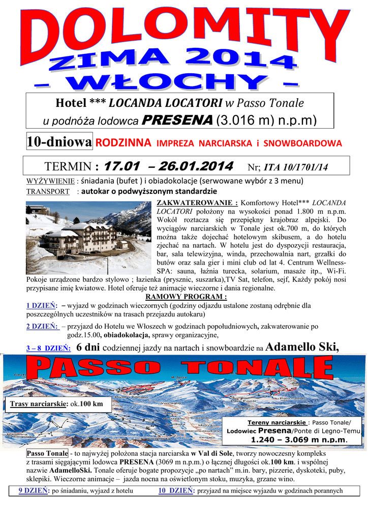 Hotel *** LOCANDA LOCATORI w Passo Tonale u podnóża lodowca PRESENA 10-dniowa RODZINNA (3.016 m) n.p.m) IMPREZA NARCIARSKA i SNOWBOARDOWA TERMIN : 17.01 – 26.01.2014 Nr; ITA 10/1701/14 WYŻYWIENIE : śniadania (bufet ) i obiadokolacje (serwowane wybór z 3 menu) TRANSPORT : autokar o podwyższonym standardzie ZAKWATEROWANIE : Komfortowy Hotel*** LOCANDA LOCATORI położony na wysokości ponad 1.800 m n.p.m. Wokół roztacza się przepiękny krajobraz alpejski. Do wyciągów narciarskich w Tonale jest ok.700 m, do których można także dojechać hotelowym skibusem, a do hotelu zjechać na nartach. W hotelu jest do dyspozycji restauracja, bar, sala telewizyjna, winda, przechowalnia nart, grzałki do butów oraz sala gier i mini club od lat 4. Centrum WellnessSPA: sauna, łaźnia turecka, solarium, masaże itp., Wi-Fi. Pokoje urządzone bardzo stylowo ; łazienka (prysznic, suszarka),TV Sat, telefon, sejf, Każdy pokój nosi przypisane imię kwiatowe. Hotel oferuje też animacje wieczorne i dania regionalne. RAMOWY PROGRAM : 1 DZIEŃ: – wyjazd w godzinach wieczornych (godziny odjazdu ustalone zostaną odrębnie dla poszczególnych uczestników na trasach przejazdu autokaru) 2 DZIEŃ: – przyjazd do Hotelu we Włoszech w godzinach popołudniowych, zakwaterowanie po godz.15.00, obiadokolacja, sprawy organizacyjne, 3 – 8 DZIEŃ: 6 dni codziennej jazdy na nartach i snowboardzie na Adamello Ski, Trasy narciarskie: ok.100 km Tereny narciarskie : Passo Tonale/ Presena/Ponte di Legno-Temu, 1.240 – 3.069 m n.p.m. Lodowiec Passo Tonale - to najwyżej położona stacja narciarska w Val di Sole, tworzy nowoczesny kompleks z trasami sięgającymi lodowca PRESENA (3069 m n.p.m.) o łącznej długości ok.100 km. i wspólnej nazwie AdamelloSki. Tonale oferuje bogate propozycje „po nartach” m.in. bary, pizzerie, dyskoteki, puby, sklepiki. Wieczorne animacje – jazda nocna na oświetlonym stoku, muzyka, grzane wino. 9 DZIEŃ: po śniadaniu, wyjazd z hotelu 10 DZIEŃ: przyjazd na miejsce wyjazdu w godzinach porannych • • • • CENA w pokojach 2 lub 3 osobowych, Osoby Dorosłe ; 1.595,00 • Dorośli w pok. 4 os. ; 1.495,00 PLN • zakwaterowanie pok. 1 os. – 1.910,00 PLN PLN Dzieci 0-2 lata gratis (tylko nocleg , bez dodatkowego łóżka ) ; 600,00 PLN Dzieci 2-8 lat ( w pokoju 3-4 os. z dwoma osobami pełnopłatnymi ) ; 1.380,00 PLN Dzieci-młodzież 8-16 lat w pokoju z 2 os dorosłymi lub z rówieśnikami w pokoju 3 - 4 os;1.495,00 PLN CENA OBEJMUJE : - 8 dni pobytu (7 noclegów) zakwaterowanie w pokojach 2,3,4 osobowych, w zależności od wykupionego wariantu, każdy z pełnym węzłem sanitarnym, TV SAT i telefonem, - transport autokarem na całej trasie oraz dojazdy na wyciągi narciarskie, - wyżywienie: wyżywienie: od 2 dnia imprezy (18.01.14) - obiadokolacja (serwowana), od 2 dnia do 8 dnia pobytu (19.01-24.02.2013) śniadania ( bufet) i obiadokolacje (serwowane) wybór z 3 zestawów menu, bufet sałatkowy, deser , 9 dnia (25.01.2014) - śniadanie, - dwa razy w tygodniu kolacja regionalna : menu TRENTINO, menu LOMBARDO, - korzystanie z serwisu hotelowego; recepcja, holl, restauracja, bar, winda, sala TV, depozyt sprzętu sportowego z grzałkami do butów, sala gier, mini club od lat 4, - animacje wieczorne w hotelu ; wieczorek TANECZNY przy muzyce na żywo i wieczorek KARAOKE, we wtorki i czwartki – jazda nocna na jednym ze stoków TONALE w godz. 20.30- 23.00 – muzyka. - ubezpieczenie uczestników od NNW – 5.000 PLN i KL – 10.000 EUR z pakietem SKI - (amatorskie uprawianie narciarstwa), - opiekę pilota biura, CENA NIE OBEJMUJE: • w miejscowości Tonale znajduje się lodowisko ( wstęp ok. 8,00 € z wypożyczeniem łyżew). • imprez fakultatywnych, wstępu do Centrum Wellness-SPA: 15,00 €/os. za pakiet tygodniowy, • napojów do obiadokolacji • posiłków na stoku (należy posiadać ok. 5.00/8.00 EUR na gorące przekąski na stoku) SKIPASS ADAMELLOSKI : pozwala na jazdę na nartach w ośrodkach narciarskich: Tonale, Presena, Ponte di Legno, Temu – wszystkie te stacje połączone są między sobą nowoczesną kolejką. Cena karnetu narciarskiego 6 dniowego (UWAGA ! cena grupowa za jeden karnet): • Dorośli - € 148,00 • Dzieci i młodzież urodzone po 30.11.1996 - € 118,00 • Seniorzy ur. przed 30.11.1948 - € 148,00 • Gratis – dzieci ur. po 30.11.2005 ( z jednym rodzicem płacącym)- wymagany dokument dziecka. - obowiązkowa kaucja zwrotna za skipass magnetyczny 5,00 € i zdjęcie do karnetu - obligatoryjny kask dla dzieci poniżej 14 lat, - zgubienie KARNETU ; nie ma możliwości duplikatu w tej samej cenie, należy wykupić nowy. UCZESTNICY : - ilość uczestników min 50 max 61 osób + Pilot - Wszystkich obowiązują OWU w imprezach turystycznych organizowanych przez STANPOL, - każdy z uczestników zobowiązany jest do posiadania ważnego paszportu lub dowodu osobistego, - zalecamy posiadanie Europejskiej Karty Ubezpieczenia Zdrowotnego EKUZ (wydawanej bezpłatnie w oddziałach wojewódzkich NFZ) ORGANIZATOR : PRZEDSIĘBIORSTWO PRZYTUŁA STANISŁAW Wpis do Rejestru ORGANIZATORÓW TURYSTYKI i POŚREDNIKÓW TURYSTYCZNYCH Województwa Lubelskiego nr 036 21 – 010 ŁĘCZNA ul. Stefanii Pawlak 3 tel/fax 81 752 15 75 www.stanpol.info e-mail ; [email protected] WPŁATY: na konto w PKO BP Oddział 1 Lublin Nr 13 1020 3147 0000 8102 0052 8323
