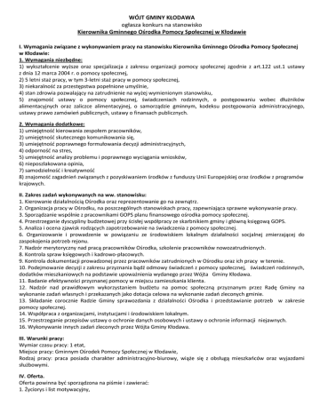 WÓJT GMINY KŁODAWA ogłasza konkurs na stanowisko Kierownika Gminnego Ośrodka Pomocy Społecznej w Kłodawie I. Wymagania związane z wykonywaniem pracy na stanowisku Kierownika Gminnego Ośrodka Pomocy Społecznej w Kłodawie: 1. Wymagania niezbędne: 1) wykształcenie wyższe oraz specjalizacja z zakresu organizacji pomocy społecznej zgodnie z art.122 ust.1 ustawy z dnia 12 marca 2004 r. o pomocy społecznej, 2) 5 letni staż pracy, w tym 3-letni staż pracy w pomocy społecznej, 3) niekaralność za przestępstwa popełnione umyślnie, 4) stan zdrowia pozwalający na zatrudnienie na wyżej wymienionym stanowisku, 5) znajomość ustawy o pomocy społecznej, świadczeniach rodzinnych, o postępowaniu wobec dłużników alimentacyjnych oraz zaliczce alimentacyjnej, o samorządzie gminnym, kodeksu postępowania administracyjnego, ustawy prawo zamówień publicznych, ustawy o finansach publicznych. 2. Wymagania dodatkowe: 1) umiejętność kierowania zespołem pracowników, 2) umiejętność skutecznego komunikowania się, 3) umiejętność poprawnego formułowania decyzji administracyjnych, 4) odporność na stres, 5) umiejętność analizy problemu i poprawnego wyciągania wniosków, 6) nieposzlakowana opinia, 7) samodzielność i kreatywność 8) znajomość zagadnień związanych z pozyskiwaniem środków z funduszy Unii Europejskiej oraz środków z programów krajowych. II. Zakres zadań wykonywanych na ww. stanowisku: 1. Kierowanie działalnością Ośrodka oraz reprezentowanie go na zewnątrz. 2. Organizacja pracy w Ośrodku, na poszczególnych stanowiskach pracy, zapewniająca sprawne wykonywanie pracy. 3. Sporządzanie wspólnie z pracownikami GOPS planu finansowego ośrodka pomocy społecznej. 4. Przestrzeganie dyscypliny budżetowej przy ścisłej współpracy ze skarbnikiem gminy i główną księgową GOPS. 5. Analiza i ocena zjawisk rodzących zapotrzebowanie na świadczenia z pomocy społecznej. 6. Organizowanie i prowadzenie w powiązaniu ze środowiskiem lokalnym działalności socjalnej zmierzającej do zaspokojenia potrzeb rejonu. 7. Nadzór merytoryczny nad pracą pracowników Ośrodka, szkolenie pracowników nowozatrudnionych. 8. Kontrola spraw księgowych i kadrowo-płacowych. 9. Kontrola dokumentacji prowadzonej przez pracowników zatrudnionych w Ośrodku oraz ich pracy w terenie. 10. Podejmowanie decyzji z zakresu przyznania bądź odmowy świadczeń z pomocy społecznej, świadczeń rodzinnych, dodatków mieszkaniowych na podstawie upoważnienia wydanego przez Wójta Gminy Kłodawa. 11. Badanie efektywności przyznanej pomocy w miejscu zamieszkania klienta. 12. Nadzór nad prawidłowym wykorzystaniem budżetu na pomoc społeczną przyznanym przez Radę Gminy na wykonanie zadań własnych i przekazanych jako dotacja celowa na wykonanie zadań zleconych gminie. 13. Składanie corocznie Radzie Gminy sprawozdania z działalności Ośrodka i przedstawianie potrzeb w zakresie pomocy społecznej. 14. Współpraca z organizacjami, instytucjami i środowiskiem lokalnym. 15. Przestrzeganie przepisów ustawy o ochronie danych osobowych i ustawy o ochronie informacji niejawnych. 16. Wykonywanie innych zadań zleconych przez Wójta Gminy Kłodawa. III. Warunki pracy: Wymiar czasu pracy: 1 etat, Miejsce pracy: Gminnym Ośrodek Pomocy Społecznej w Kłodawie, Rodzaj pracy: praca posiada charakter administracyjno-biurowy, wiąże się z obsługą mieszkańców oraz wyjazdami służbowymi. IV. Oferta. Oferta powinna być sporządzona na piśmie i zawierać: 1. Życiorys i list motywacyjny, 2.Kopie dokumentów poświadczające posiadane wykształcenie i kwalifikacje (m.in. odpis dyplomu ukończenia studiów wyższych, zaświadczenie o stanie odbytych studiów, kursów itp.), 3. Kwestionariusz osobowy dla osoby ubiegającej się o zatrudnienie, 4. Kopie dokumentów potwierdzające wymagany staż pracy, 5. Pisemne oświadczenie o korzystaniu z pełni praw publicznych, 6. Pisemne oświadczenie lub zaświadczenie o niekaralności za przestępstwo umyślne ( w przypadku zatrudnienia kandydat zobowiązany zostanie do dostarczenia zaświadczenia z Krajowego Rejestru Karnego), 7. Aktualne zaświadczenie lekarskie o braku przeciwwskazań zdrowotnych do wykonywania pracy na stanowisku kierowniczym, 8. Oświadczenie o treści: ” Wyrażam zgodę na przetwarzanie moich danych osobowych zawartych w ofercie pracy dla potrzeb niezbędnych do realizacji procesu rekrutacji zgodnie z ustawą z dnia 29 sierpnia 1997r. o ochronie danych osobowych (Dz. U. z 2002r. Nr 101 poz.926) oraz ustawą z dnia 21 listopada 2008 r. o pracownikach samorządowych (Dz .U. Nr 223, poz.1458)” IV. Termin i miejsce składania ofert: 1. Termin: 05.03.2014r. do godz. 10:00, 2. Miejsce: Urząd Gminy Kłodawa – sekretariat (pok. nr 6) Oferty należy składać w zamkniętej kopercie z dopiskiem „Konkurs na stanowisko Kierownika GOPS w Kłodawie”. V. Dodatkowe informacje: 1. Aplikacje, które wpłyną do Urzędu po wskazanym terminie nie będą rozpatrywane. 2. Lista kandydatów, którzy spełnili wymagania formalne i tym samym zakwalifikowali się do postępowania konkursowego zostanie ogłoszona na tablicy ogłoszeń w Urzędzie Gminy w Kłodawie oraz w Biuletynie Informacji Publicznej Urzędu Gminy Kłodawa. 3. Kandydaci spełniający wymogi formalne zostaną telefonicznie powiadomieni o terminie postępowania konkursowego. 4. Informacja o wyniku konkursu będzie ogłoszona na tablicy ogłoszeń w Urzędzie Gminy Kłodawa oraz w Biuletynie Informacji Publicznej Urzędu Gminy Kłodawa. 5. Dokumenty aplikacyjne kandydatów, którzy nie zakwalifikowali się do postępowania sprawdzającego zostaną odesłane pocztą. Wójt Gminy Kłodawa Anna Mołodciak Kłodawa, 18.02.2015r.