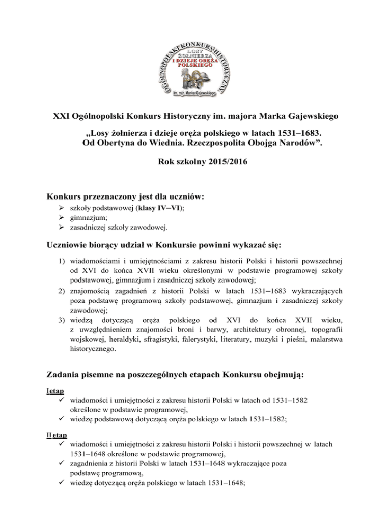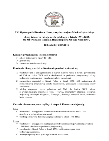 XXI Ogólnopolski Konkurs Historyczny im. majora Marka Gajewskiego „Losy żołnierza i dzieje oręża polskiego w latach 1531–1683. Od Obertyna do Wiednia. Rzeczpospolita Obojga Narodów”. Rok szkolny 2015/2016 Konkurs przeznaczony jest dla uczniów: szkoły podstawowej (klasy IV–VI); gimnazjum; zasadniczej szkoły zawodowej. Uczniowie biorący udział w Konkursie powinni wykazać się: 1) wiadomościami i umiejętnościami z zakresu historii Polski i historii powszechnej od XVI do końca XVII wieku określonymi w podstawie programowej szkoły podstawowej, gimnazjum i zasadniczej szkoły zawodowej; 2) znajomością zagadnień z historii Polski w latach 1531–1683 wykraczających poza podstawę programową szkoły podstawowej, gimnazjum i zasadniczej szkoły zawodowej; 3) wiedzą dotyczącą oręża polskiego od XVI do końca XVII wieku, z uwzględnieniem znajomości broni i barwy, architektury obronnej, topografii wojskowej, heraldyki, sfragistyki, falerystyki, literatury, muzyki i pieśni, malarstwa historycznego. Zadania pisemne na poszczególnych etapach Konkursu obejmują: I etap wiadomości i umiejętności z zakresu historii Polski w latach od 1531–1582 określone w podstawie programowej, wiedzę podstawową dotyczącą oręża polskiego w latach 1531–1582; II etap wiadomości i umiejętności z zakresu historii Polski i historii powszechnej w latach 1531–1648 określone w podstawie programowej, zagadnienia z historii Polski w latach 1531–1648 wykraczające poza podstawę programową, wiedzę dotyczącą oręża polskiego w latach 1531–1648; III etap wiadomości i umiejętności z zakresu historii Polski i historii powszechnej w latach 1531–1683 wykraczające poza podstawę programową, wiedzę dotyczącą oręża polskiego w latach 1531–1683. Zalecana literatura Atlas historii Polski. Mapy, komentarze, Warszawa 2000. Encyklopedia szkolna. Historia, Warszawa 1993. Kobyliński, S. Gawędy o broni i mundurze, Warszawa 1984. Nowak T. Wimmer J., Historia oręża polskiego 963–1795, Warszawa 1981. Podhorodecki L., Sławne bitwy Polaków, Warszawa 1997. Podhorodecki L., Rapier i koncerz, Z dziejów wojen polsko-szwedzkich, Warszawa 1985. Samsonowicz H., Historia Polski do roku 1795, Warszawa 1990. Wacholc M., Śpiewnik polski. Wybór pieśni, Warszawa 1995. Wielki atlas historyczny, Warszawa 2002. Wołek J., Dzieje Polski w malarstwie i poezji, Warszawa 1991. Seria wydawnicza Dzieje narodu i państwa polskiego Wyczański A., Dogonić Europę, II–20, Kraków 1987. Sucheni-Grbowska A., Spory królów ze szlachtą w złotym wieku, II–21, Kraków 1988. Płaza S., Wielkie bezkrólewia, II–22, Kraków 1988. Grzybowski S., Król i kanclerz, II–23, Kraków 1988. Wisner H., Rokosz Zebrzydowskiego, II–24, Kraków 1989. Żygulski Z. jun., Hetmani Rzeczypospolitej, II–25, Kraków 1994. Grzybowski S., Sarmatyzm, II–26, Warszawa 1996. Wójcik Z., Wojny kozackie w dawnej Polce, II–27, Kraków 1989. Wójcik Z., Liberum veto, II–28, Kraków 1992. Urban W., Epizod reformacyjny, II–30, Kraków 1988. Żygulski Z. jun., Odsiecz Wiednia 1683, II–32, Kraków 1994. Organizatorzy Konkursu