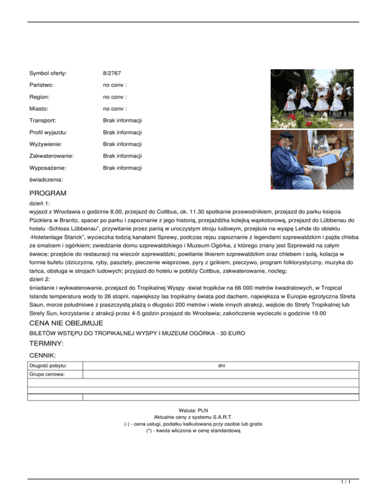 Symbol oferty: 8/2767 Państwo: no conv : Region: no conv : Miasto: no conv : Transport: Brak informacji Profil wyjazdu: Brak informacji Wyżywienie: Brak informacji Zakwaterowanie: Brak informacji Wyposażenie: Brak informacji świadczenia: PROGRAM dzień 1: wyjazd z Wrocławia o godzinie 8.00, przejazd do Cottbus, ok. 11.30 spotkanie przewodnikiem, przejazd do parku księcia Pücklera w Branitz, spacer po parku i zapoznanie z jego historią, przejażdżka kolejką wąskotorową, przejazd do Lübbenau do hotelu -Schloss Lübbenau”, przywitanie przez panią w uroczystym stroju ludowym, przejście na wyspę Lehde do obiektu -Hotelanlage Starick”, wycieczka łodzią kanałami Sprewy, podczas rejsu zapoznanie z legendami szprewaldzkim i pajda chleba ze smalcem i ogórkiem; zwiedzanie domu szprewaldzkiego i Muzeum Ogórka, z którego znany jest Szprewald na całym świece; przejście do restauracji na wieczór szprewaldzki, powitanie likierem szprewaldzkim oraz chlebem i solą, kolacja w formie bufetu (dziczyzna, ryby, pasztety, pieczenie wieprzowe, pyry z gzikiem, pieczywo, program folklorystyczny, muzyka do tańca, obsługa w strojach ludowych; przyjazd do hotelu w pobliży Cottbus, zakwaterowanie, nocleg; dzień 2: śniadanie i wykwaterowanie, przejazd do Tropikalnej Wyspy -świat tropików na 66 000 metrów kwadratowych, w Tropical Islands temperatura wody to 26 stopni, największy las tropikalny świata pod dachem, największa w Europie egzotyczna Strefa Saun, morze południowe z piaszczystą plażą o długości 200 metrów i wiele innych atrakcji, wejście do Strefy Tropikalnej lub Strefy Sun, korzystanie z atrakcji przez 4-5 godzin przejazd do Wrocławia; zakończenie wycieczki o godzinie 19.00 CENA NIE OBEJMUJE BILETÓW WSTĘPU DO TROPIKALNEJ WYSPY I MUZEUM OGÓRKA - 30 EURO TERMINY: CENNIK: Długość pobytu: dni Grupa cenowa: Waluta: PLN Aktualne ceny z systemu S.A.R.T. (-) - cena usługi, podatku kalkulowana przy osobie lub gratis (*) - kwota wliczona w cenę standardową 1/1